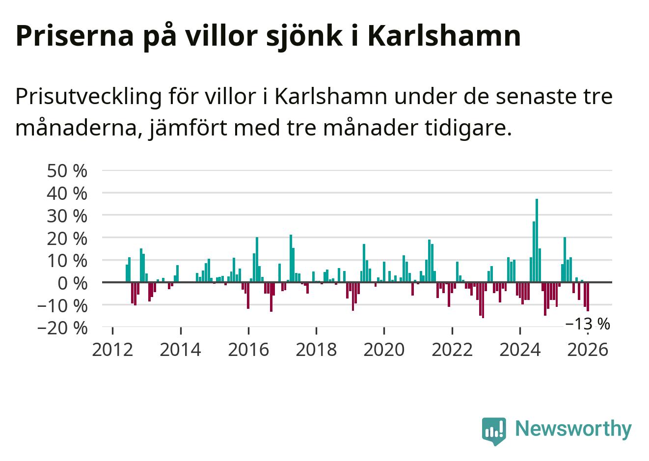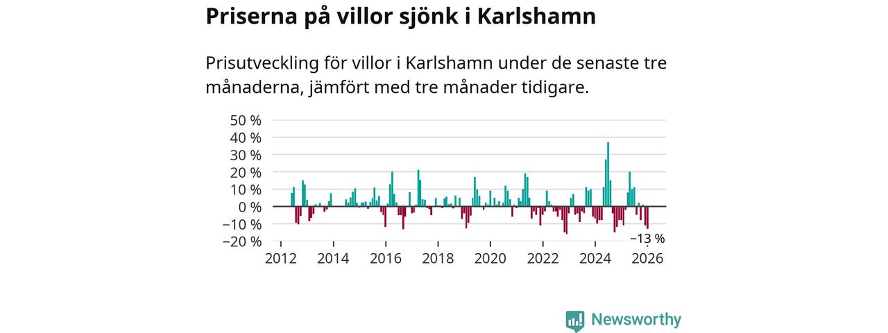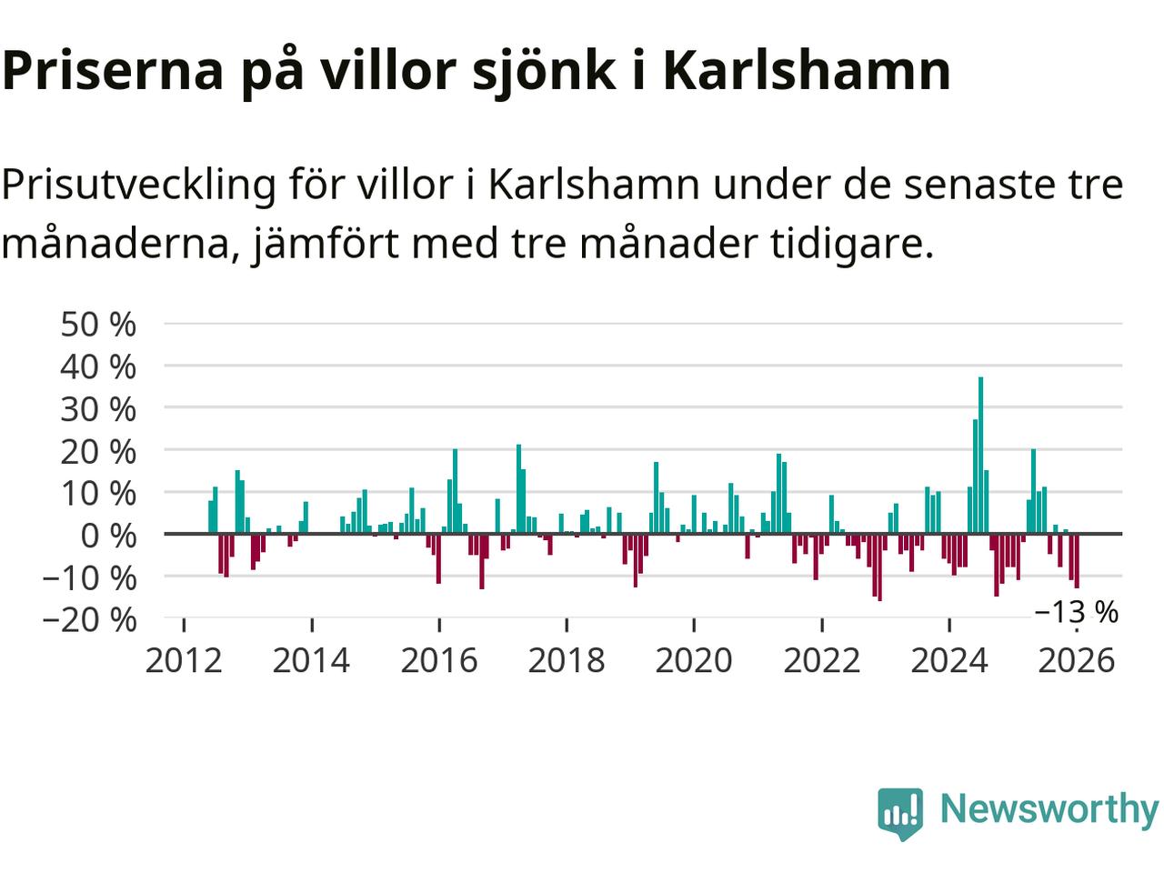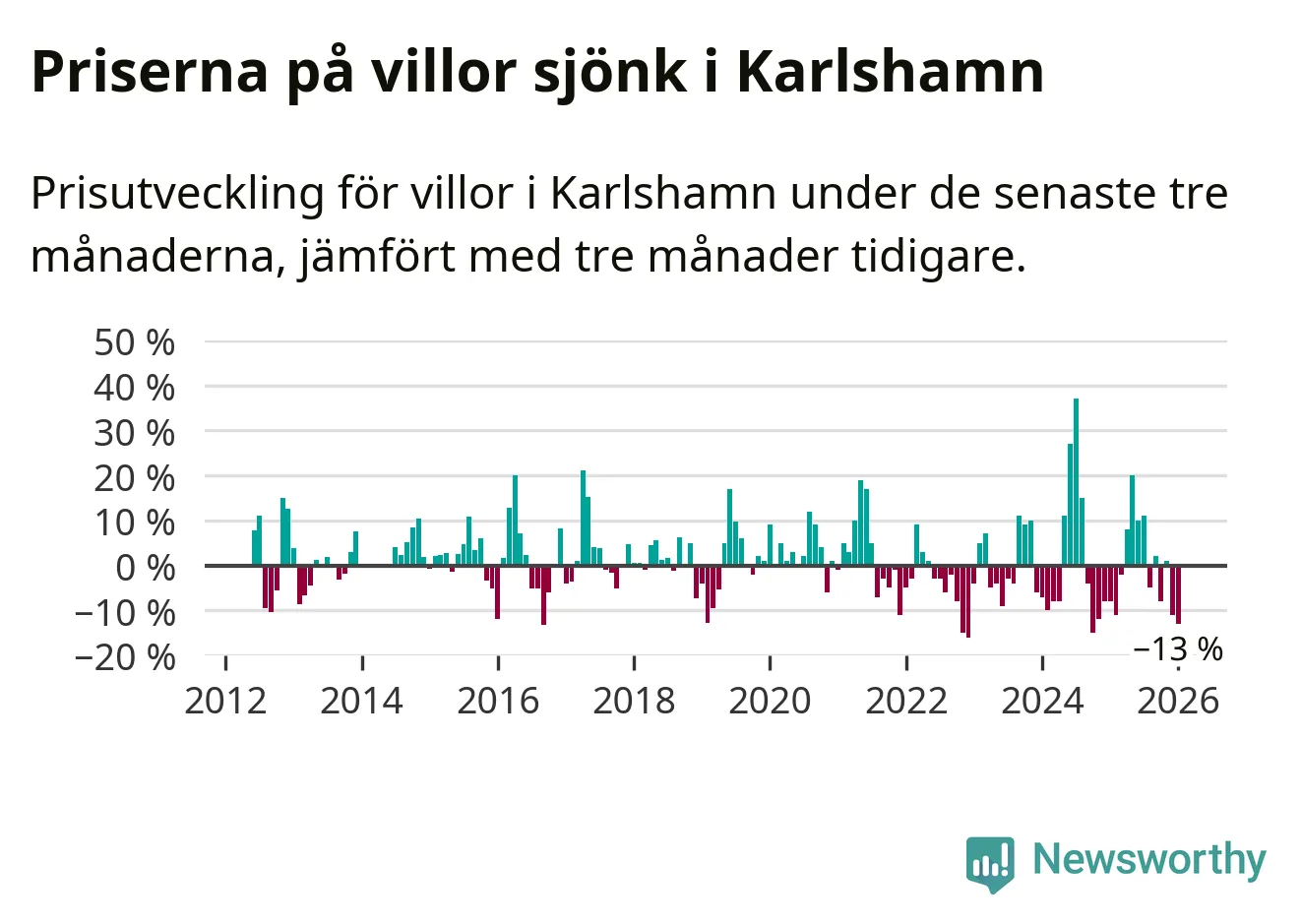 Villapriserna sjönk mellan november och januari med 13 procent i Karlshamns kommun. Det är en betydande nedgång jämfört med det gångna året då priserna i snitt stått stilla.