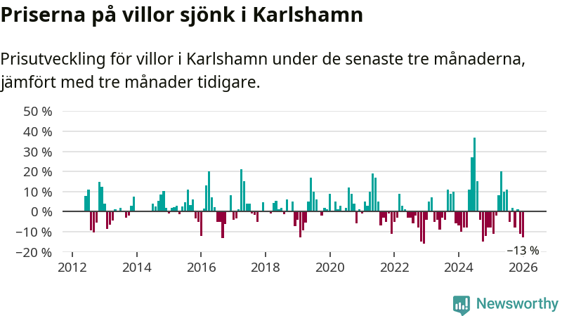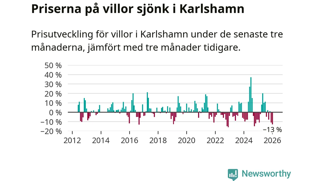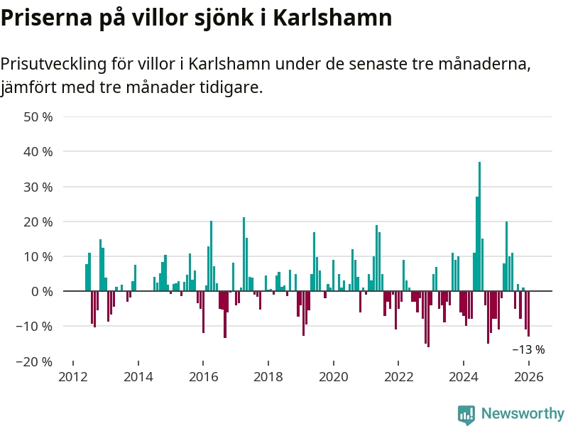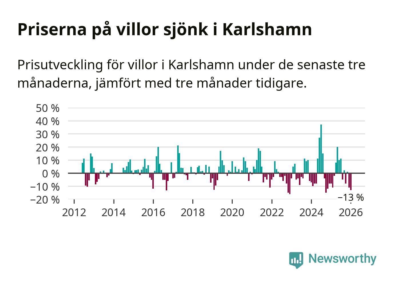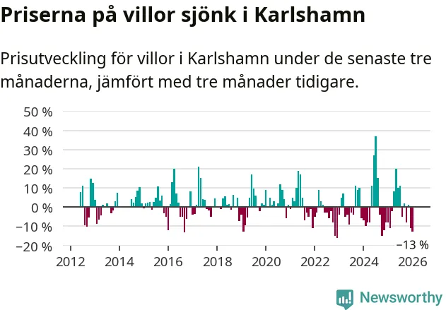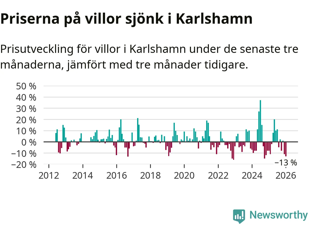 Villapriserna sjönk mellan november och januari med 13 procent i Karlshamns kommun. Det är en betydande nedgång jämfört med det gångna året då priserna i snitt stått stilla.