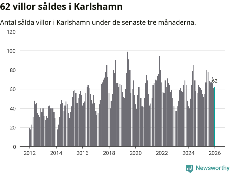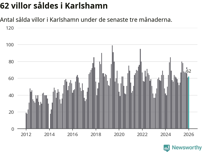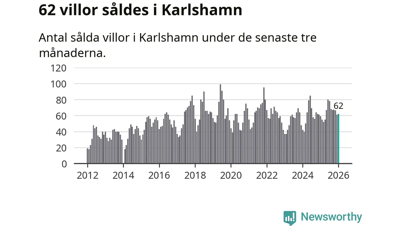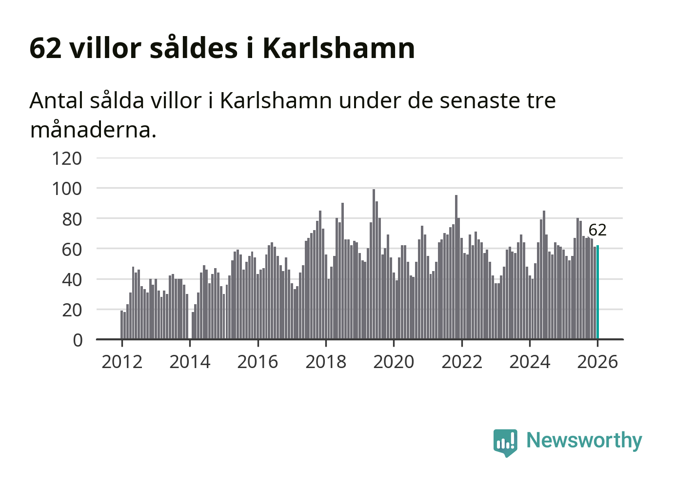 Sammanlagt såldes 62 villor i Karlshamns kommun mellan november och januari till ett genomsnittligt pris på 1,9 miljoner kronor. I fjol gjordes 59 affärer vid den här tiden på året.