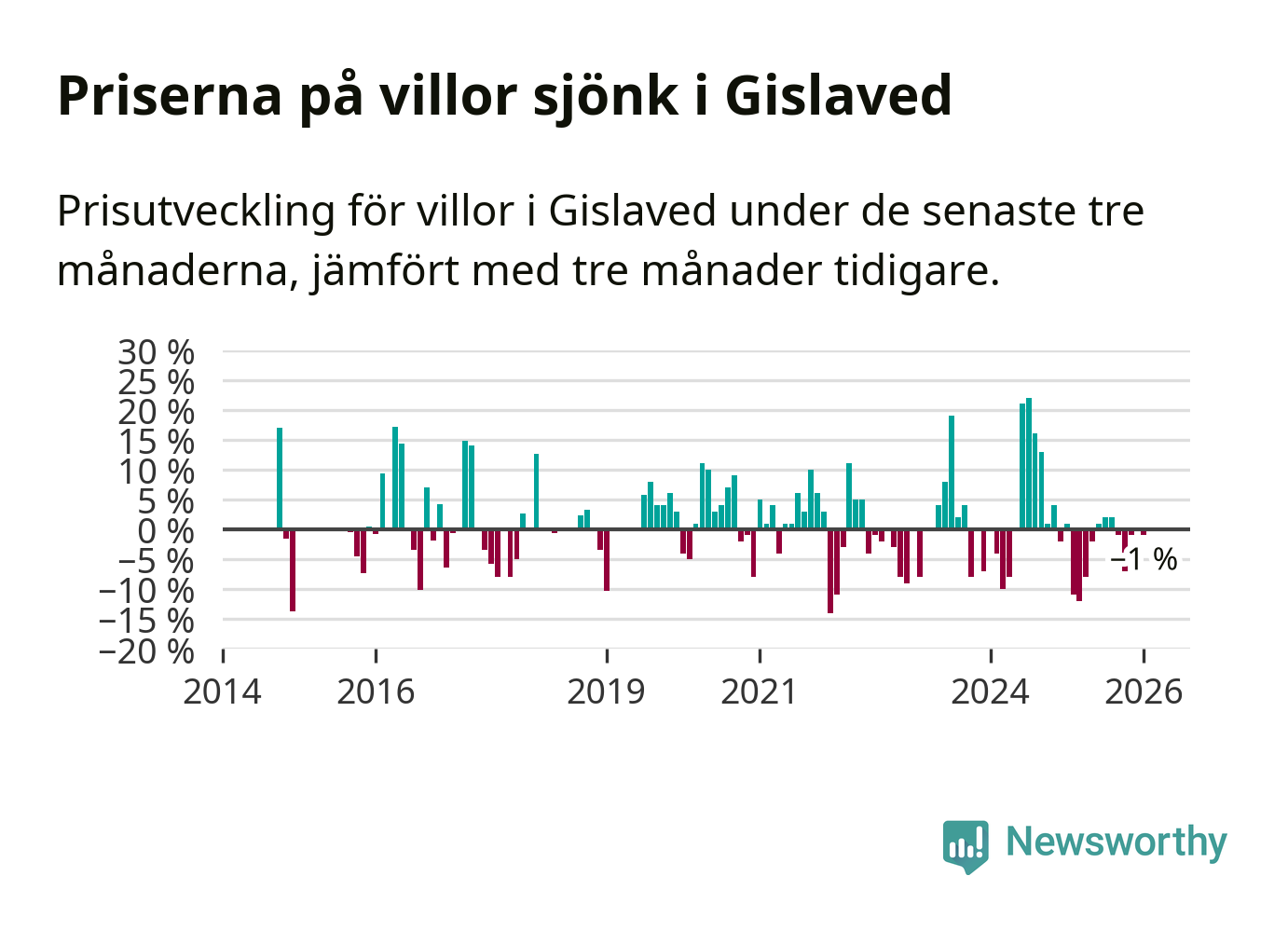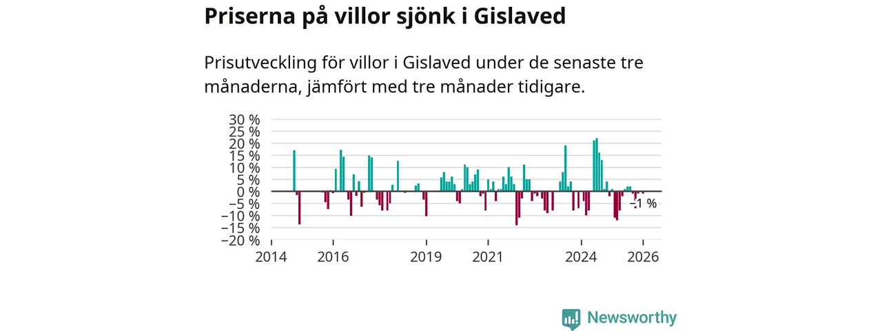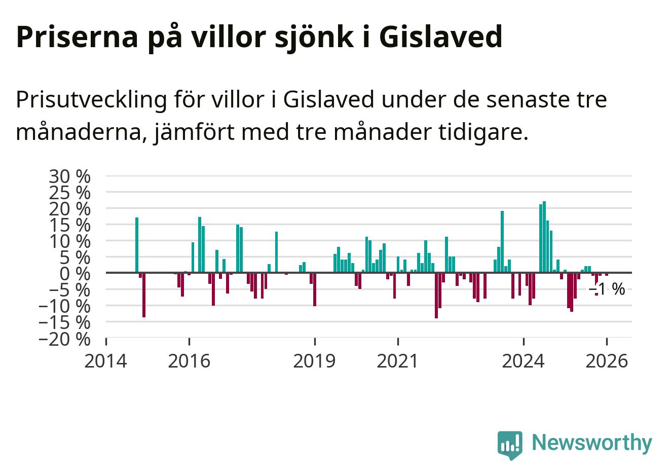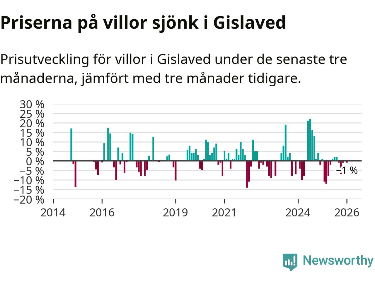 Villapriserna har gått ner i Gislaveds kommun. Medelpriset på försäljningarna under de senaste tre månaderna visar på en nedgång med 1 procent.