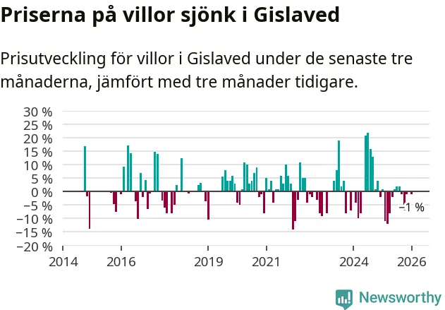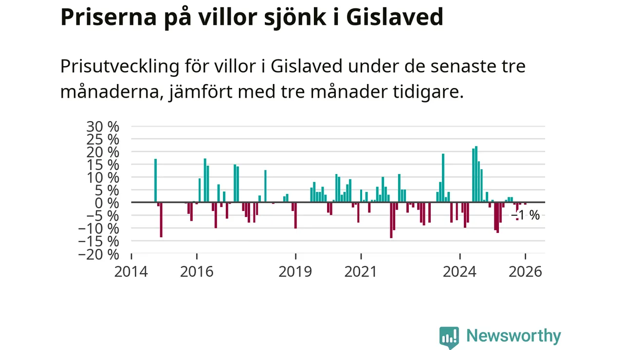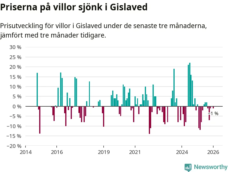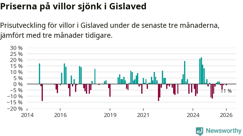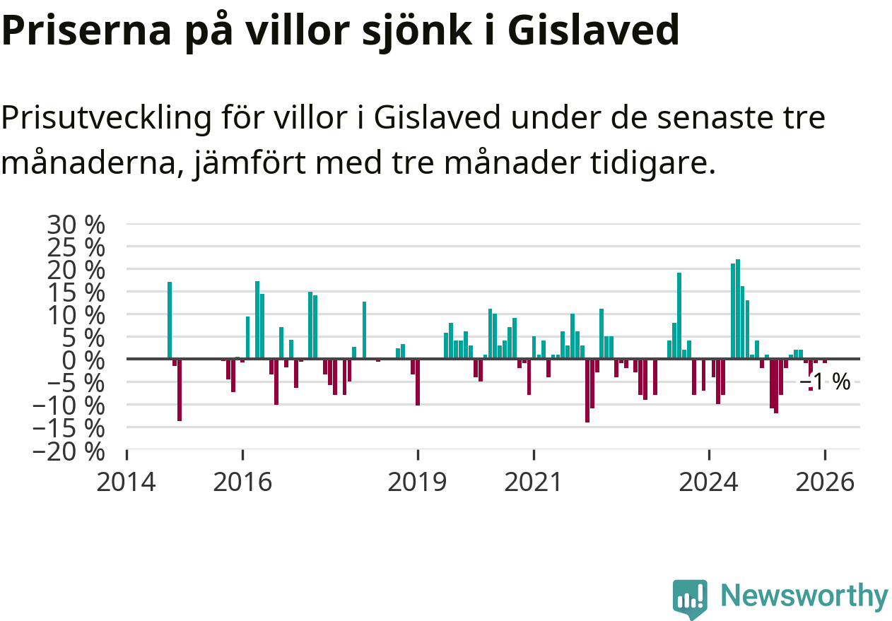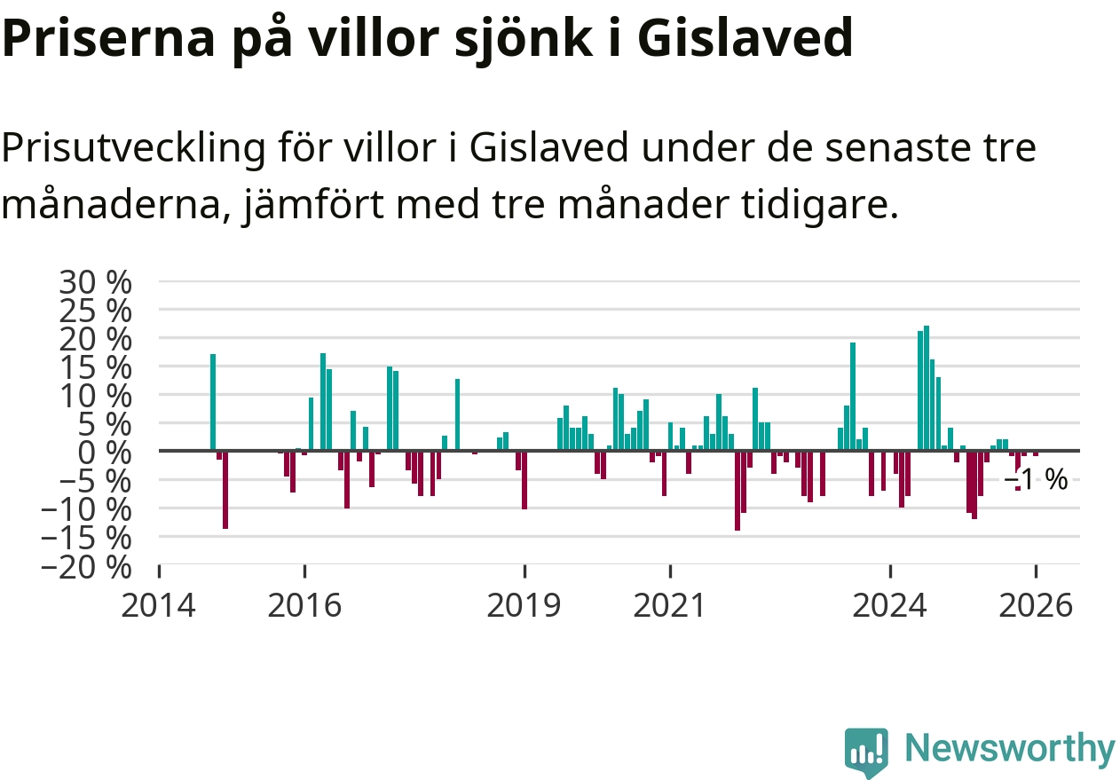 Villapriserna har gått ner i Gislaveds kommun. Medelpriset på försäljningarna under de senaste tre månaderna visar på en nedgång med 1 procent.