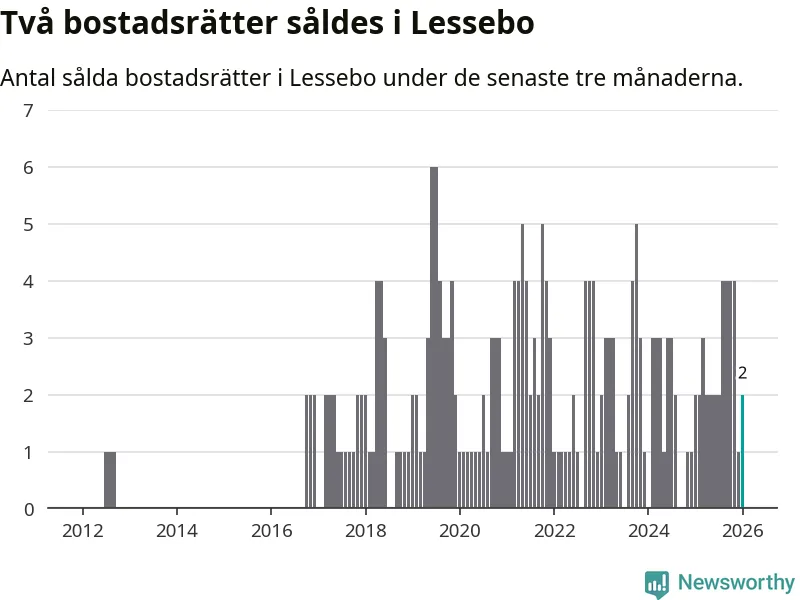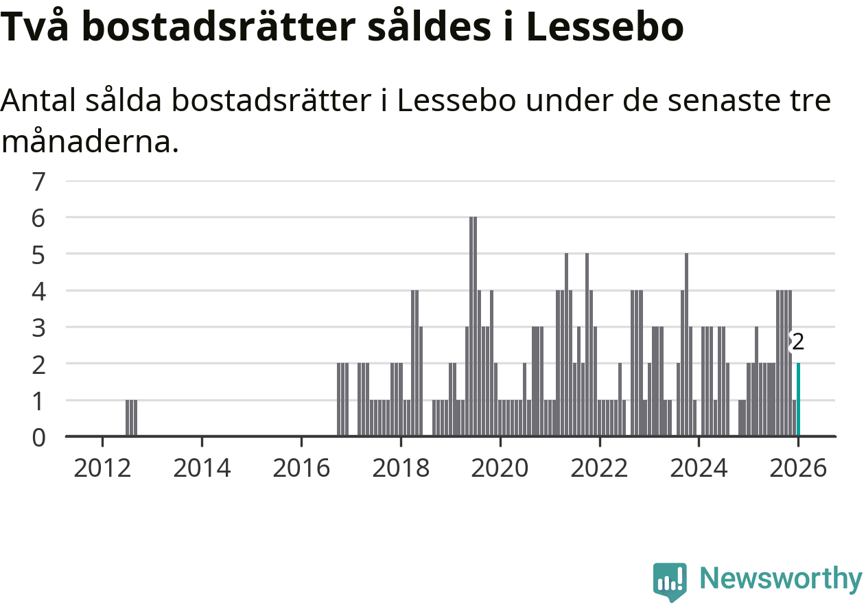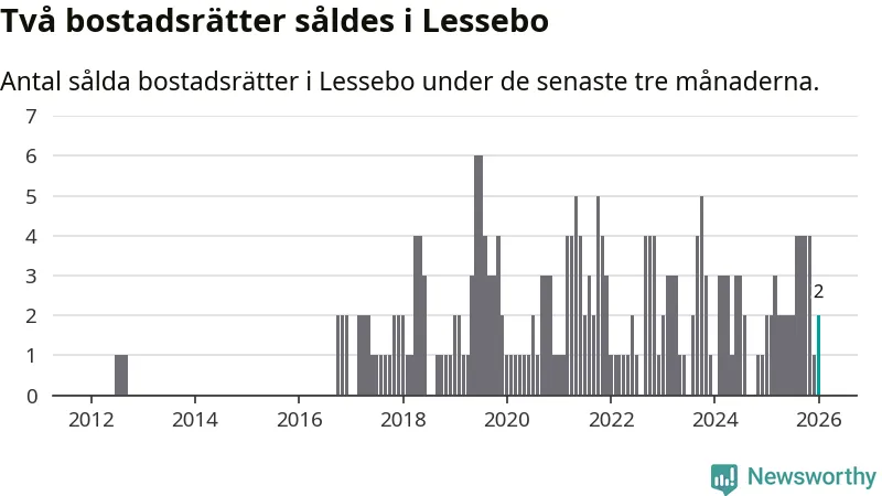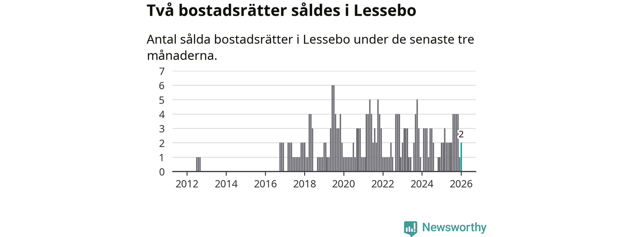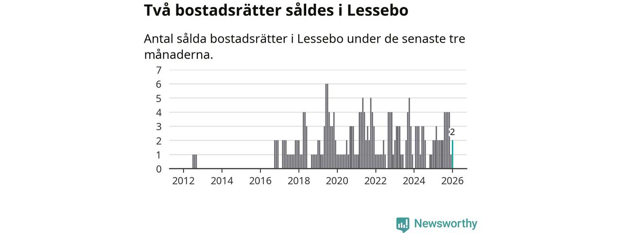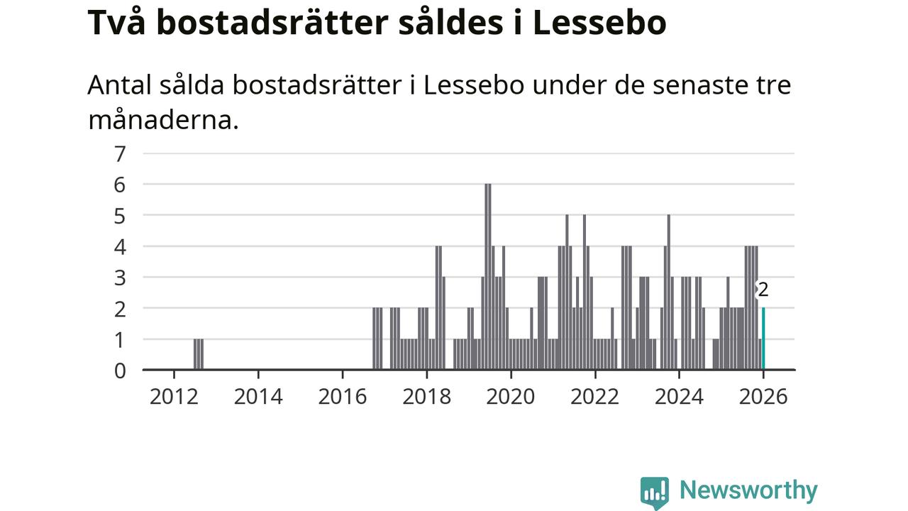 Mellan november och januari gjordes sammanlagt två affärer med bostadsrätter i Lessebo kommun. Det är lika många affärer som vid motsvarande tid i fjol.