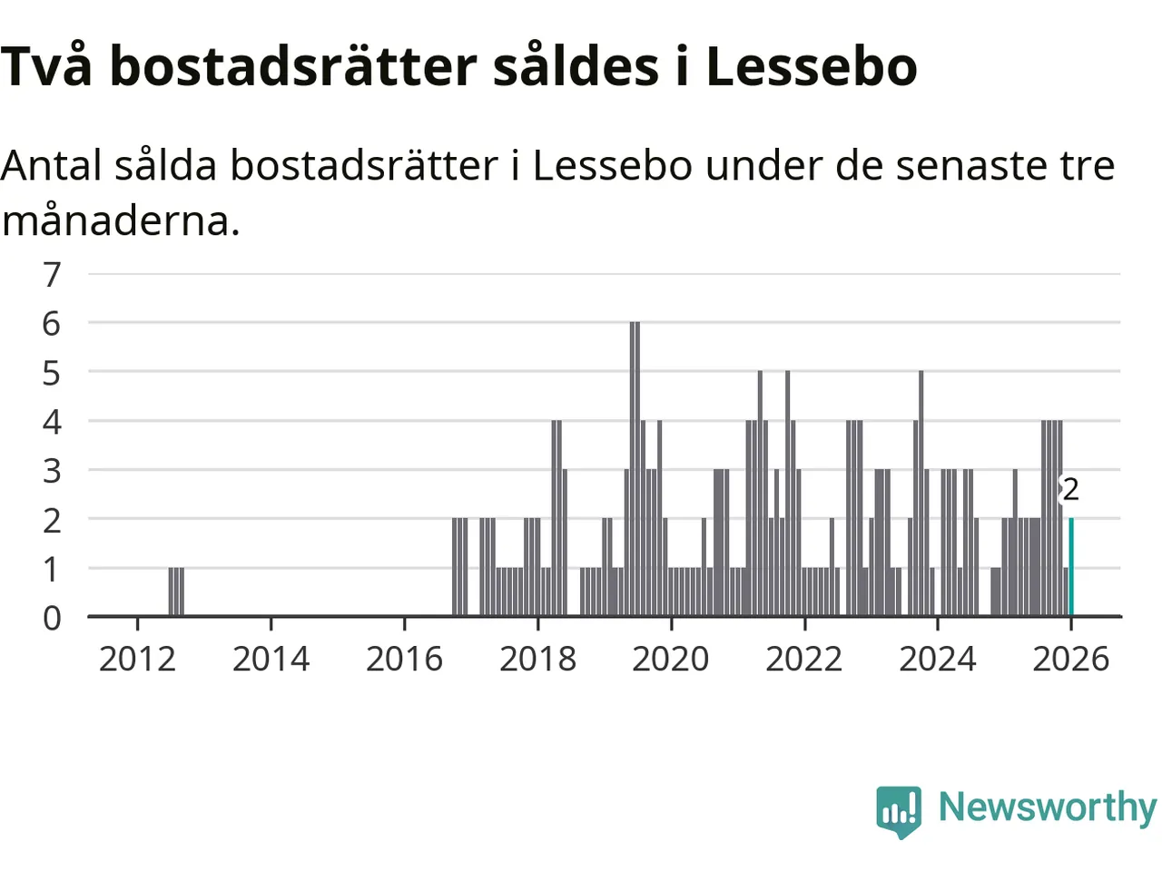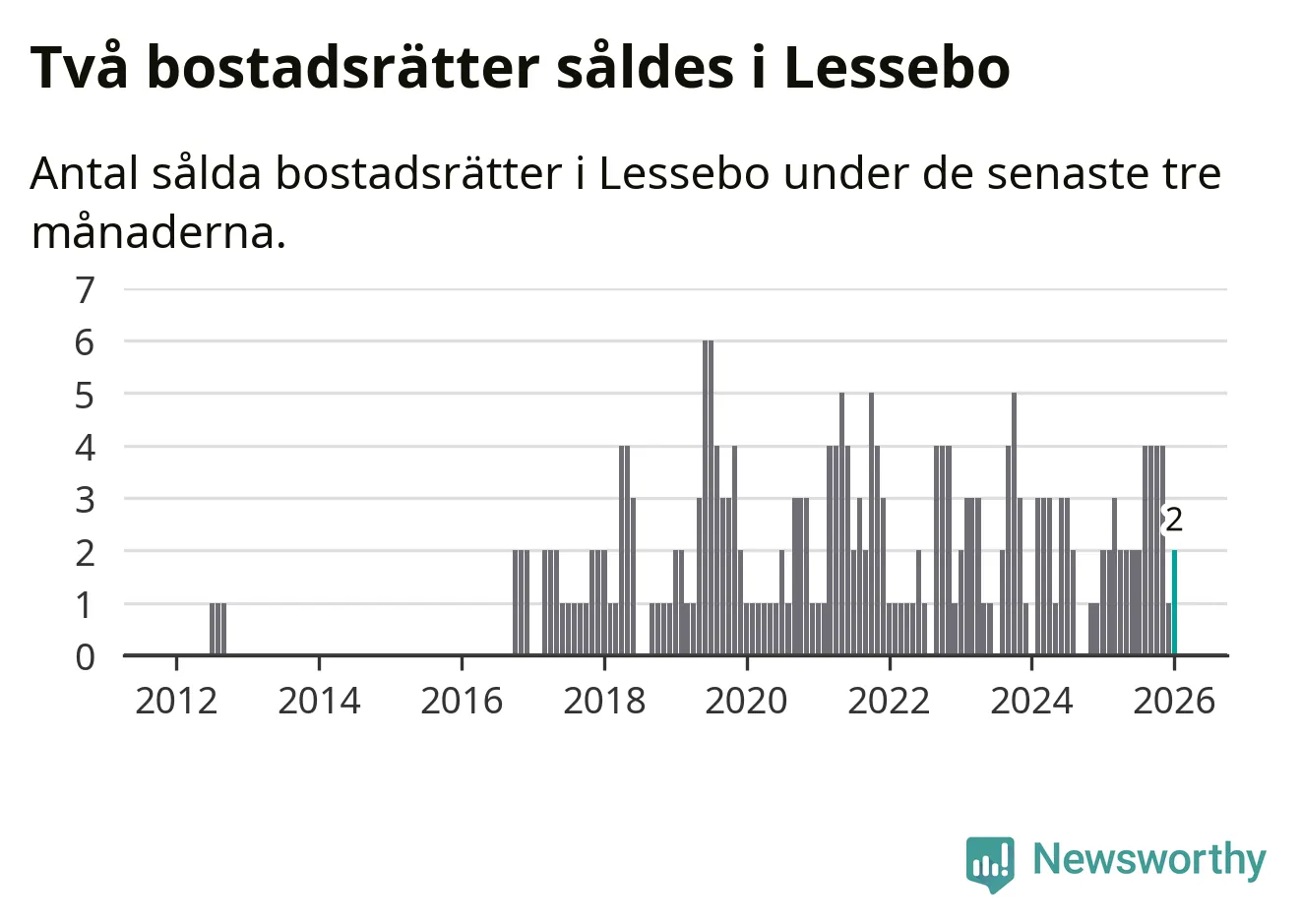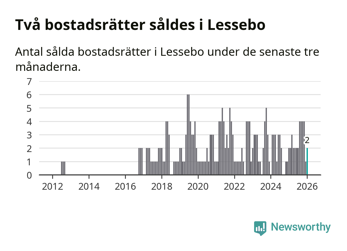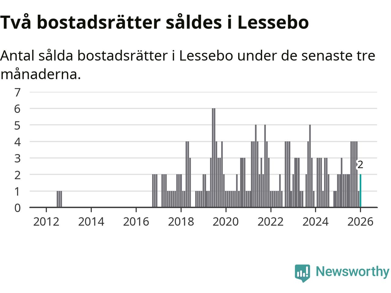Mellan november och januari gjordes sammanlagt två affärer med bostadsrätter i Lessebo kommun. Det är lika många affärer som vid motsvarande tid i fjol.