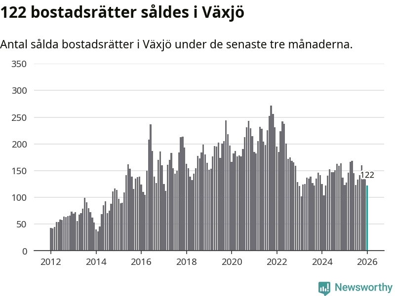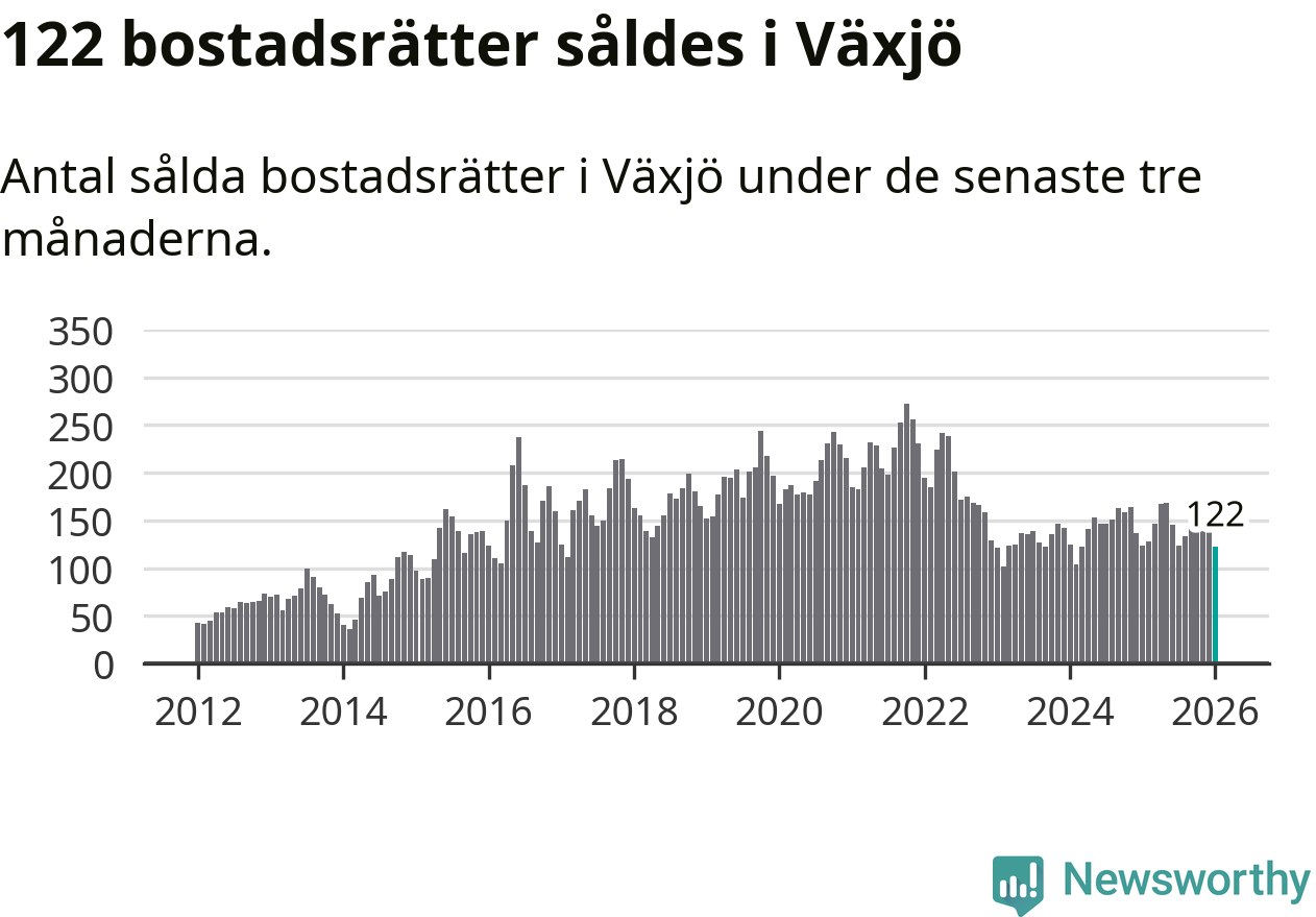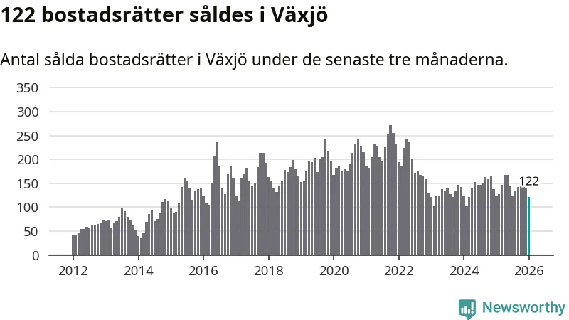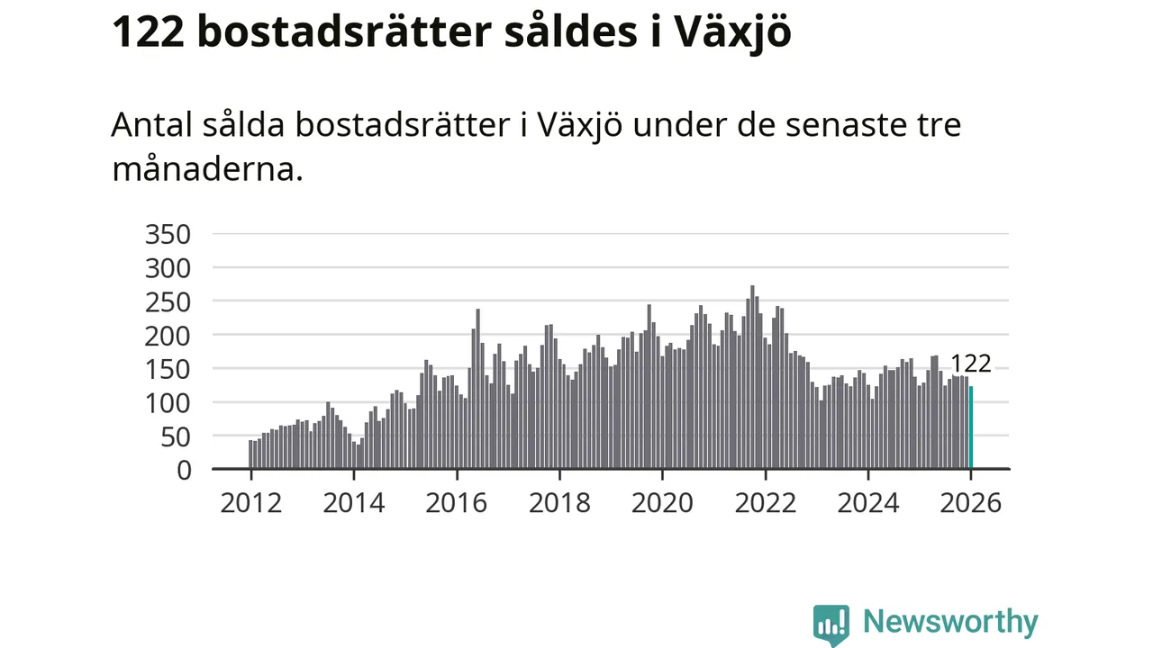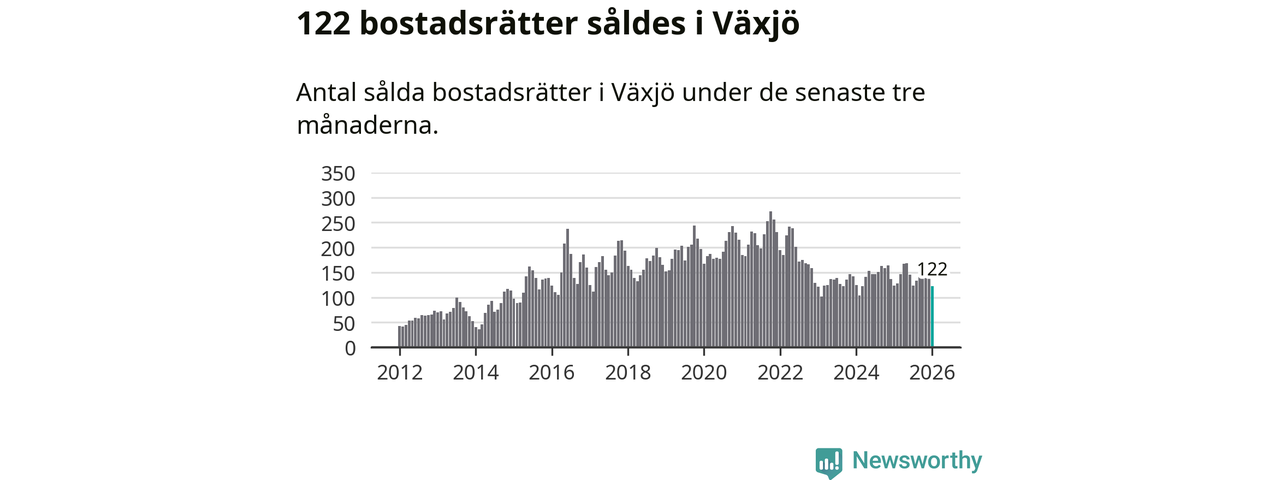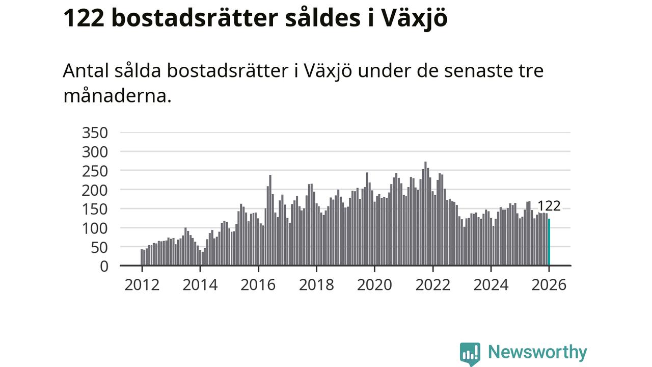 Sammanlagt såldes 122 bostadsrätter i Växjö kommun mellan november och januari till ett genomsnittligt pris på 1,9 miljoner kronor. I fjol gjordes 123 affärer vid den här tiden på året.