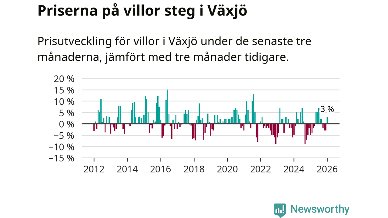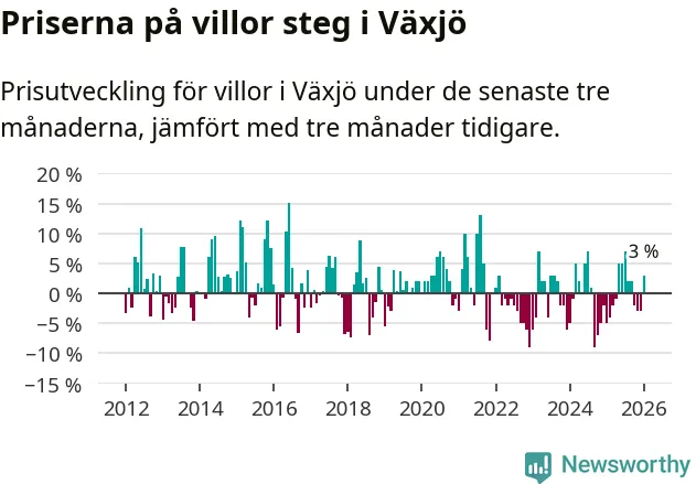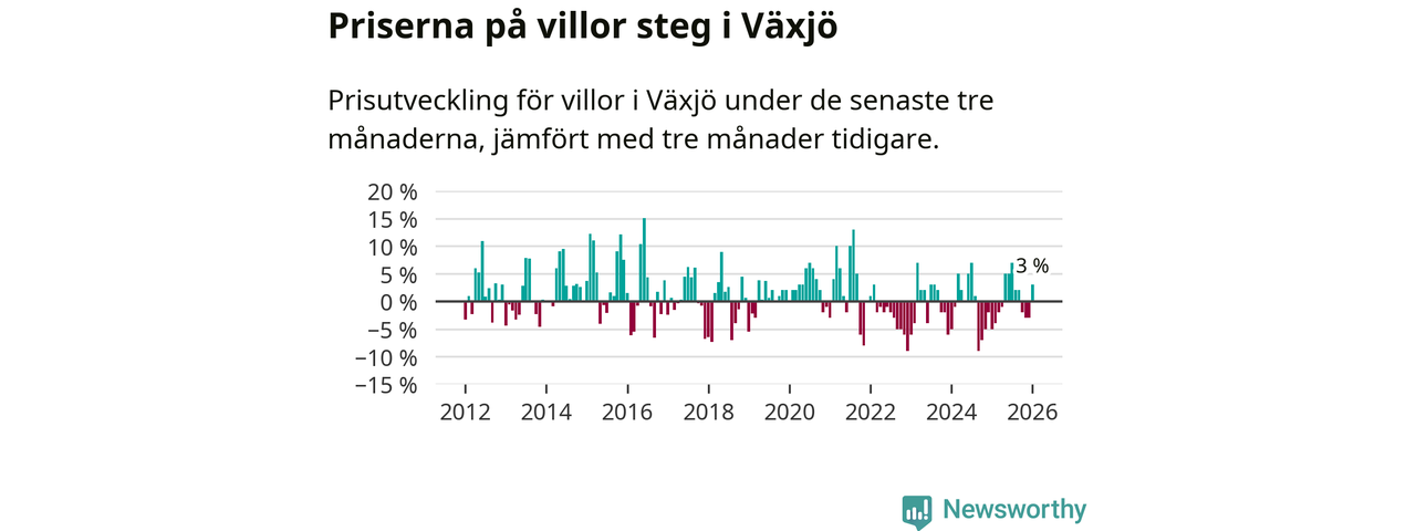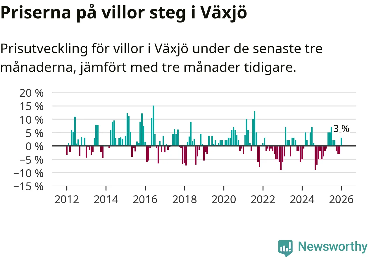 Villapriserna har gått upp i Växjö kommun. Medelpriset på försäljningarna under de senaste tre månaderna visar på en uppgång med 3 procent.