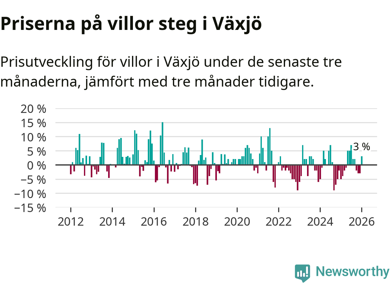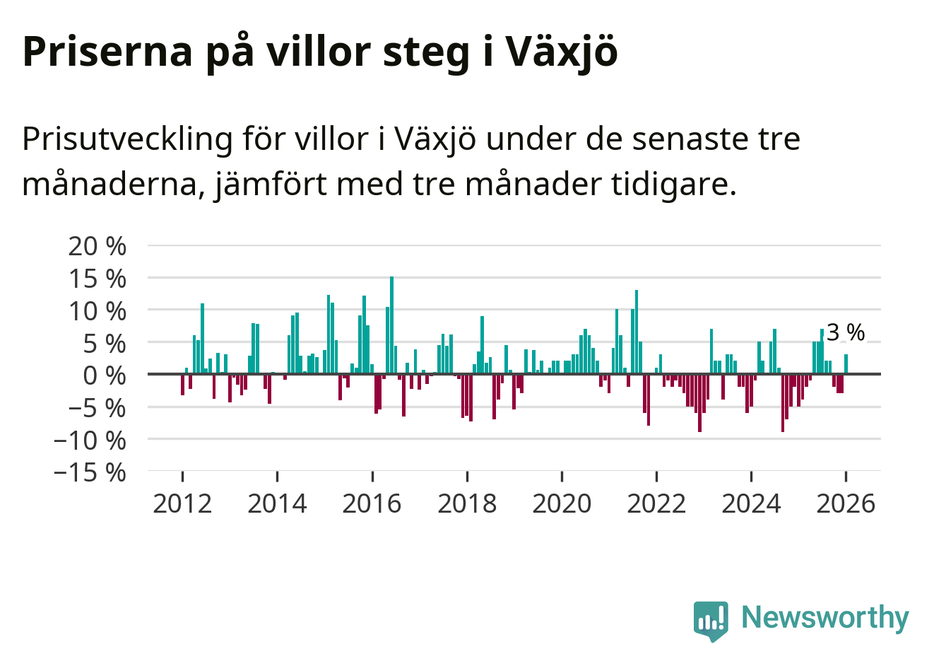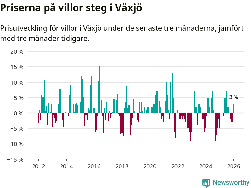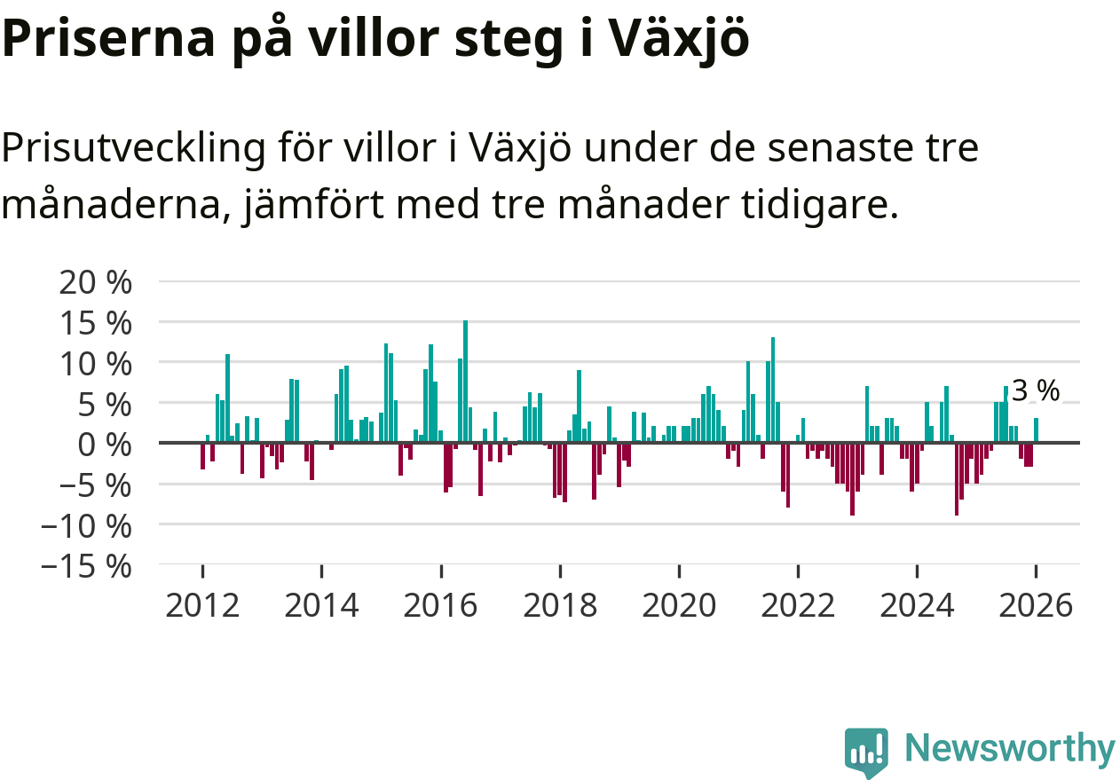 Villapriserna har gått upp i Växjö kommun. Medelpriset på försäljningarna under de senaste tre månaderna visar på en uppgång med 3 procent.