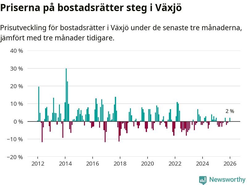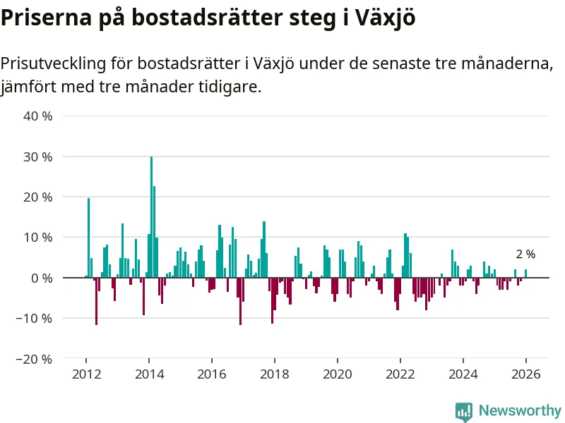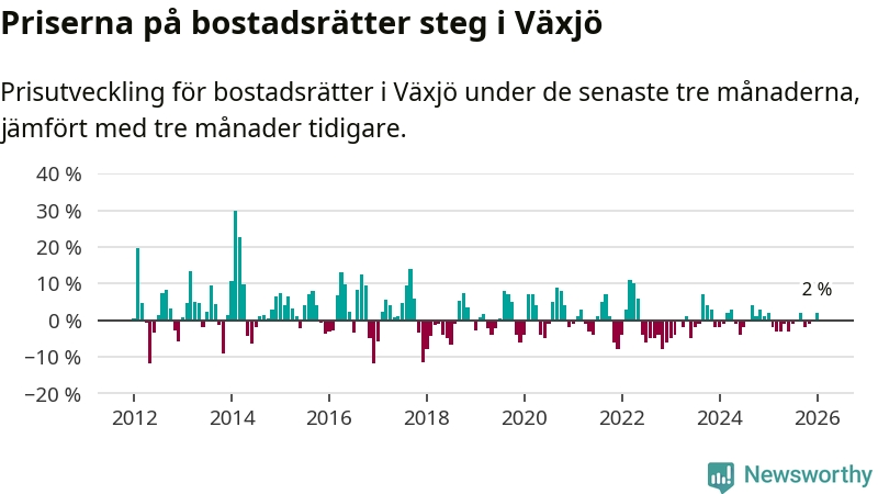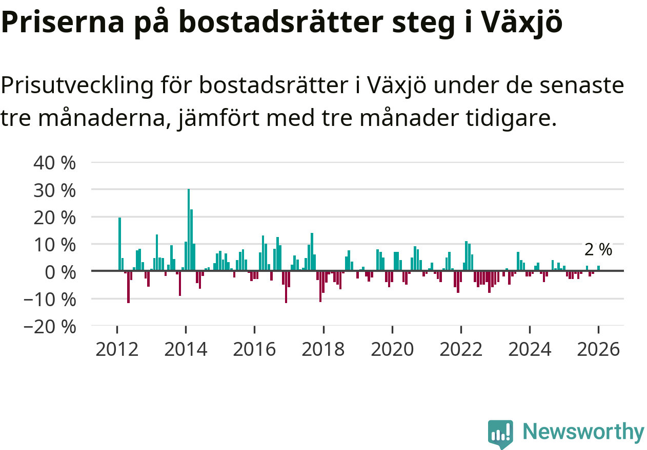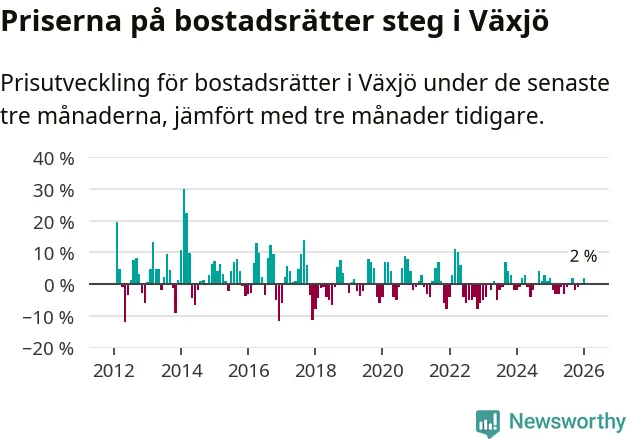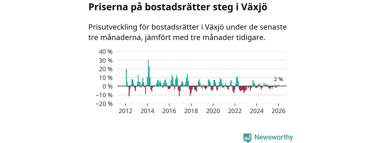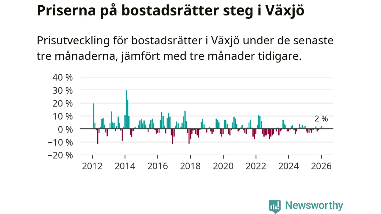 Priserna på bostadsrätter har gått upp i Växjö kommun. Medelpriset på försäljningarna under de senaste tre månaderna visar på en uppgång med 2 procent.