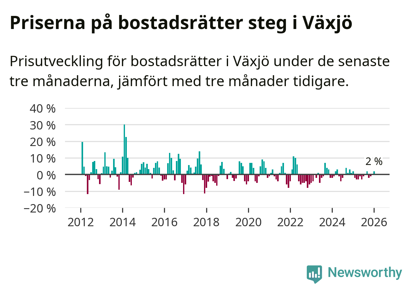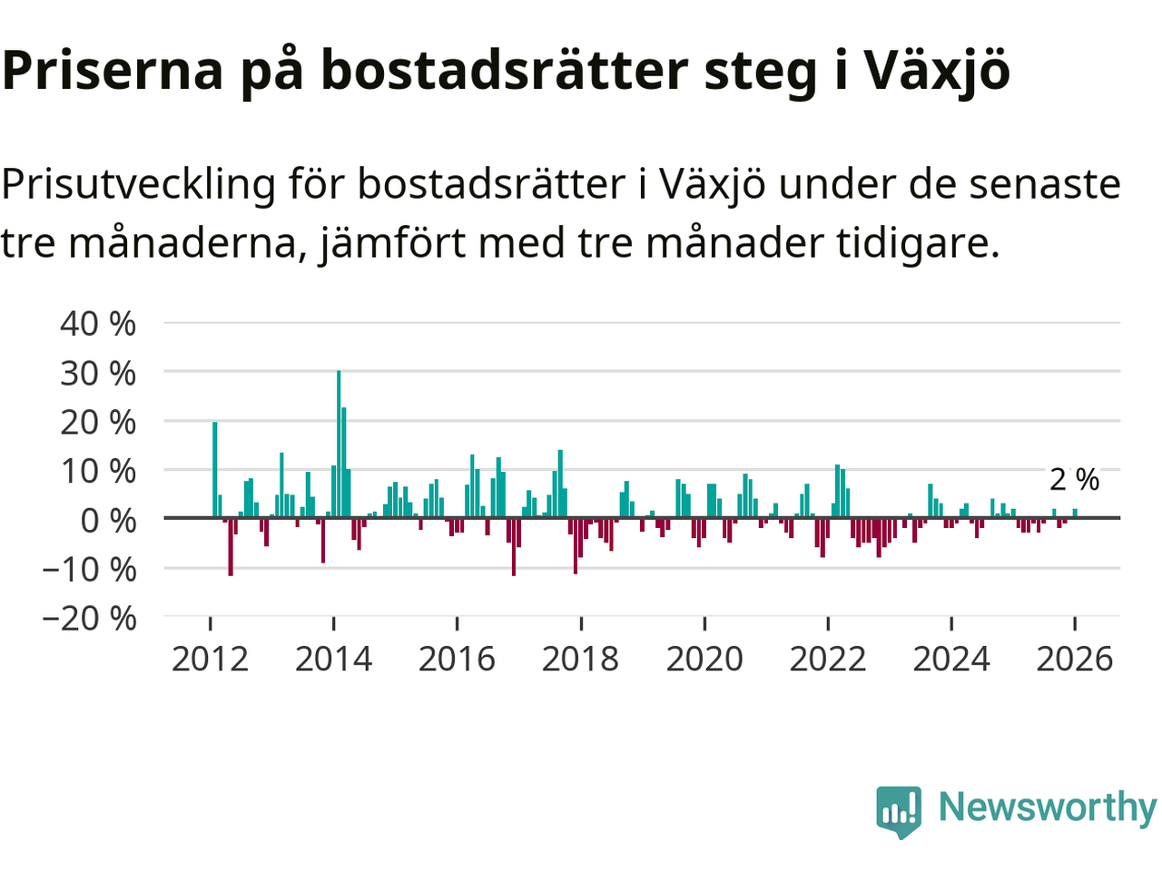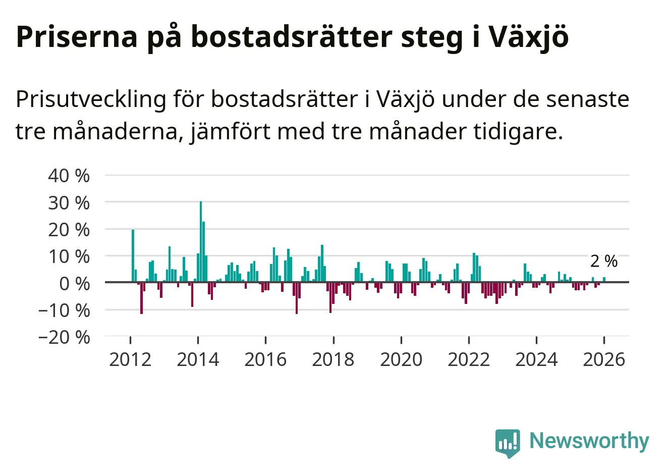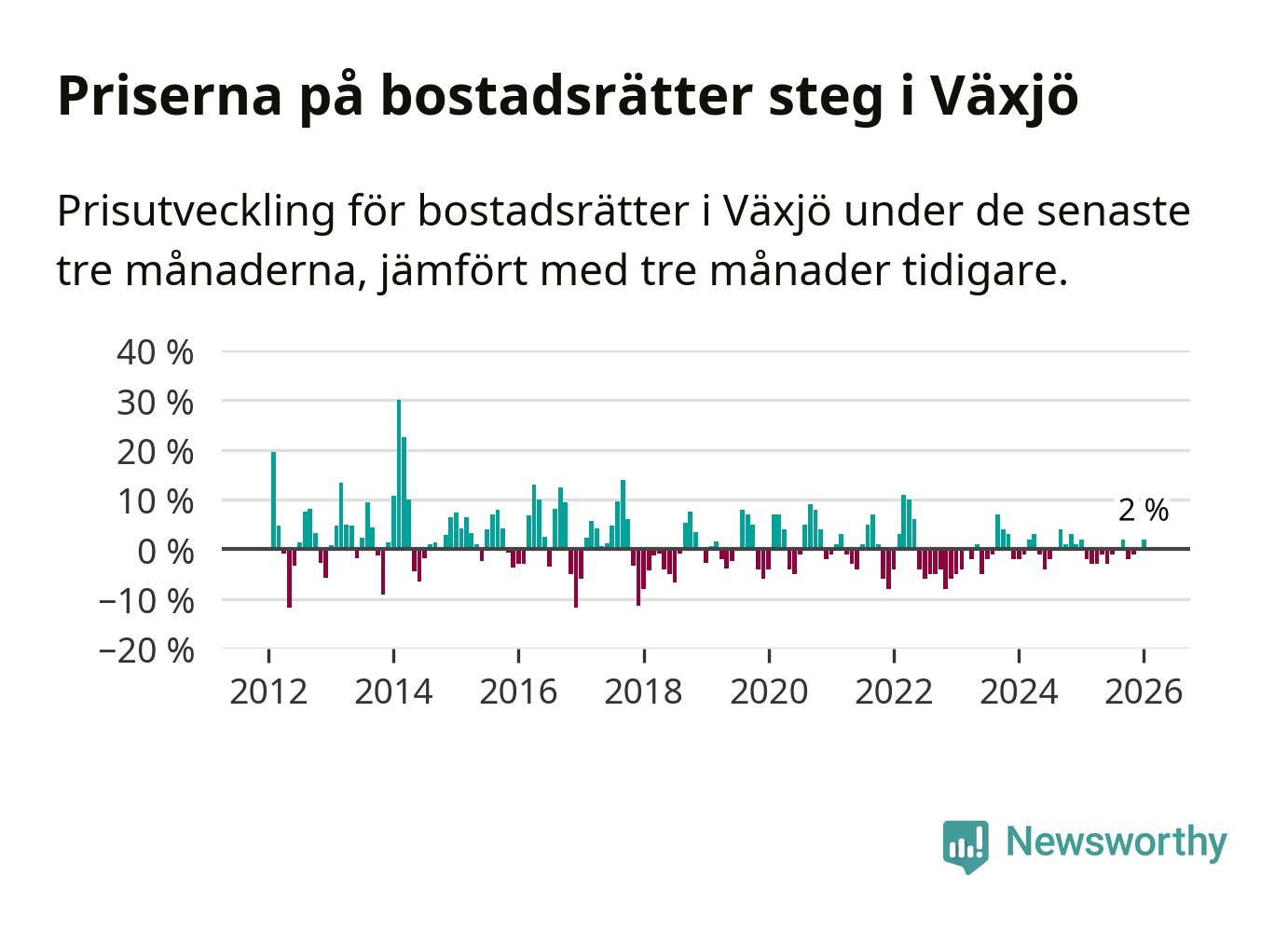 Priserna på bostadsrätter har gått upp i Växjö kommun. Medelpriset på försäljningarna under de senaste tre månaderna visar på en uppgång med 2 procent.