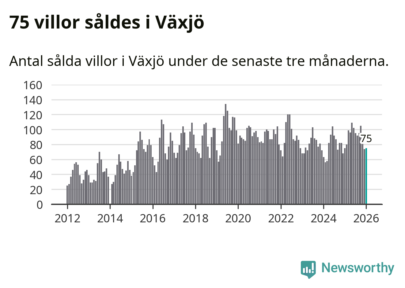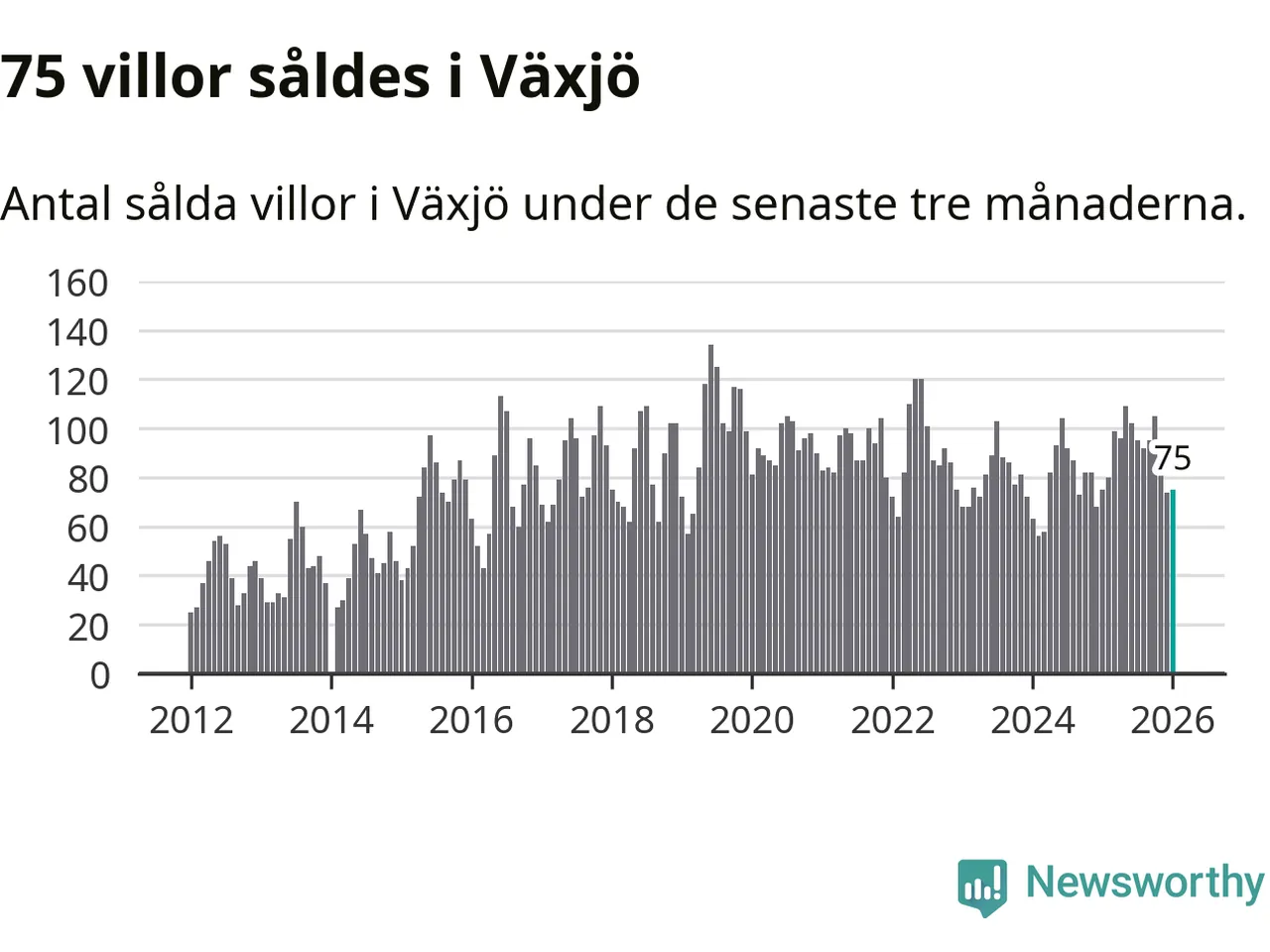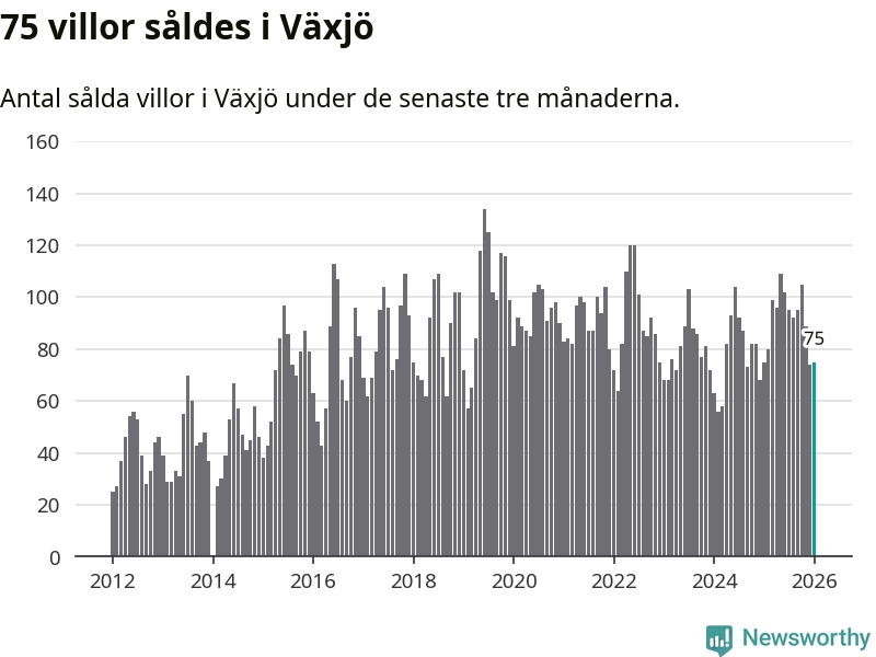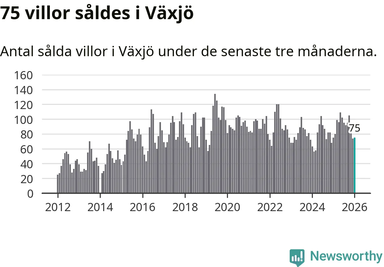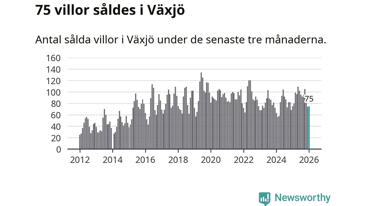 Sammanlagt såldes 75 villor i Växjö kommun mellan november och januari till ett genomsnittligt pris på 3,4 miljoner kronor. I fjol gjordes 75 affärer vid den här tiden på året.
