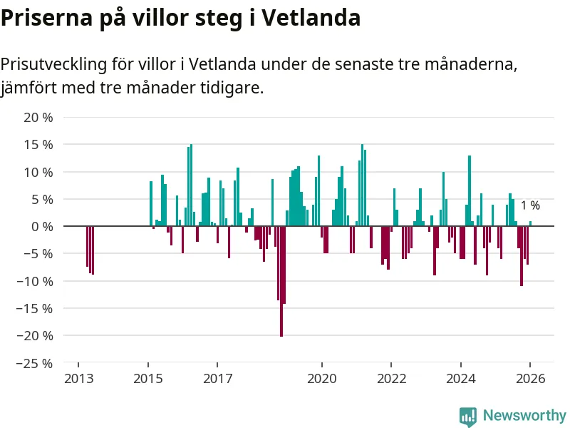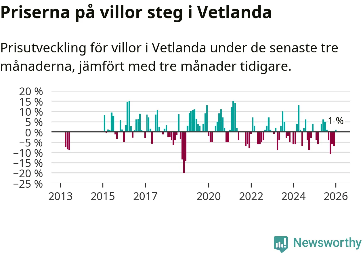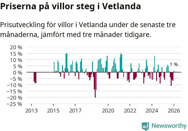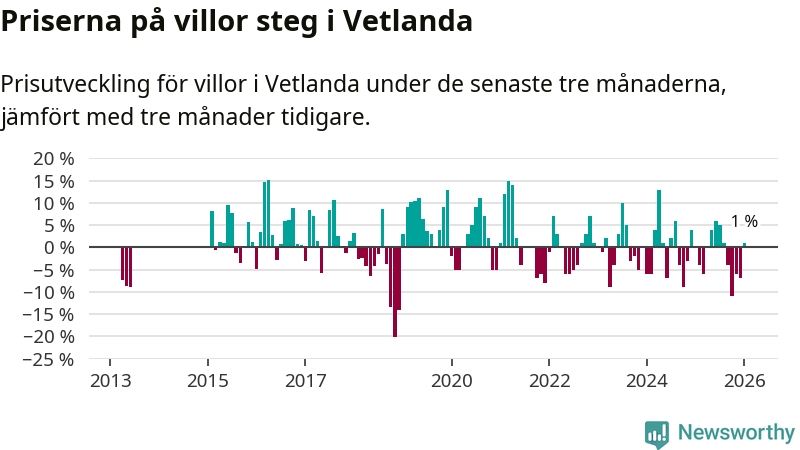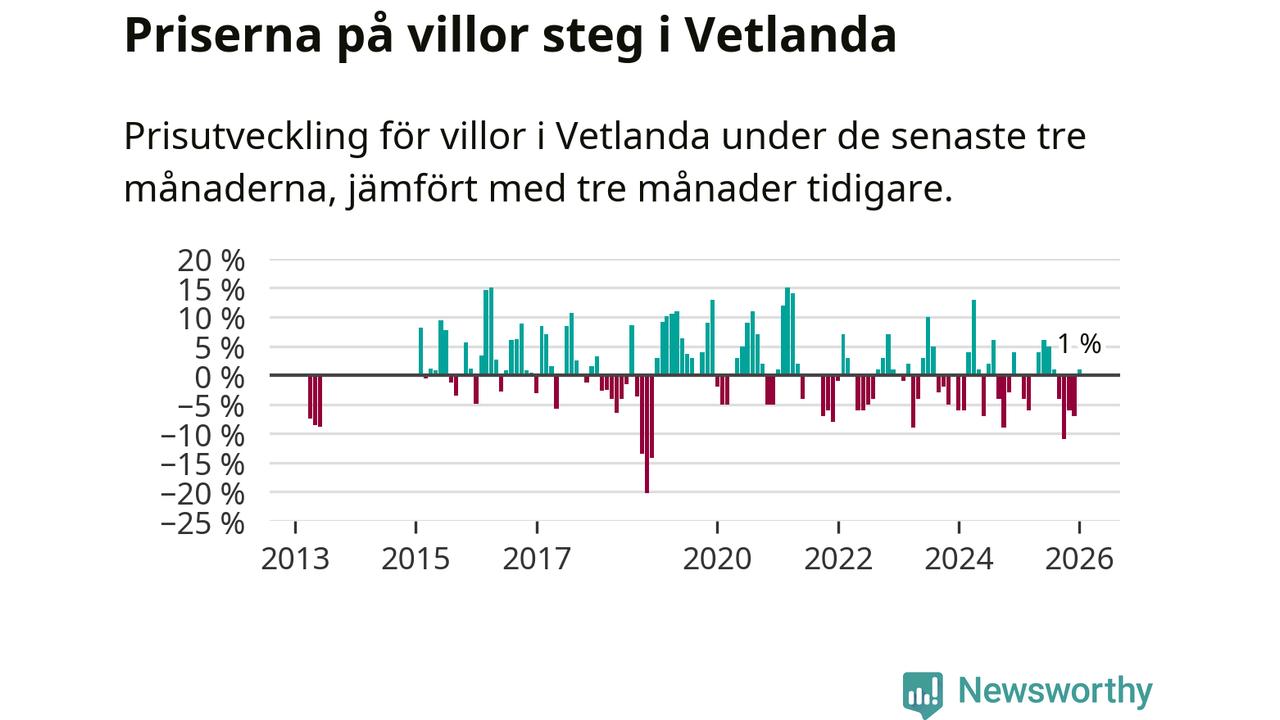 Villapriserna har gått upp i Vetlanda kommun. Medelpriset på försäljningarna under de senaste tre månaderna visar på en uppgång med 1 procent.