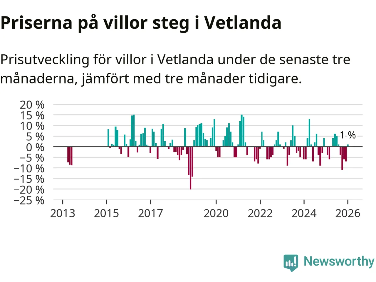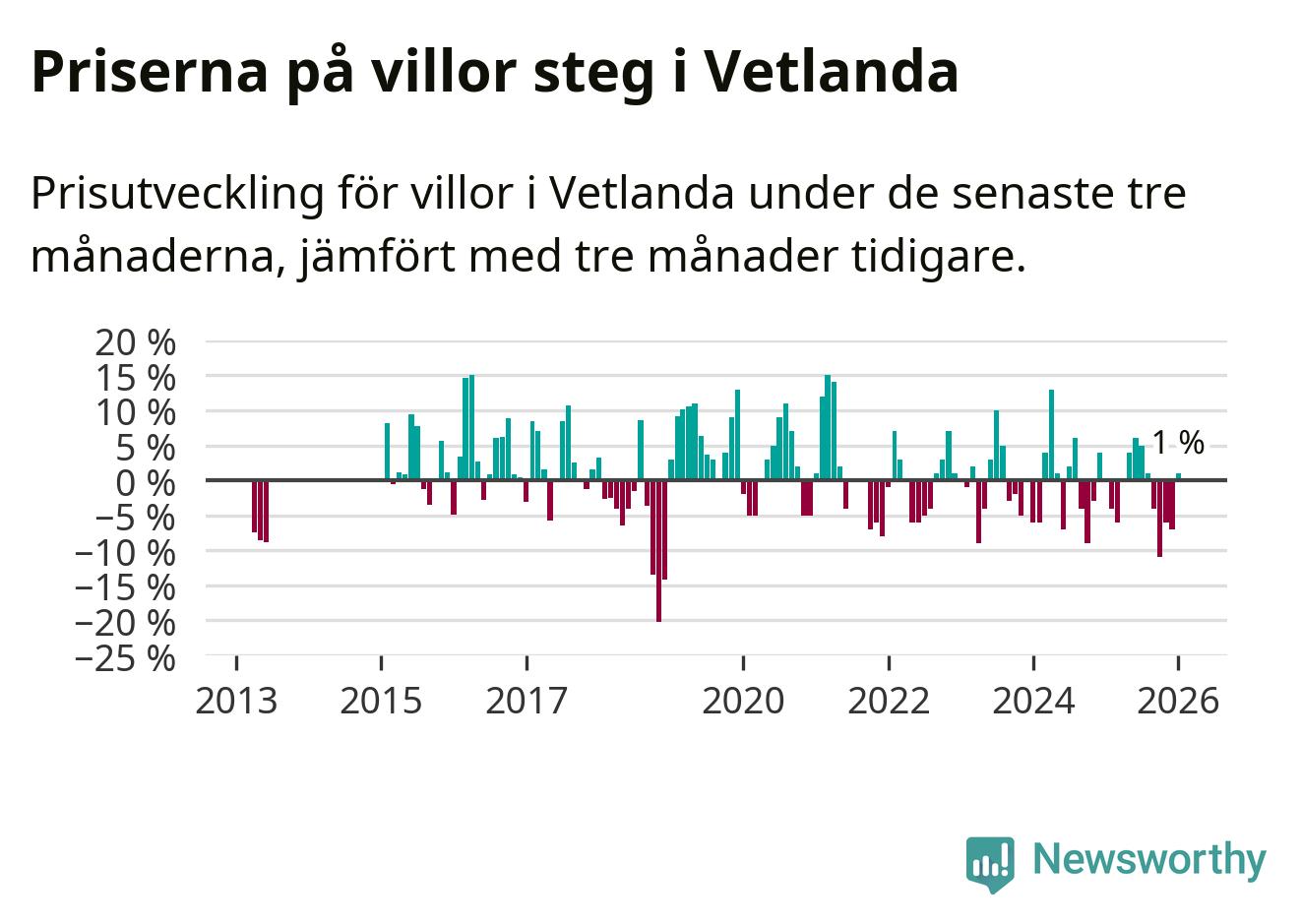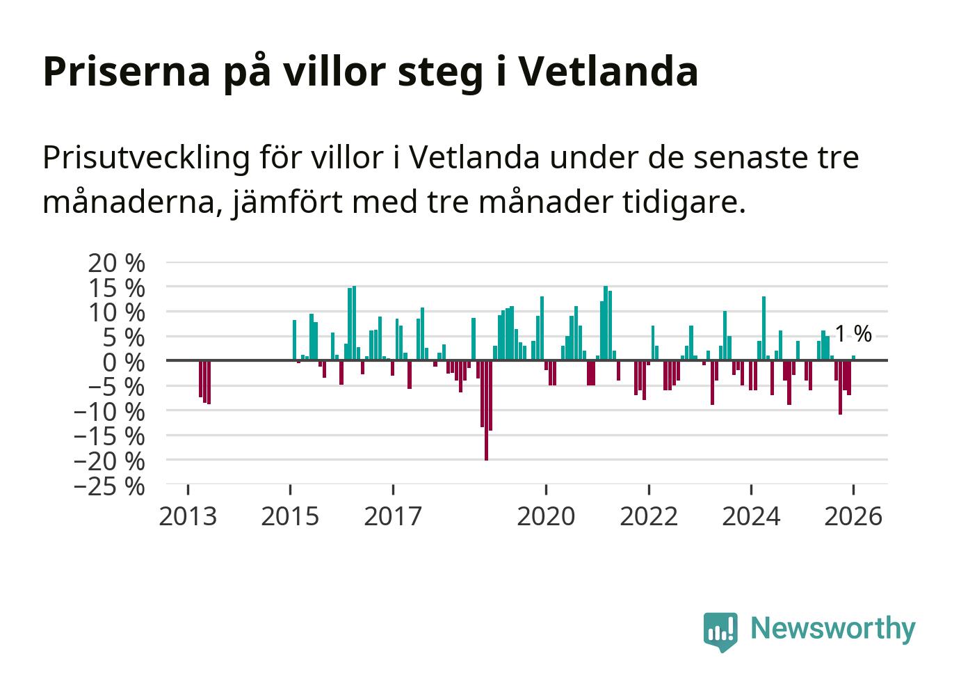 Villapriserna har gått upp i Vetlanda kommun. Medelpriset på försäljningarna under de senaste tre månaderna visar på en uppgång med 1 procent.