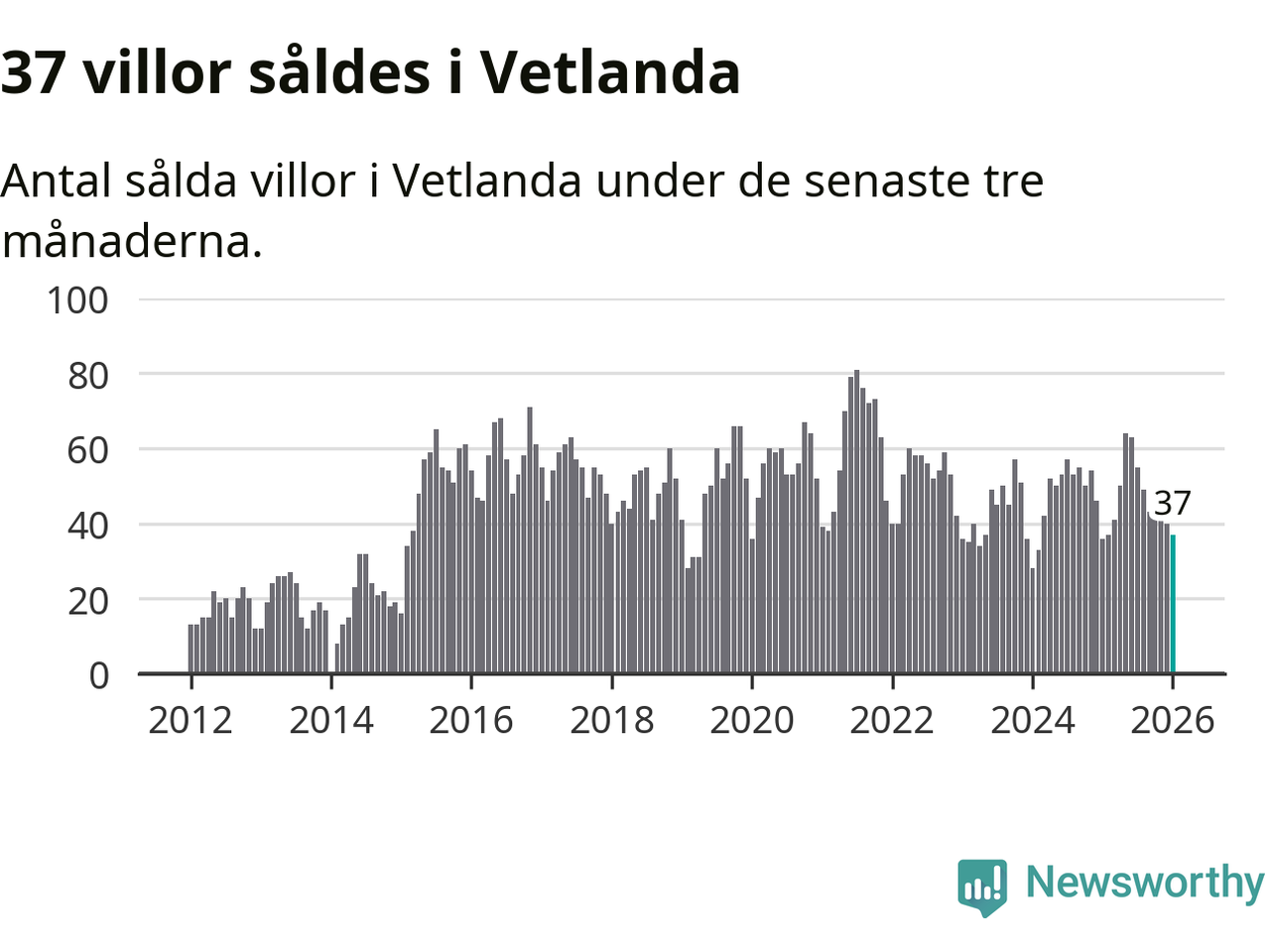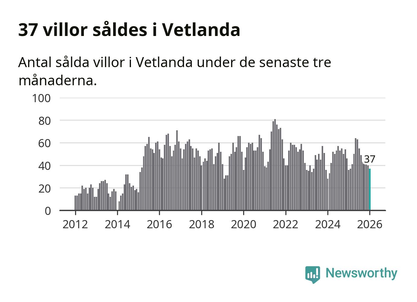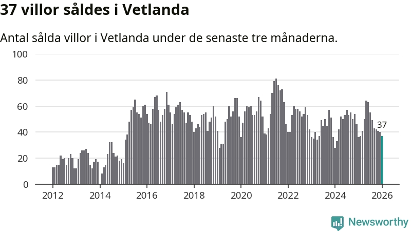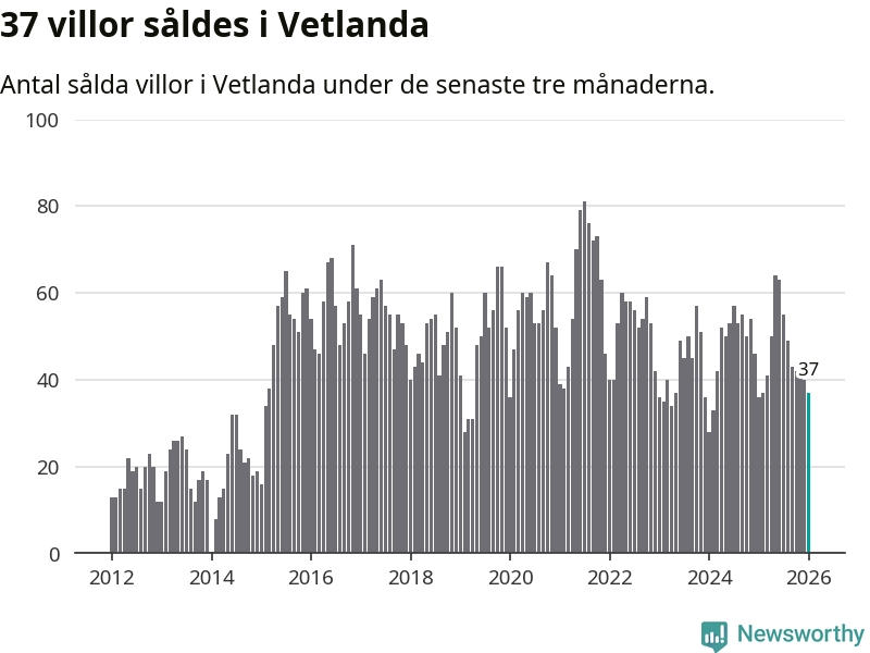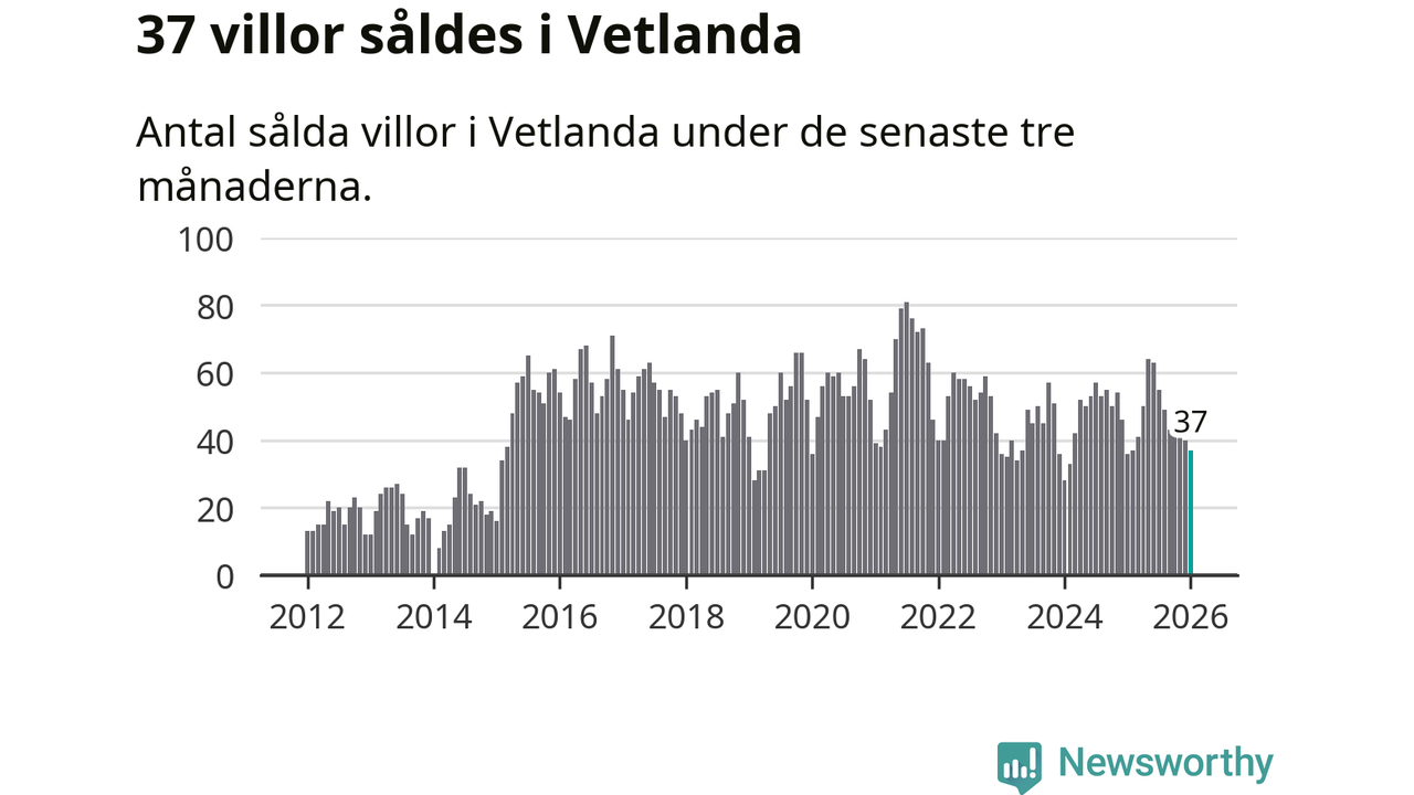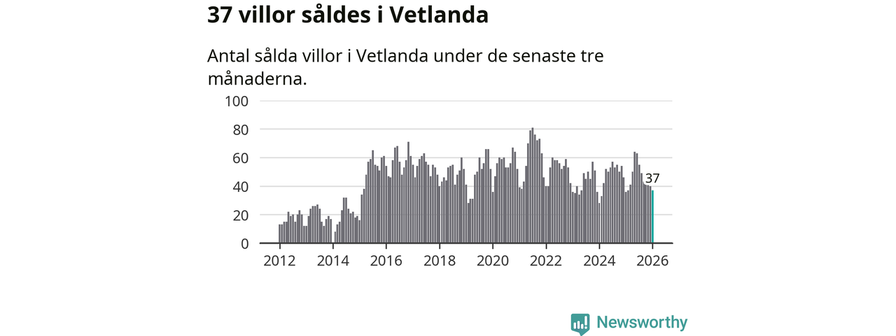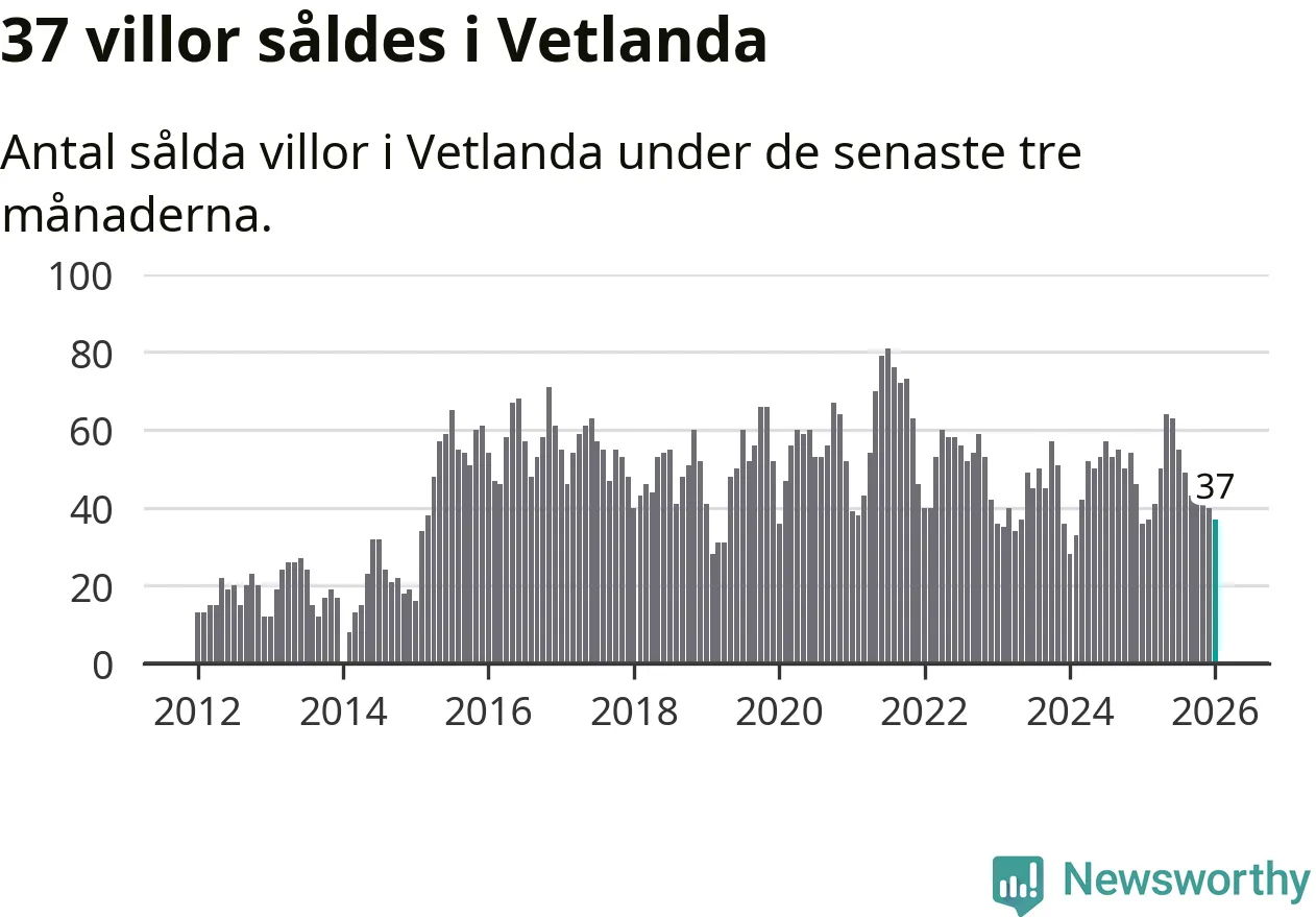 Sammanlagt såldes 37 villor i Vetlanda kommun mellan november och januari till ett genomsnittligt pris på 1,6 miljoner kronor. I fjol gjordes 36 affärer vid den här tiden på året.