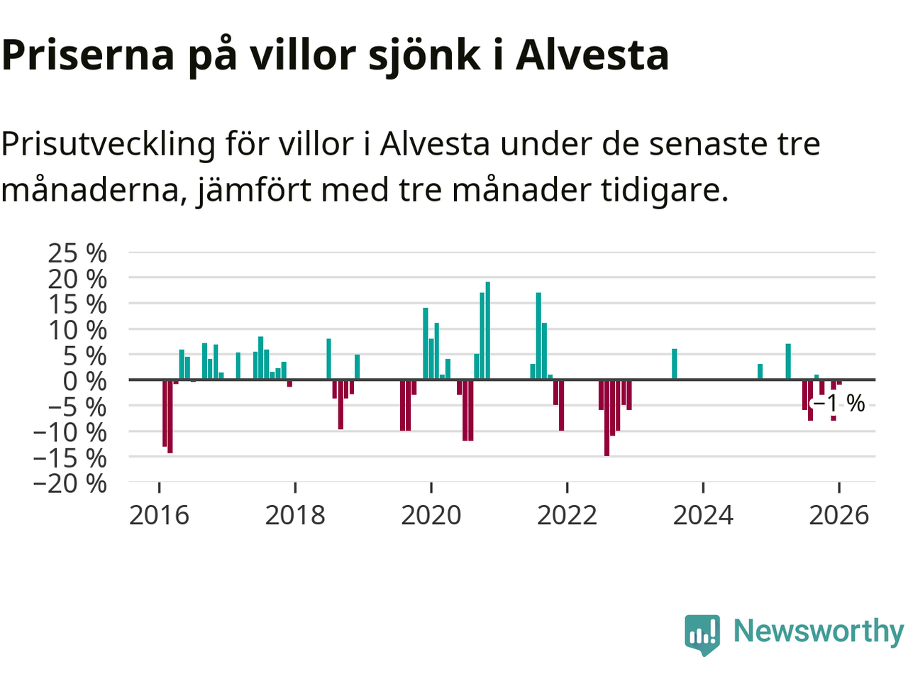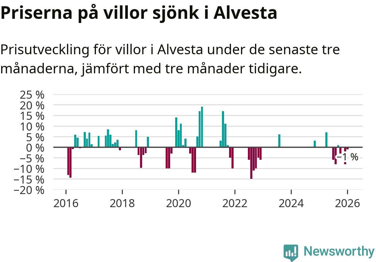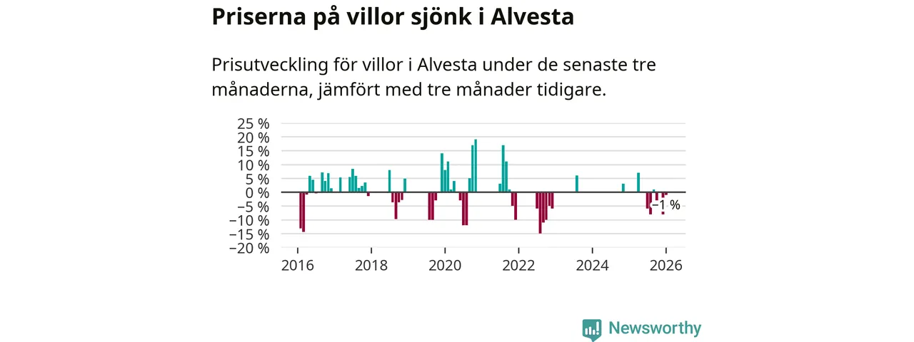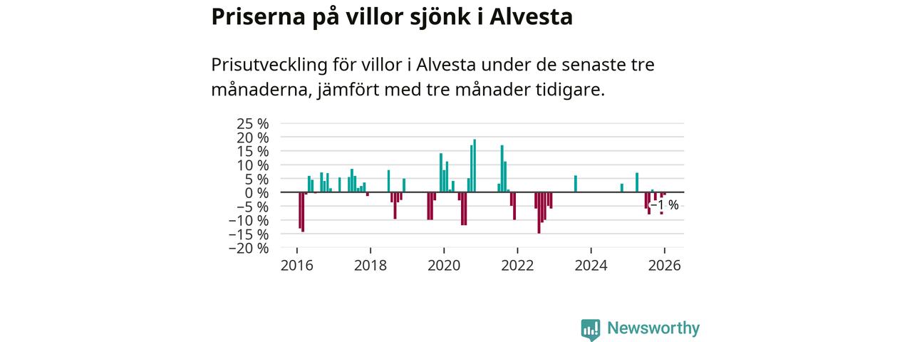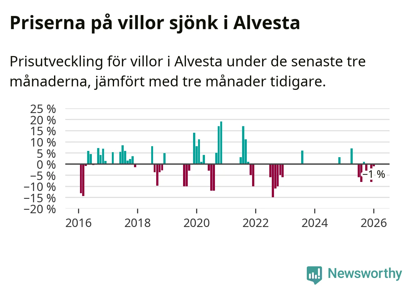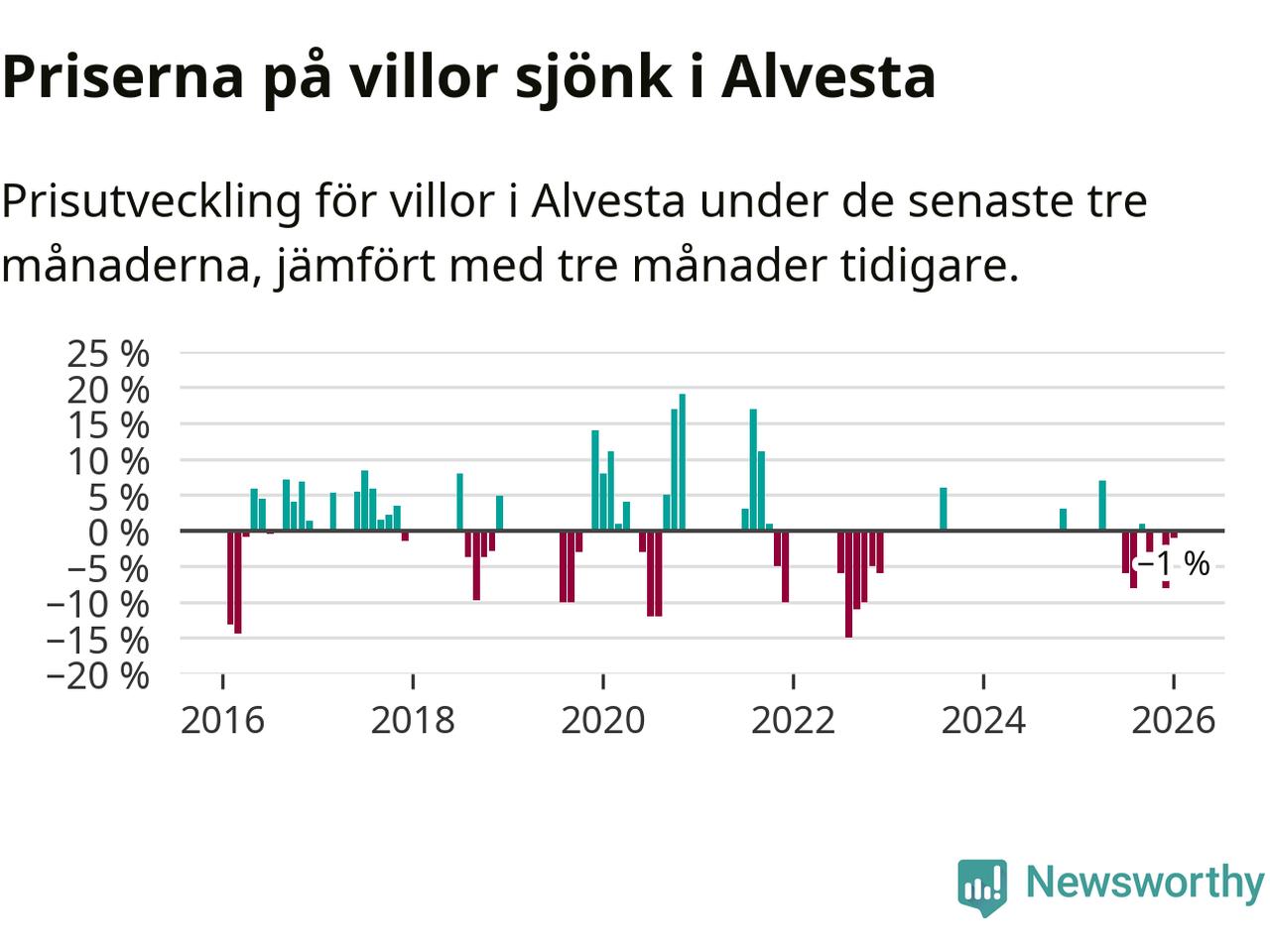 Statistiken visar även på en prisnedgång i Alvesta kommun. Medelpriset på försäljningarna av villor i kommunen var 1 procent lägre än för tre månader sedan. Även i hela Kronoberg sjunker villapriserna. I hela länet noterades en prisnedgång på 6 procent.