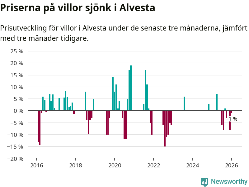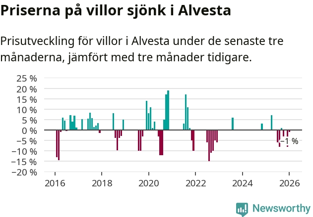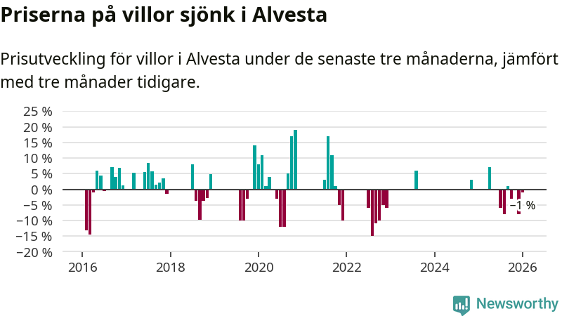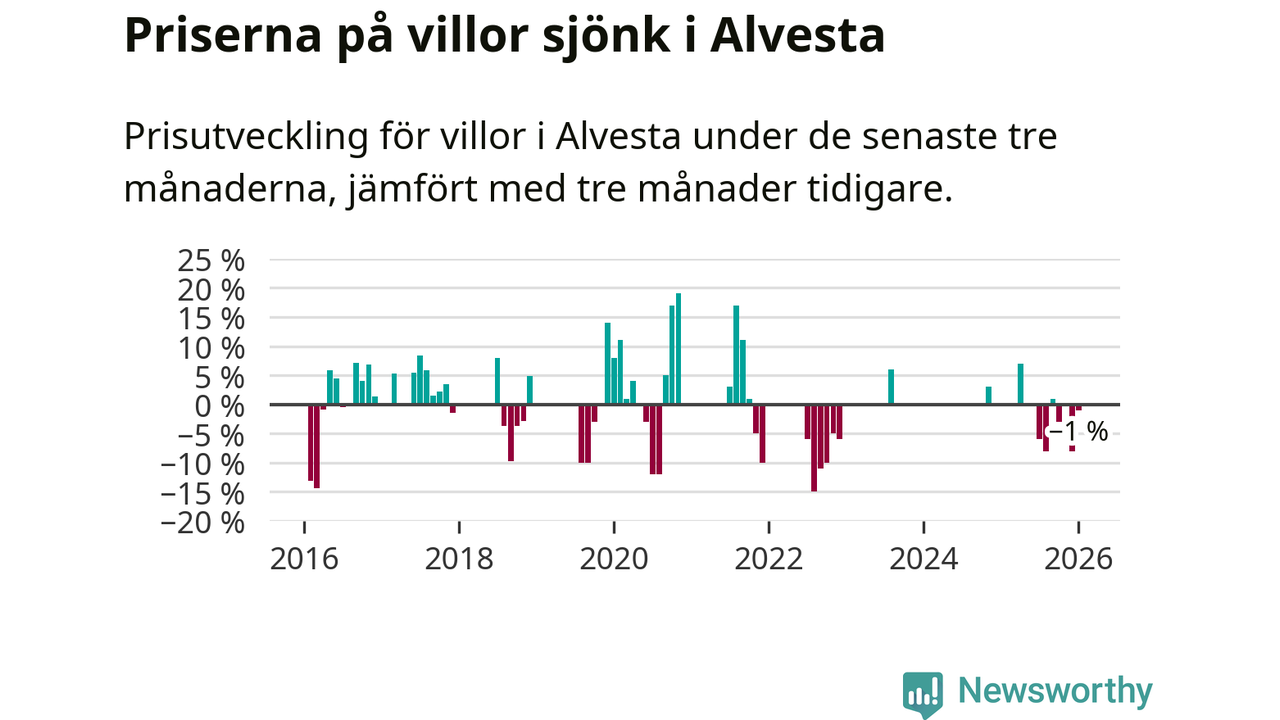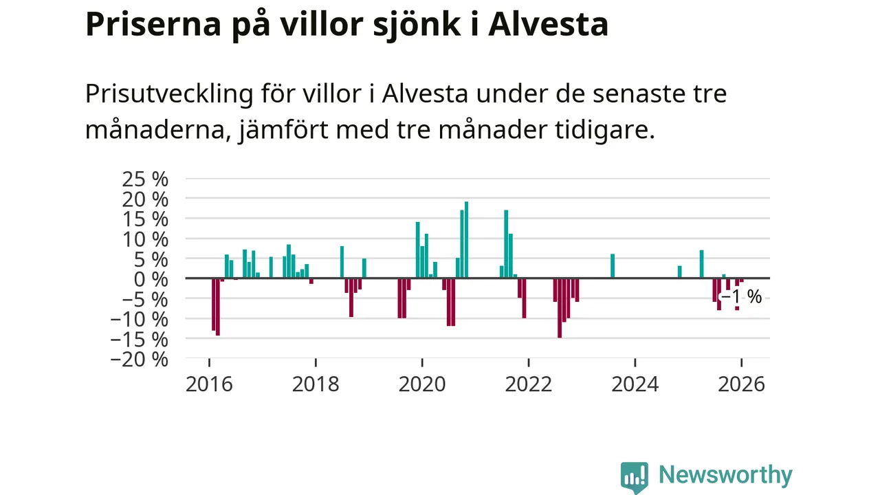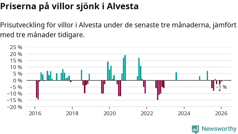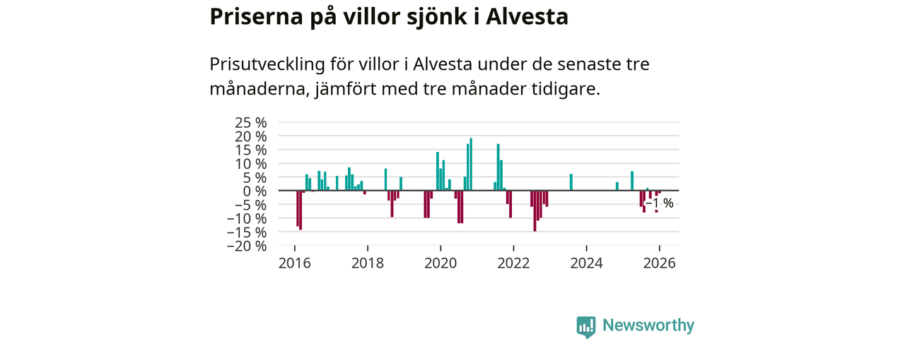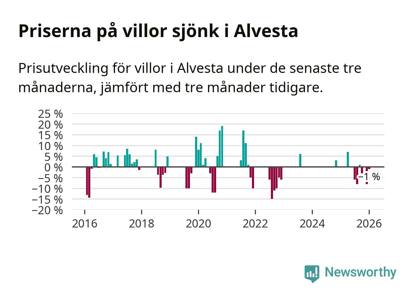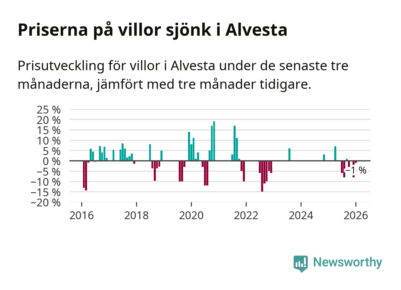 Statistiken visar även på en prisnedgång i Alvesta kommun. Medelpriset på försäljningarna av villor i kommunen var 1 procent lägre än för tre månader sedan. Även i hela Kronoberg sjunker villapriserna. I hela länet noterades en prisnedgång på 6 procent.