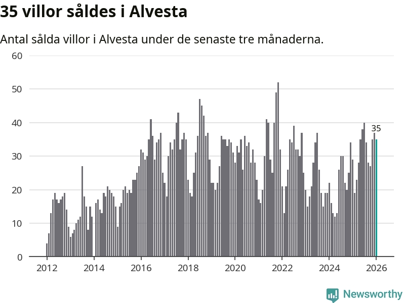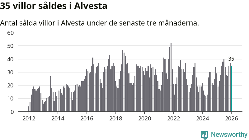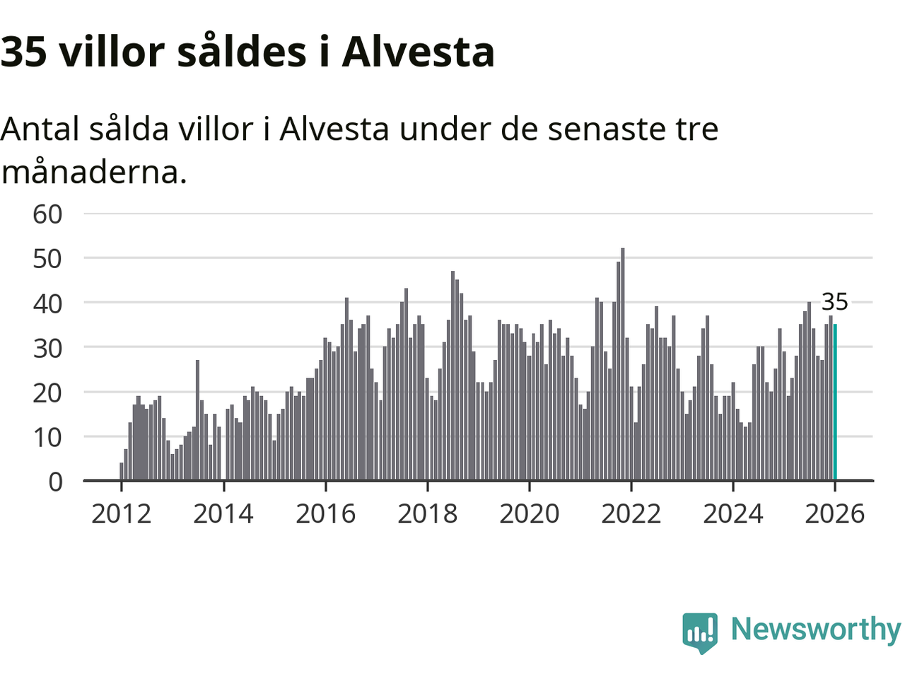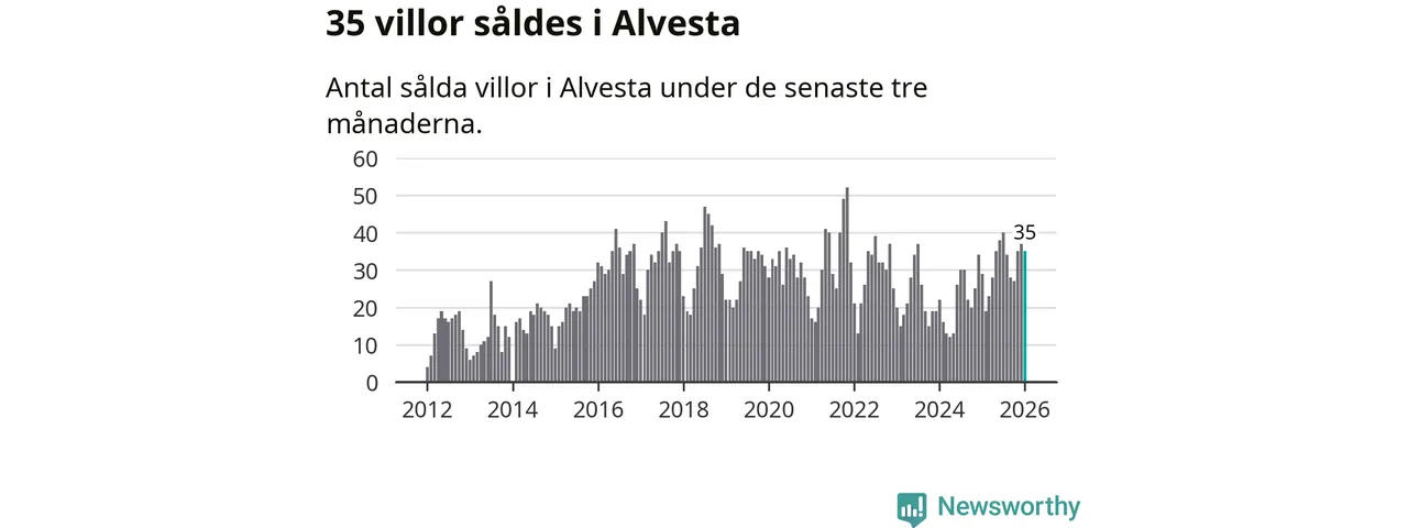 Mellan november och januari såldes 35 villor i Alvesta kommun. Det är relativt många sett till aktiviteten på bostadsmarknaden i kommunen under de senaste tolv månaderna, samt det historiska snittet för den här tiden på året.