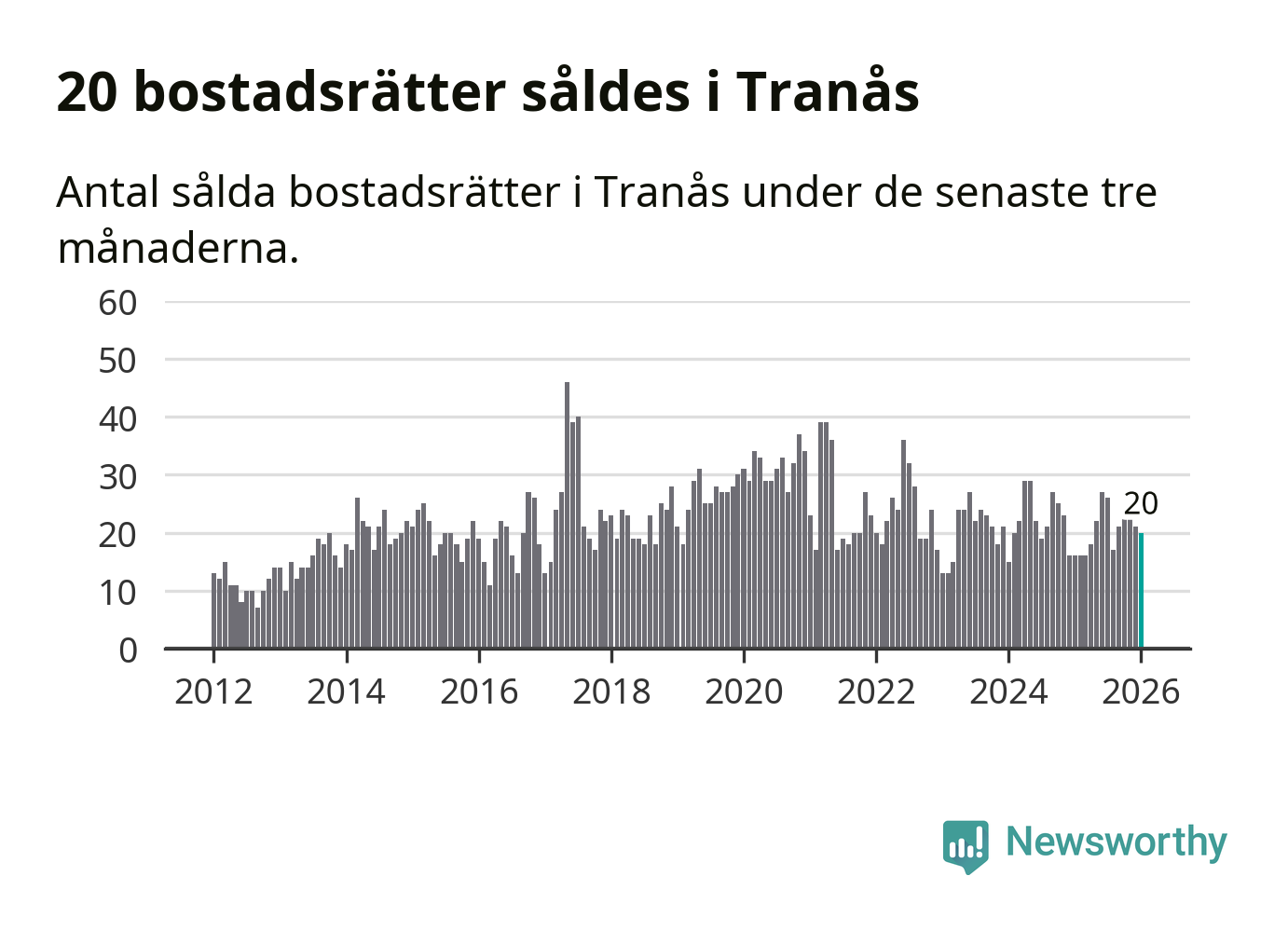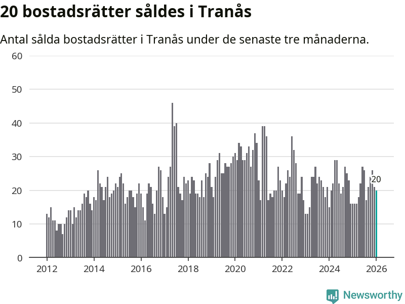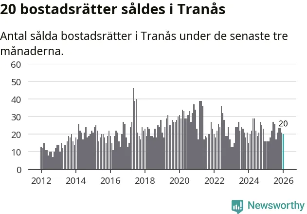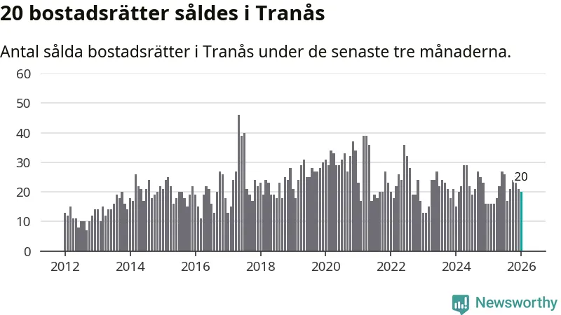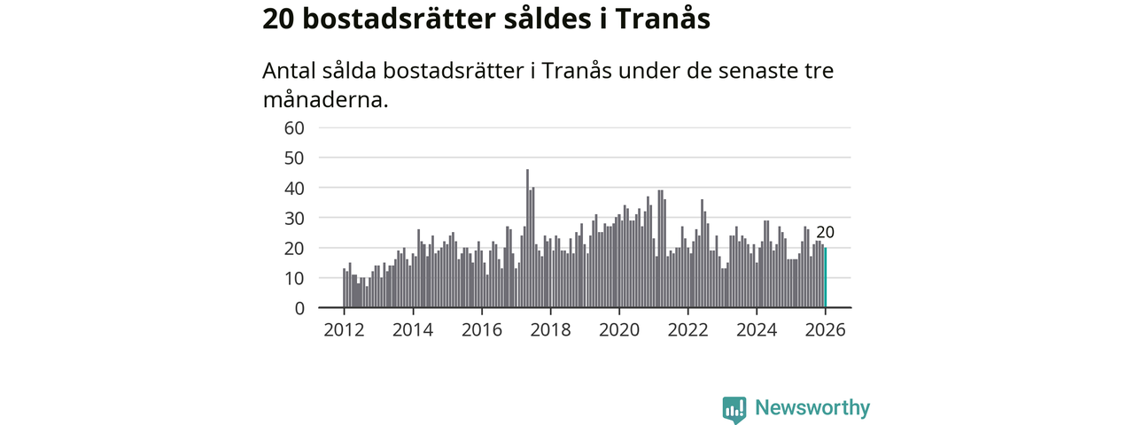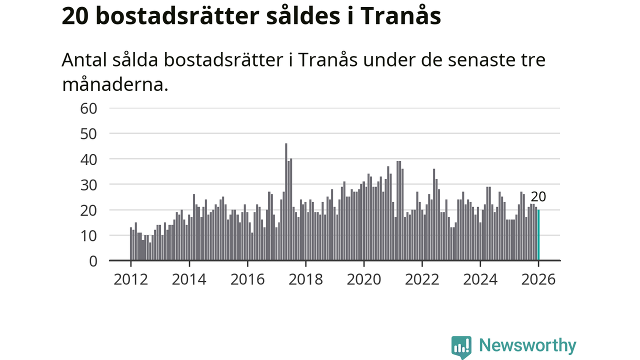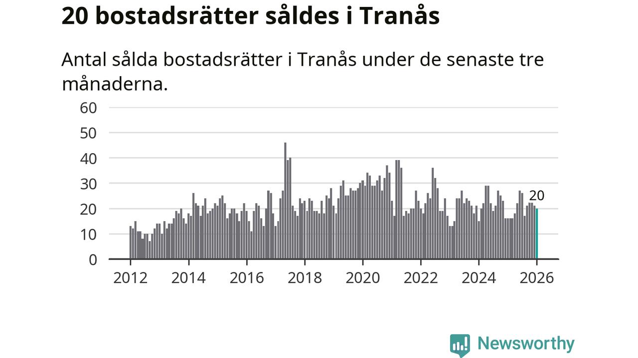 Mellan november och januari gjordes sammanlagt 20 affärer med bostadsrätter i Tranås kommun. Det kan jämföras med 16 vid motsvarande tid i fjol.