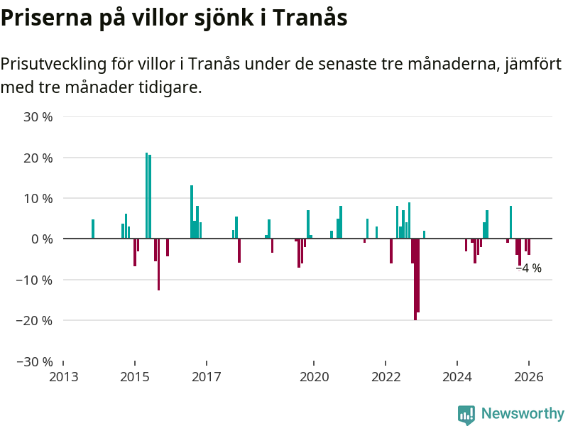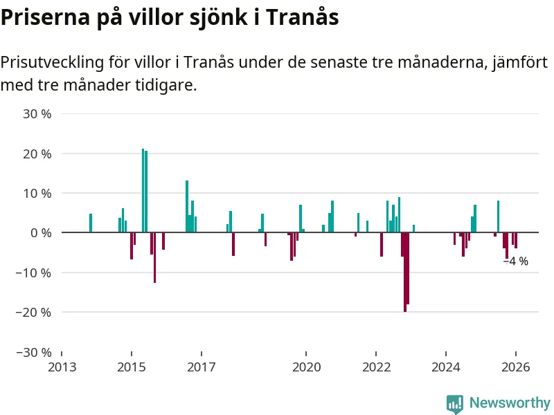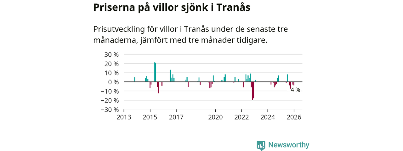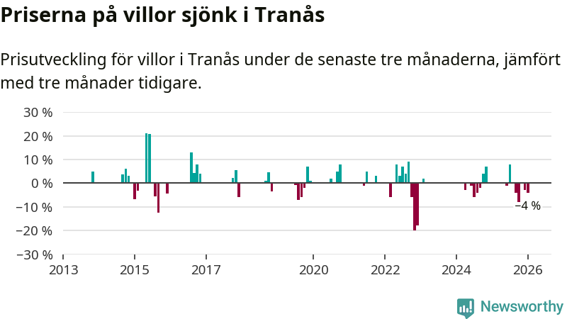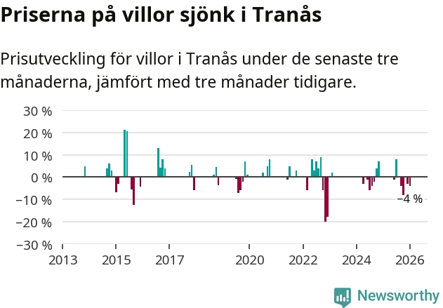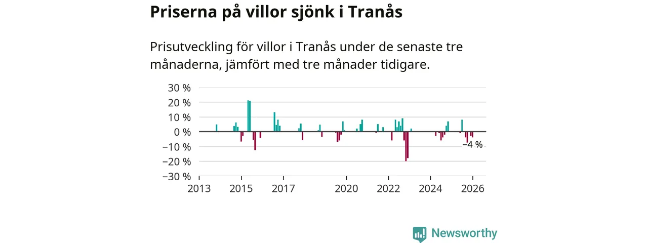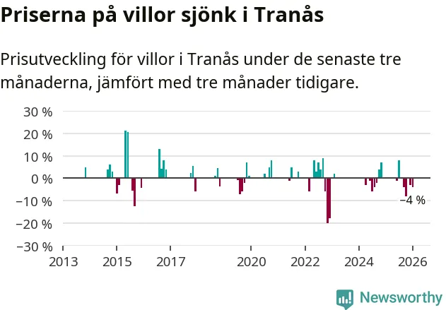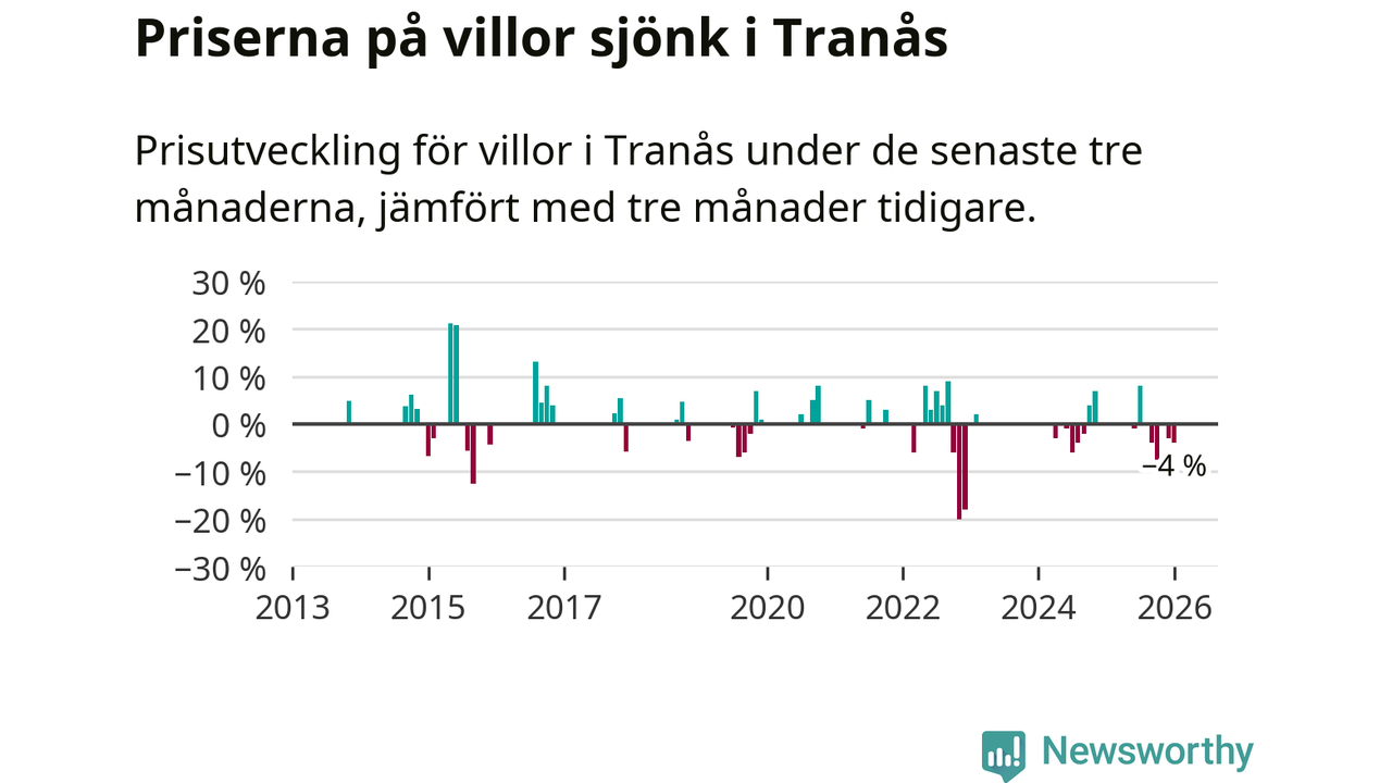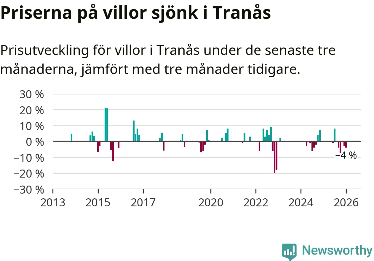 Statistiken visar även på en kännbar prisnedgång i Tranås kommun. Medelpriset på försäljningarna av villor i kommunen var 4 procent lägre än för tre månader sedan. Även i hela Jönköpings län sjunker villapriserna. I hela länet noterades en prisnedgång på 1 procent.