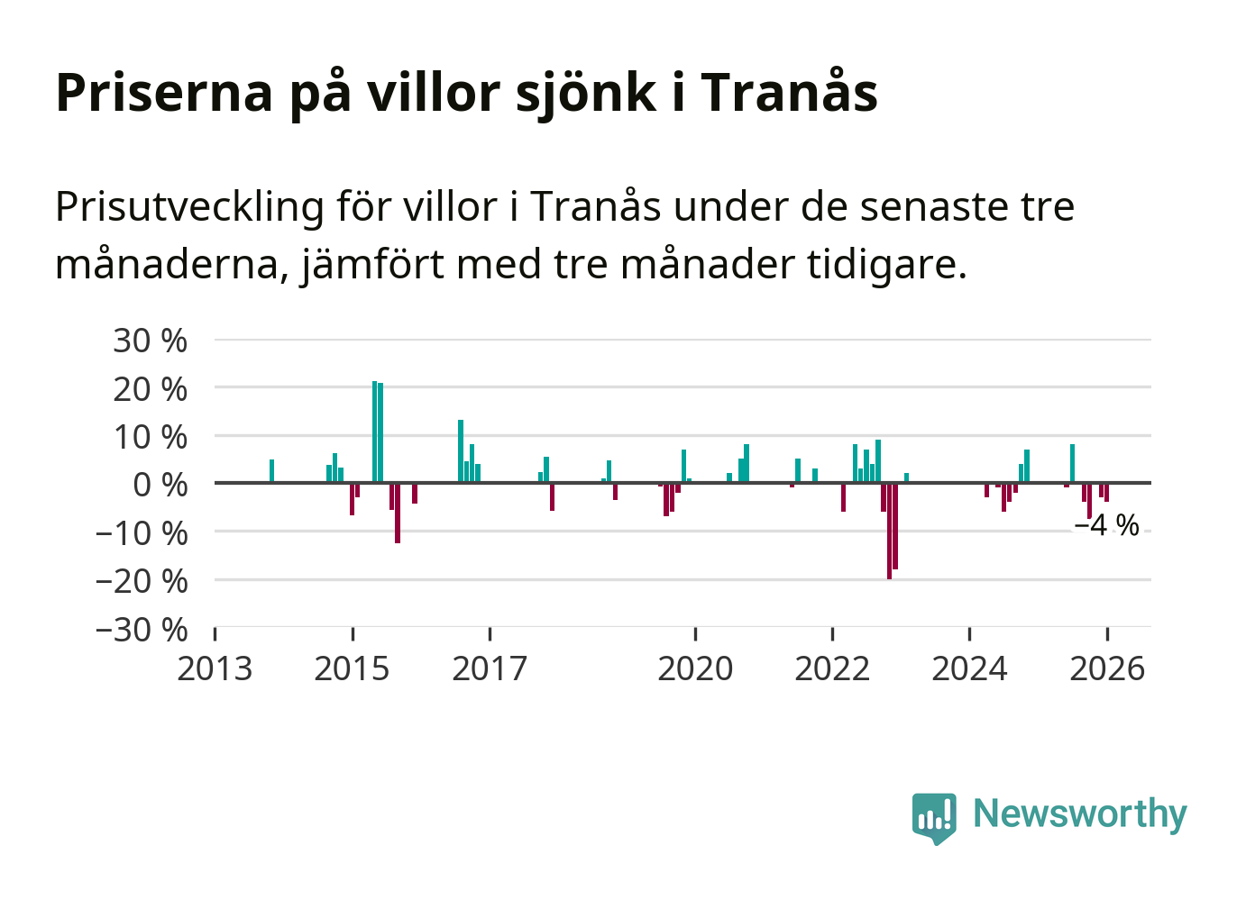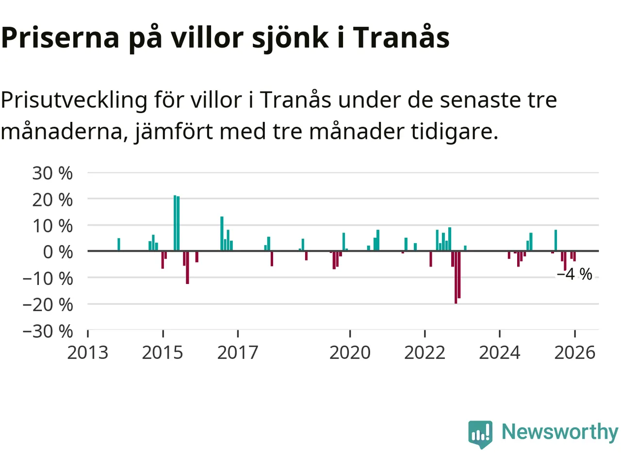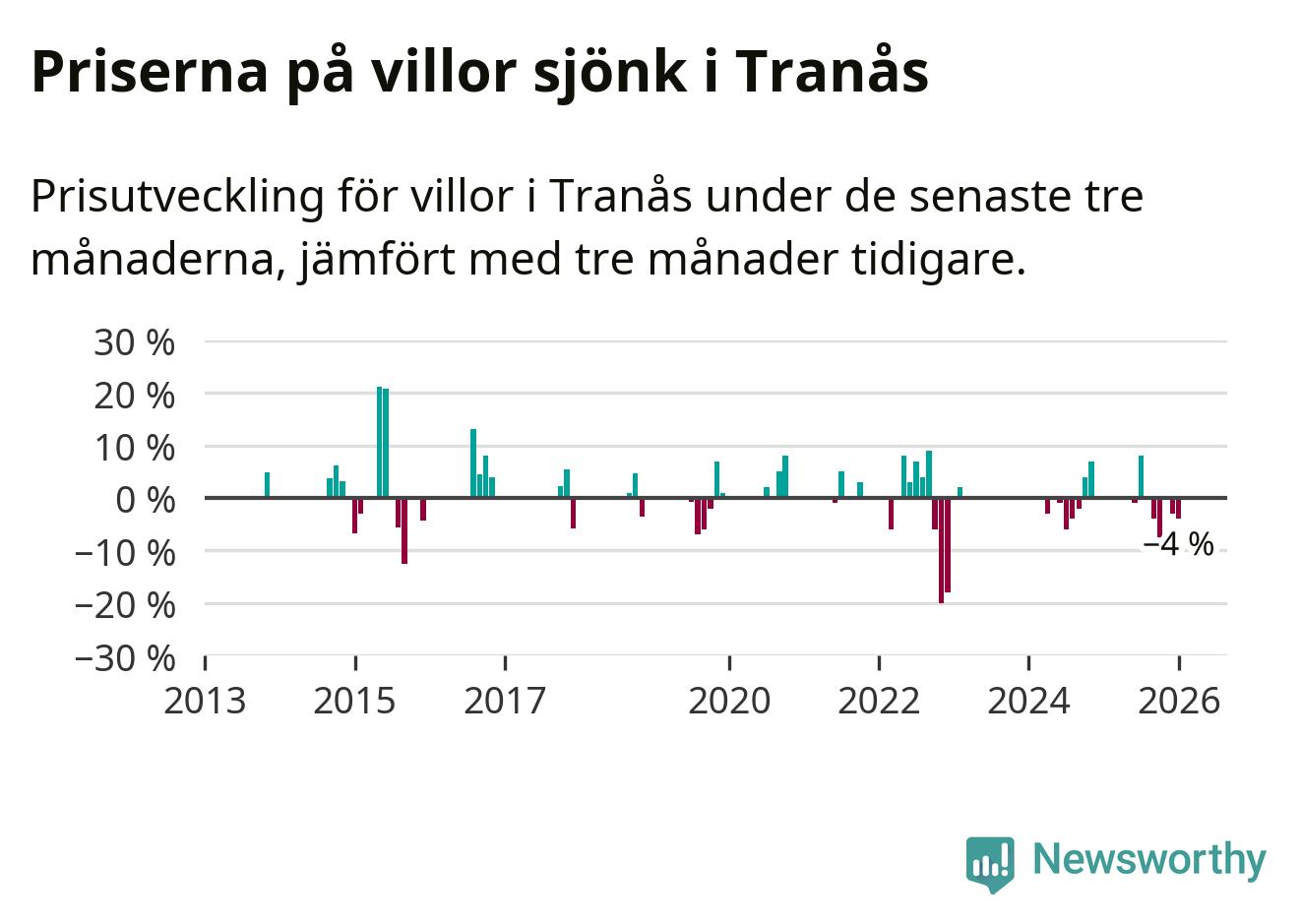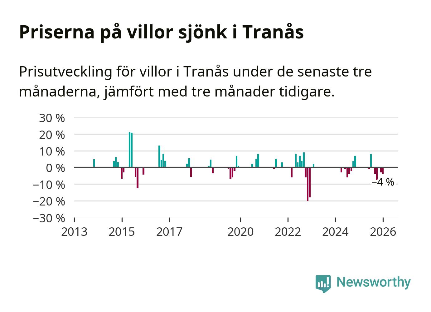 Statistiken visar även på en kännbar prisnedgång i Tranås kommun. Medelpriset på försäljningarna av villor i kommunen var 4 procent lägre än för tre månader sedan. Även i hela Jönköpings län sjunker villapriserna. I hela länet noterades en prisnedgång på 1 procent.