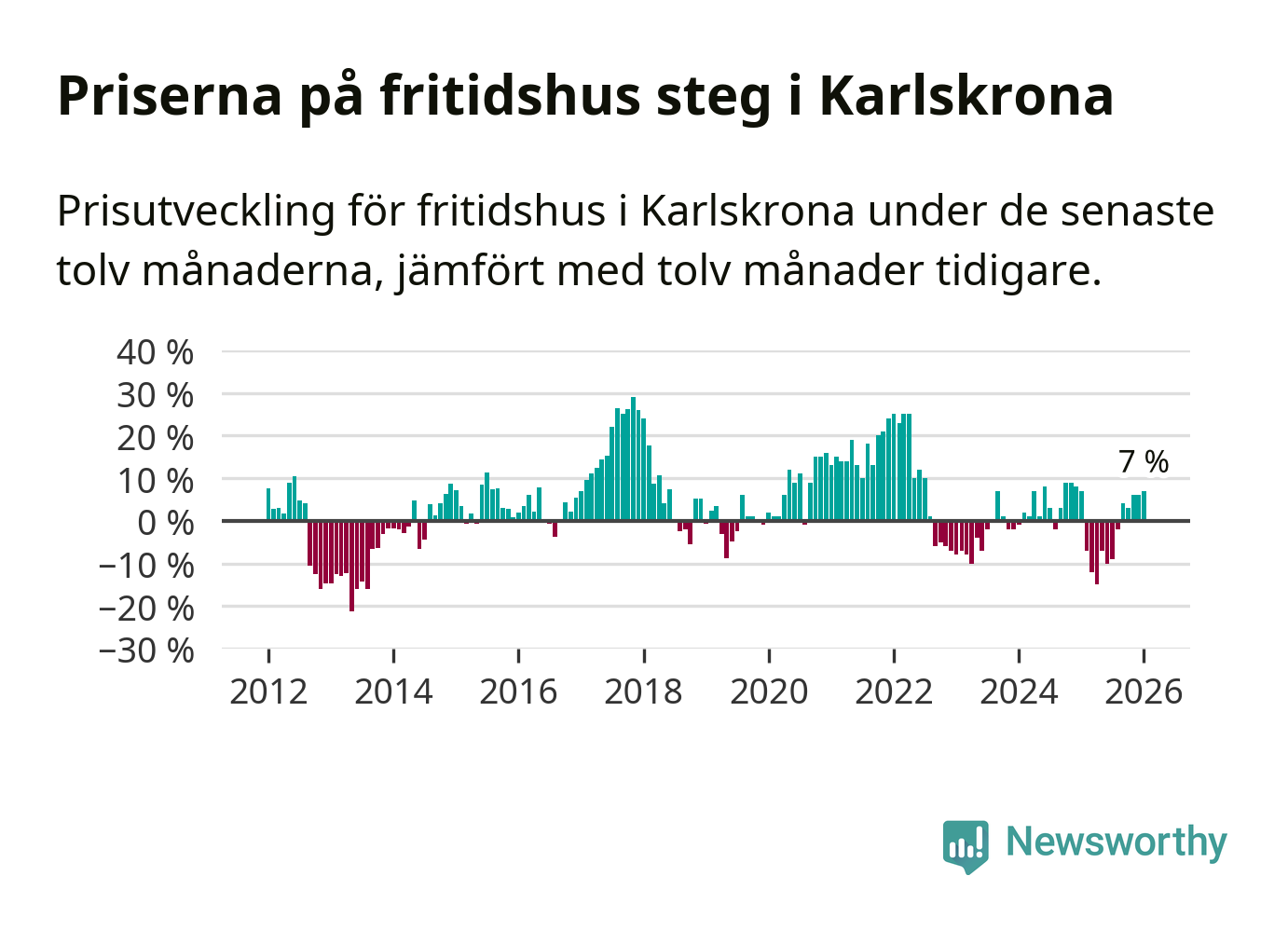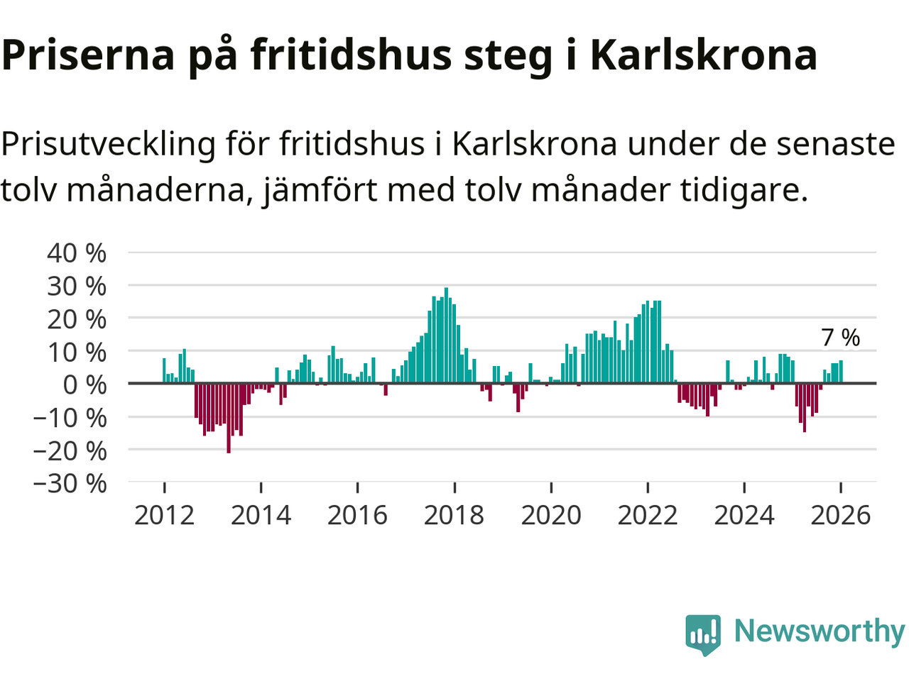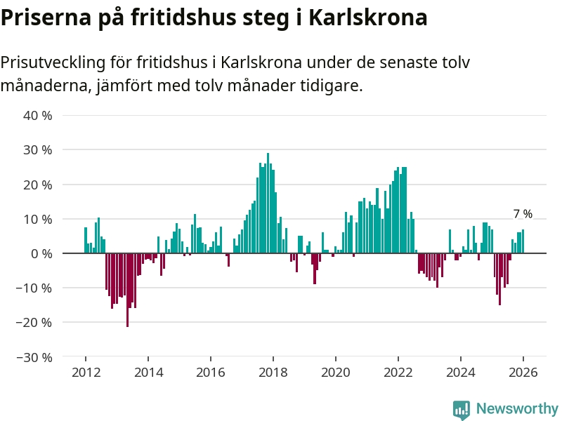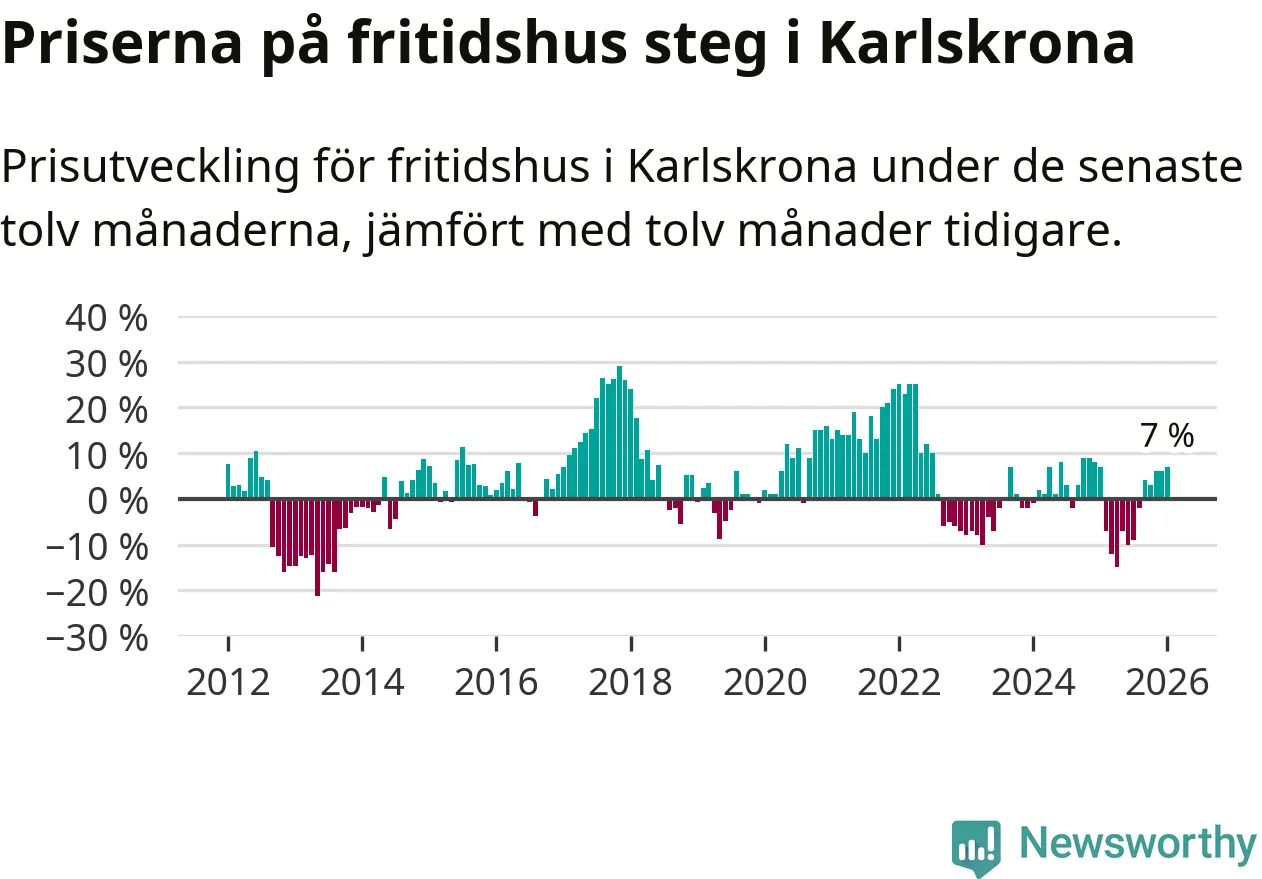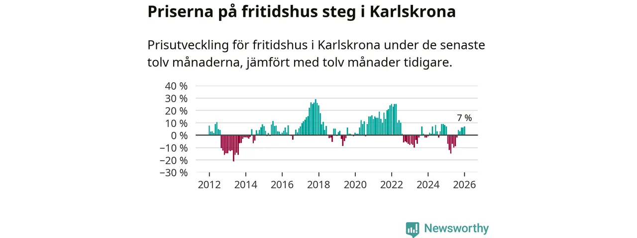 Priserna på fritidshus har gått upp i Karlskrona kommun. Medelpriset på försäljningarna under de senaste tolv månaderna visar på en uppgång med 7 procent.