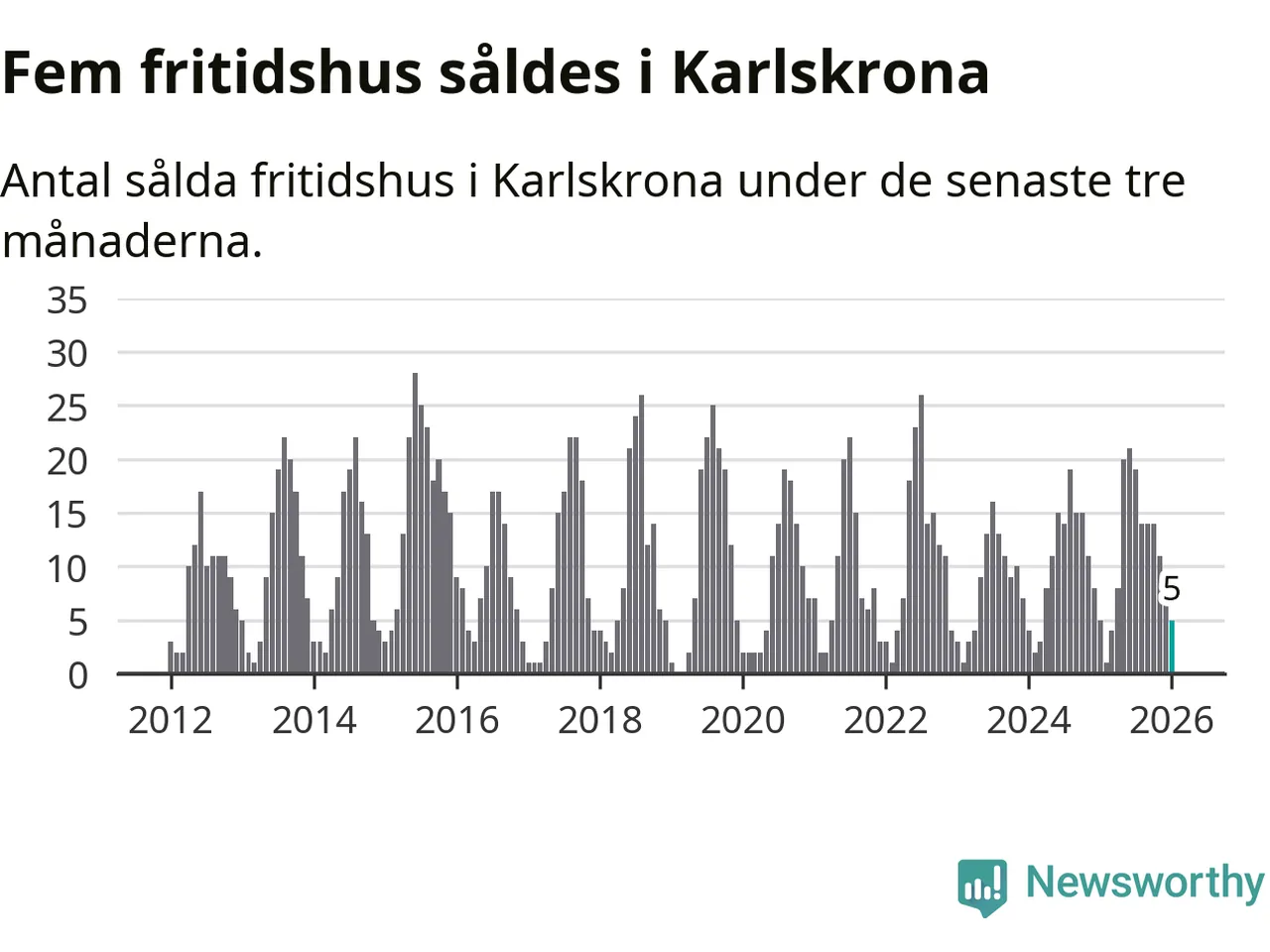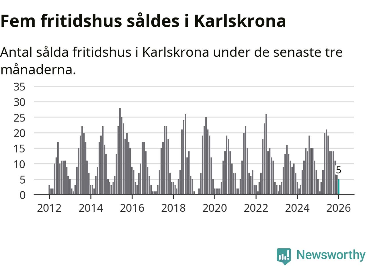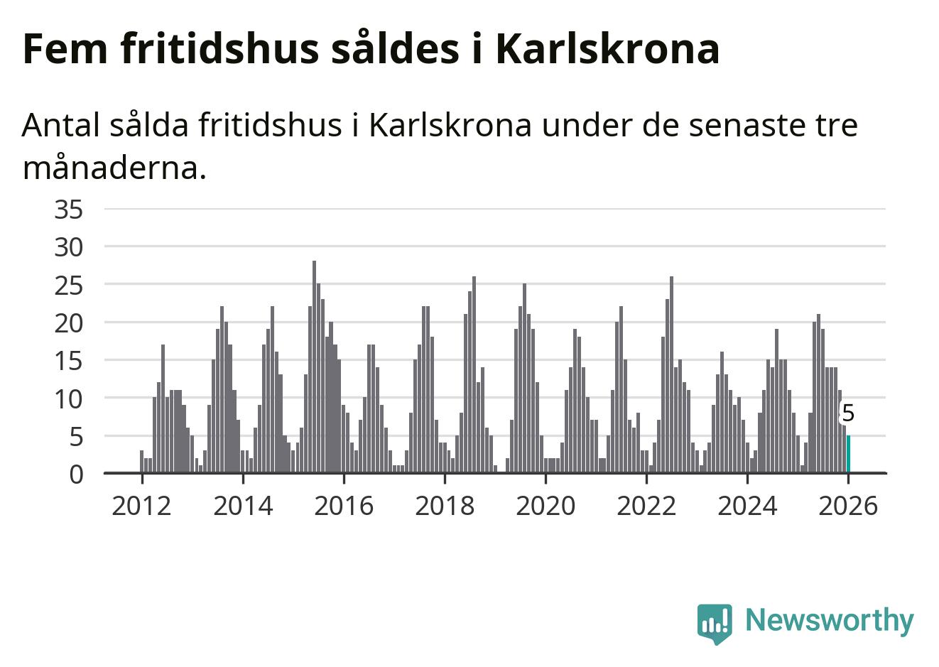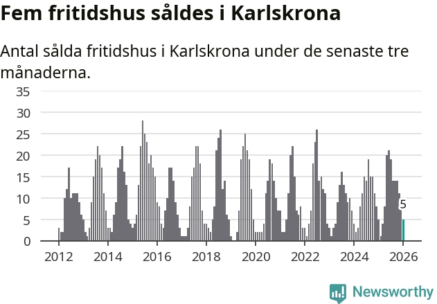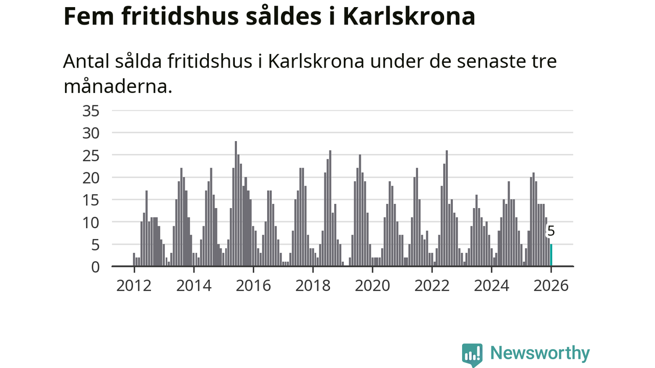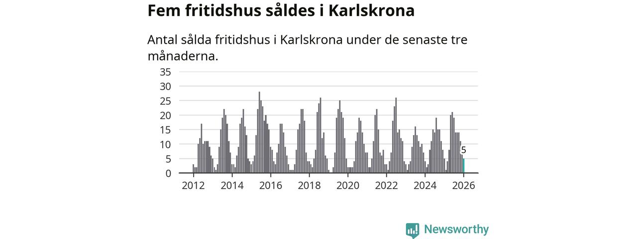 Sammanlagt såldes fem fritidshus i Karlskrona kommun mellan november 2025 och januari till ett genomsnittligt pris på 1,8 miljoner kronor. I fjol gjordes fem affärer vid den här tiden på året.