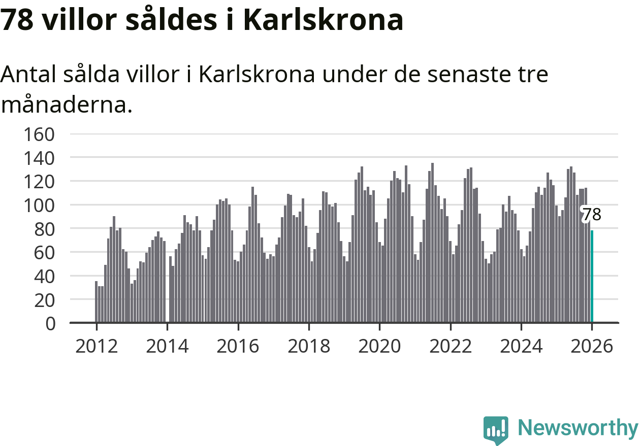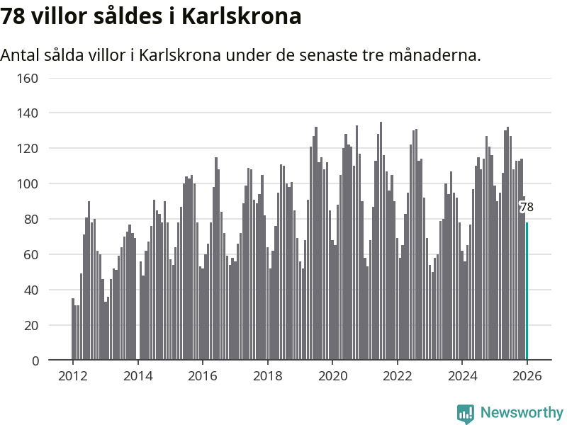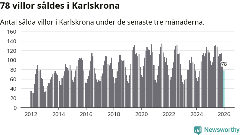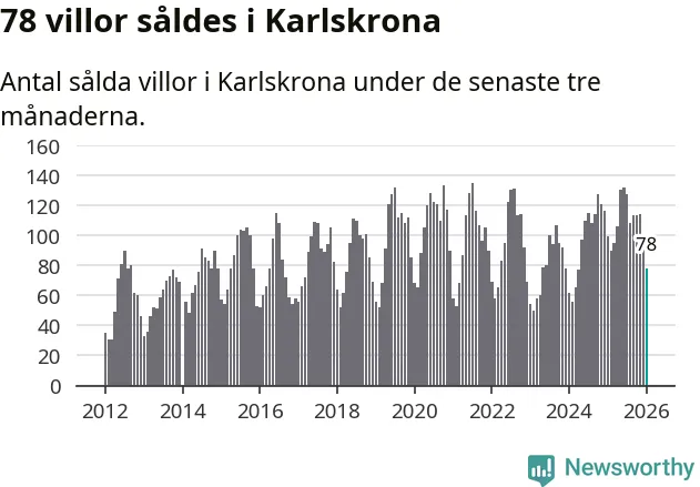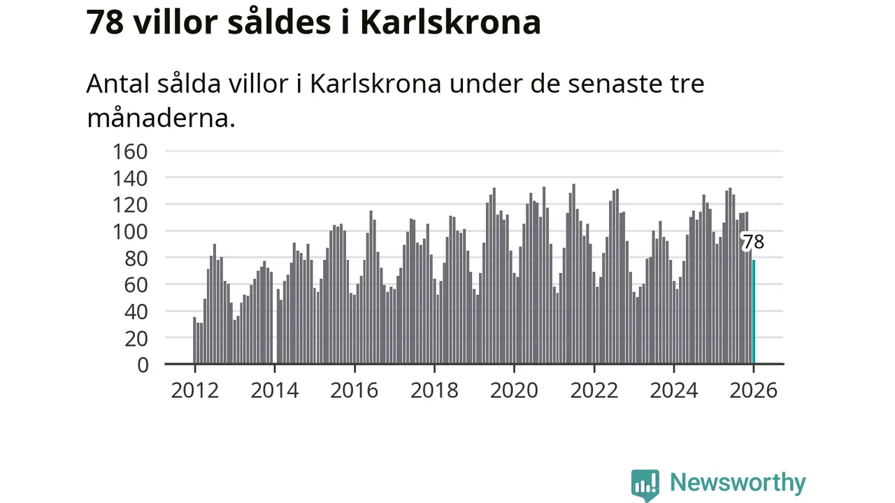 Sammanlagt såldes 78 villor i Karlskrona kommun mellan november och januari till ett genomsnittligt pris på 3,0 miljoner kronor. I fjol gjordes 99 affärer vid den här tiden på året.