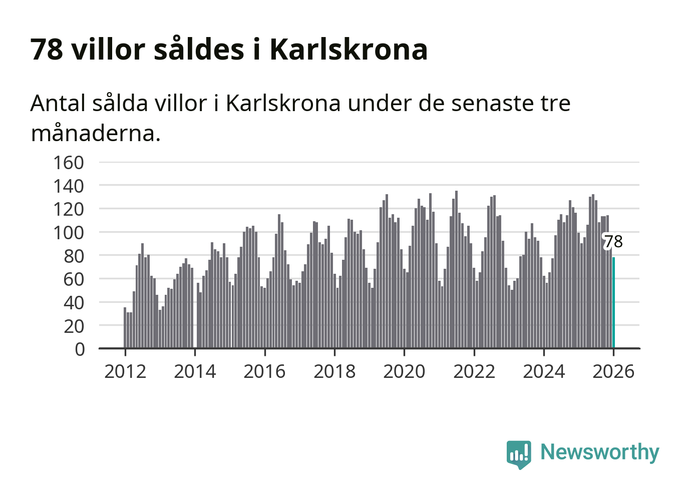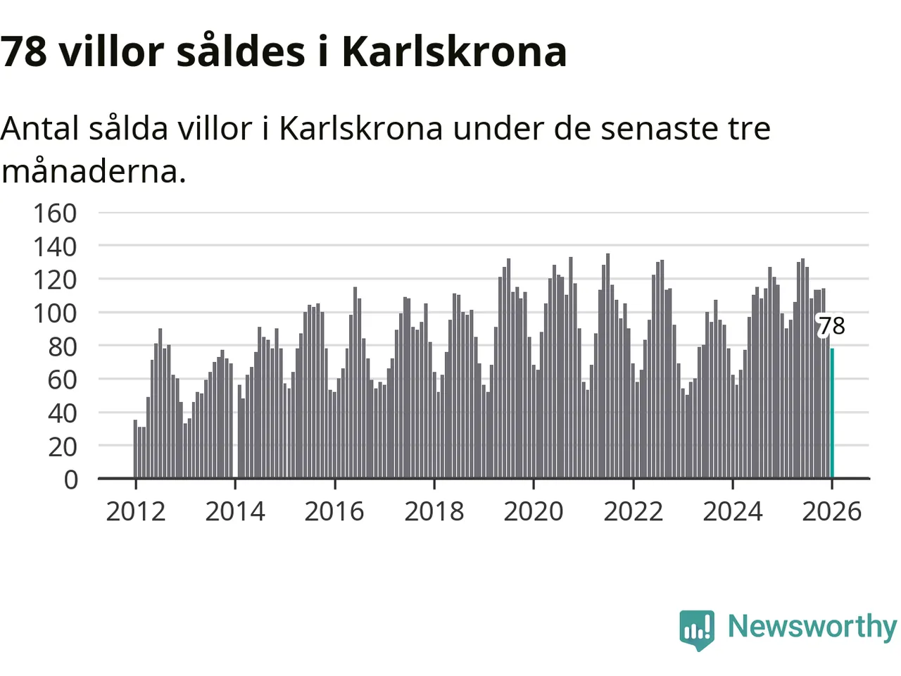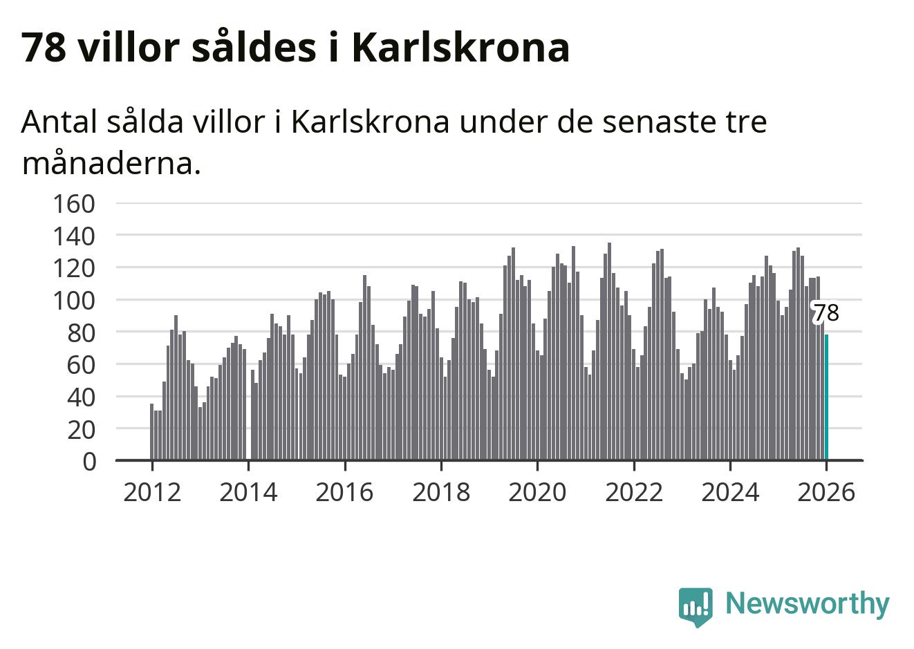 Sammanlagt såldes 78 villor i Karlskrona kommun mellan november och januari till ett genomsnittligt pris på 3,0 miljoner kronor. I fjol gjordes 99 affärer vid den här tiden på året.