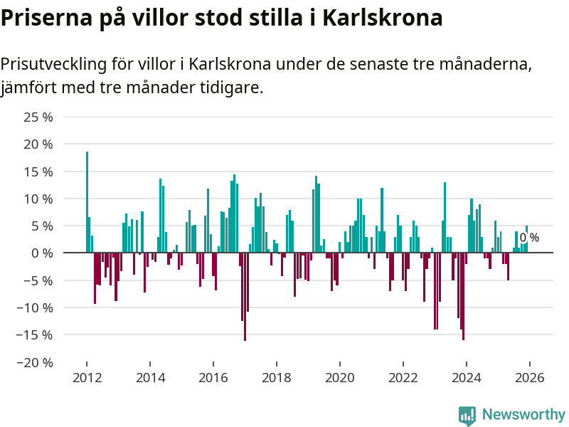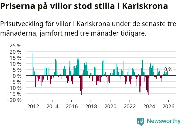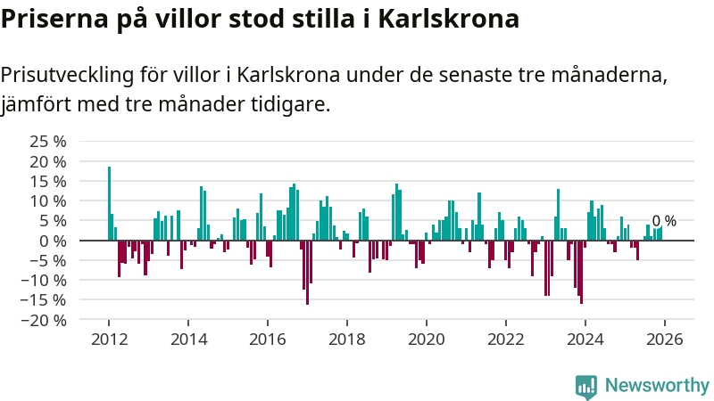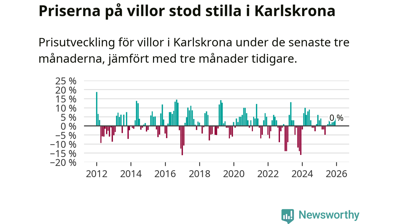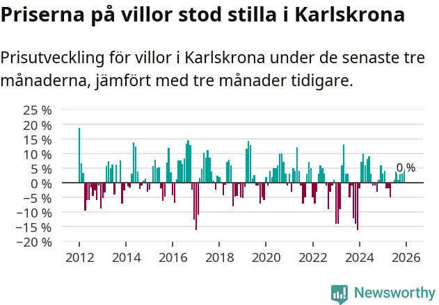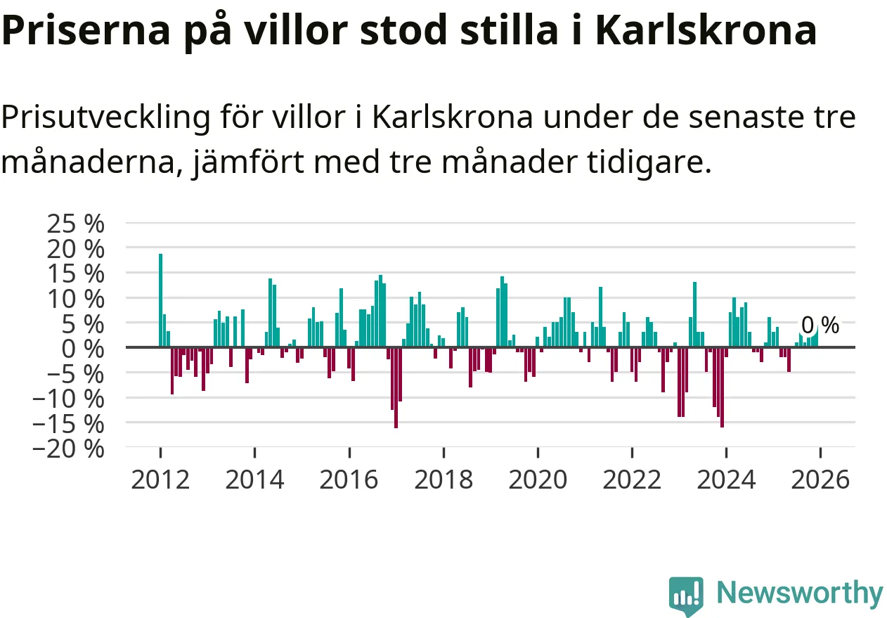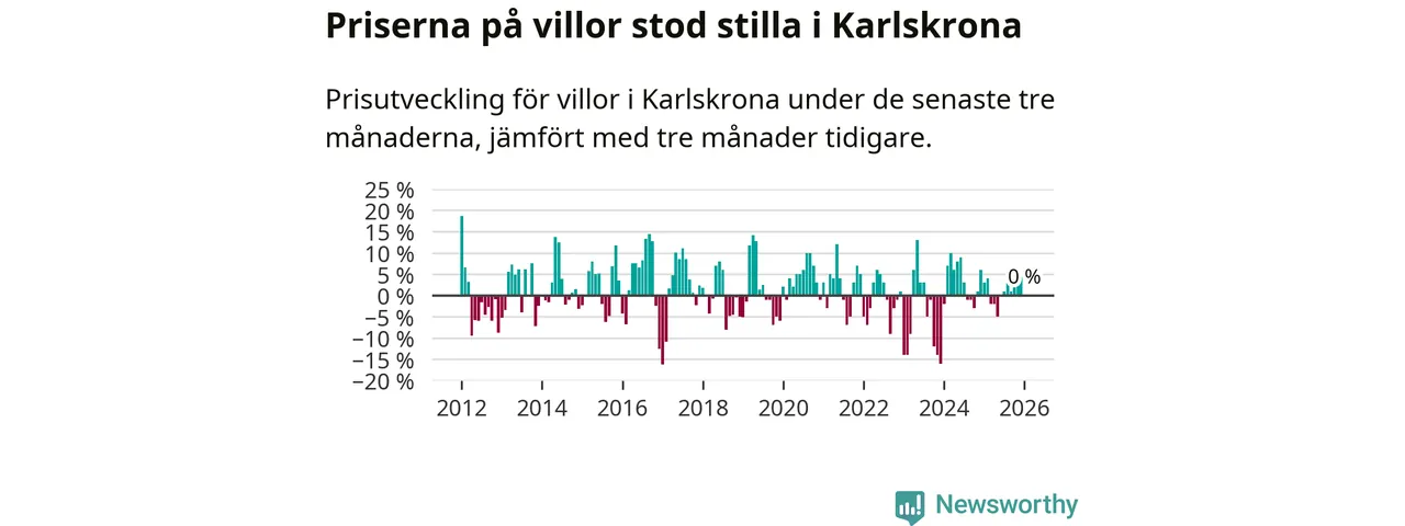 Villapriserna står i stort sett stilla i Karlskrona kommun. Medelpriset på de på försäljningarna under de senaste tre månaderna låg på samma nivå som för tre månader sedan.