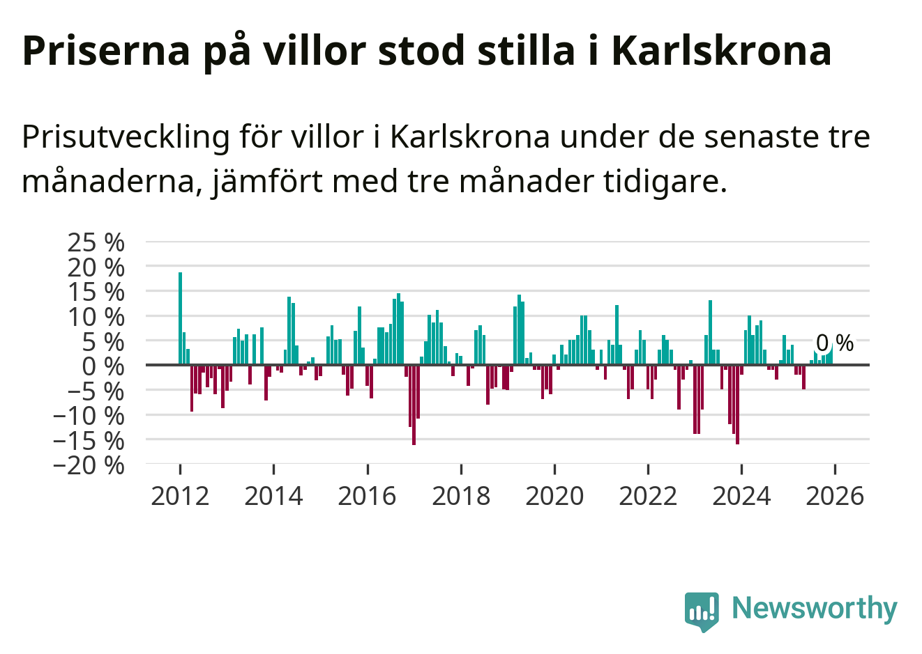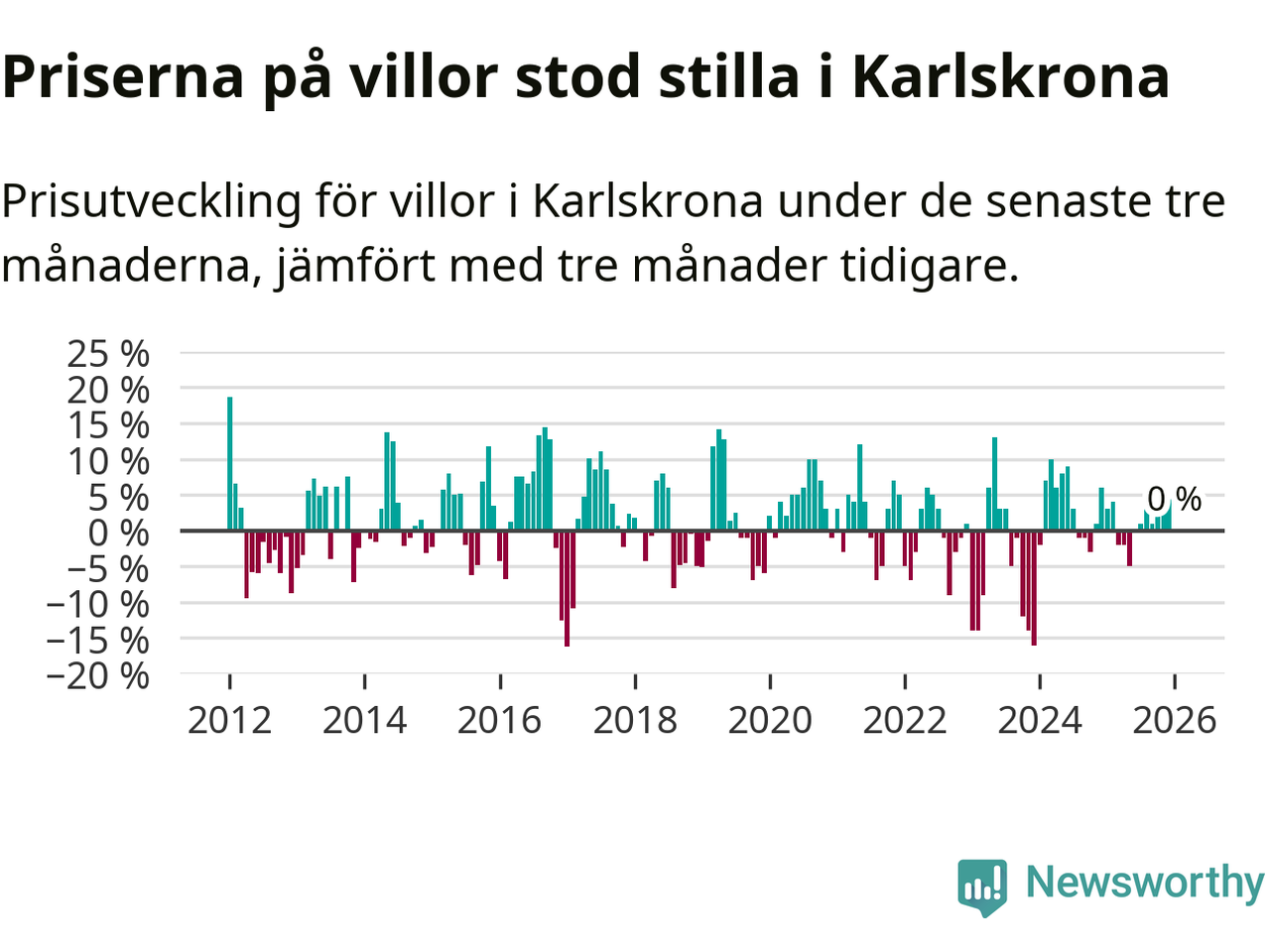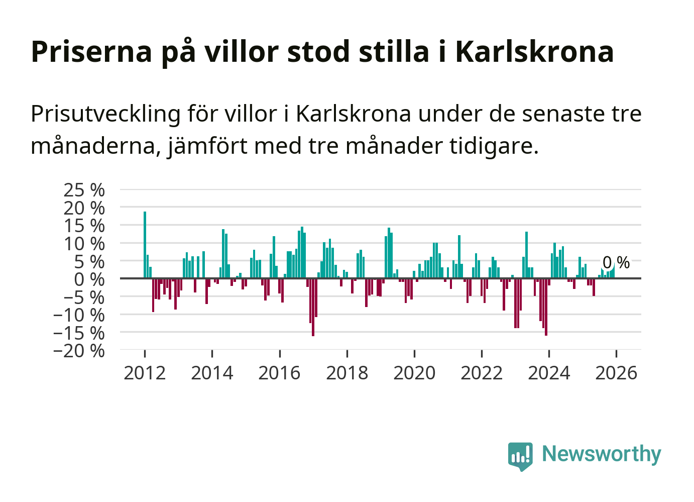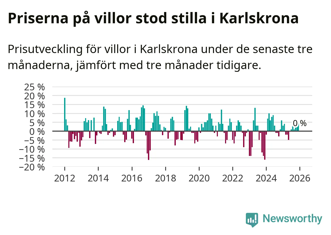 Villapriserna står i stort sett stilla i Karlskrona kommun. Medelpriset på de på försäljningarna under de senaste tre månaderna låg på samma nivå som för tre månader sedan.