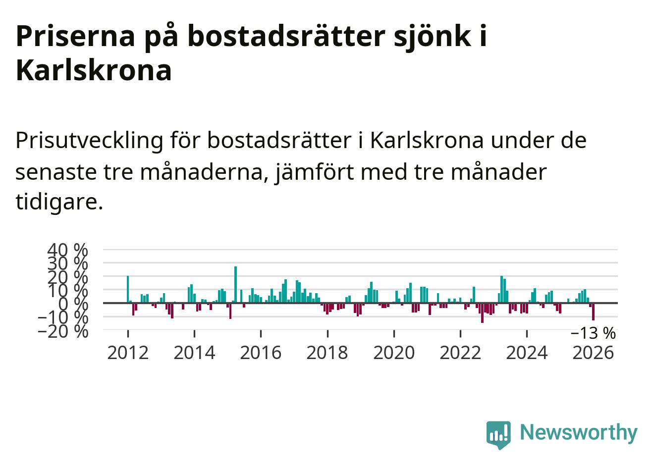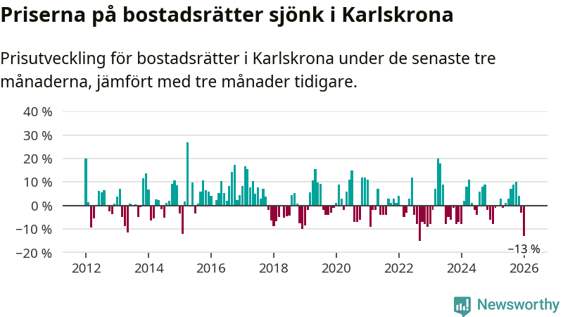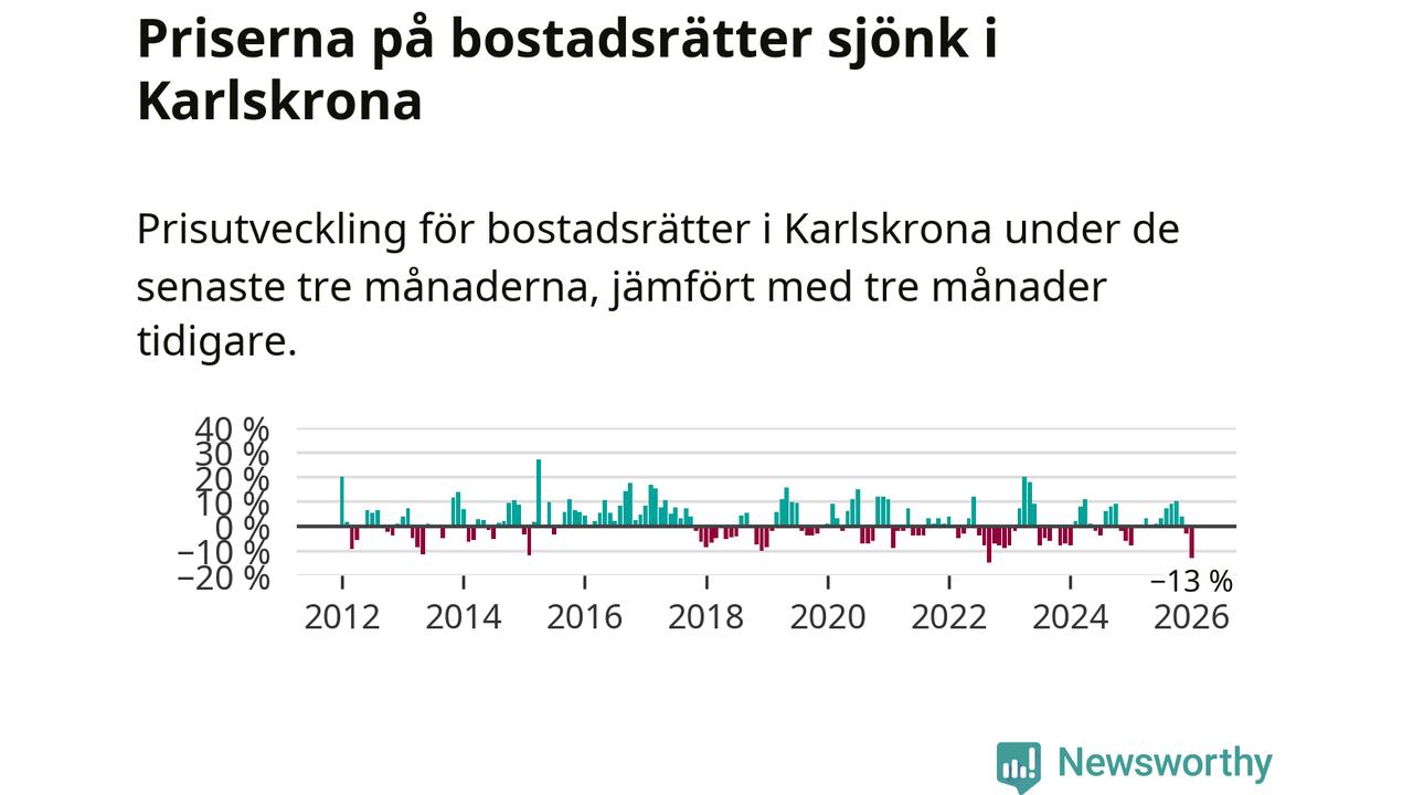 Priserna på bostadsrätter sjönk med 13 procent i Karlskrona kommun under de senaste tre månaderna. Det är den svagaste prisutvecklingen sedan 2022.