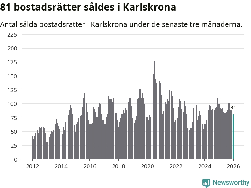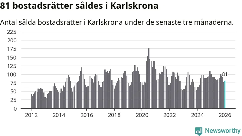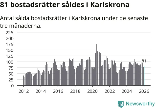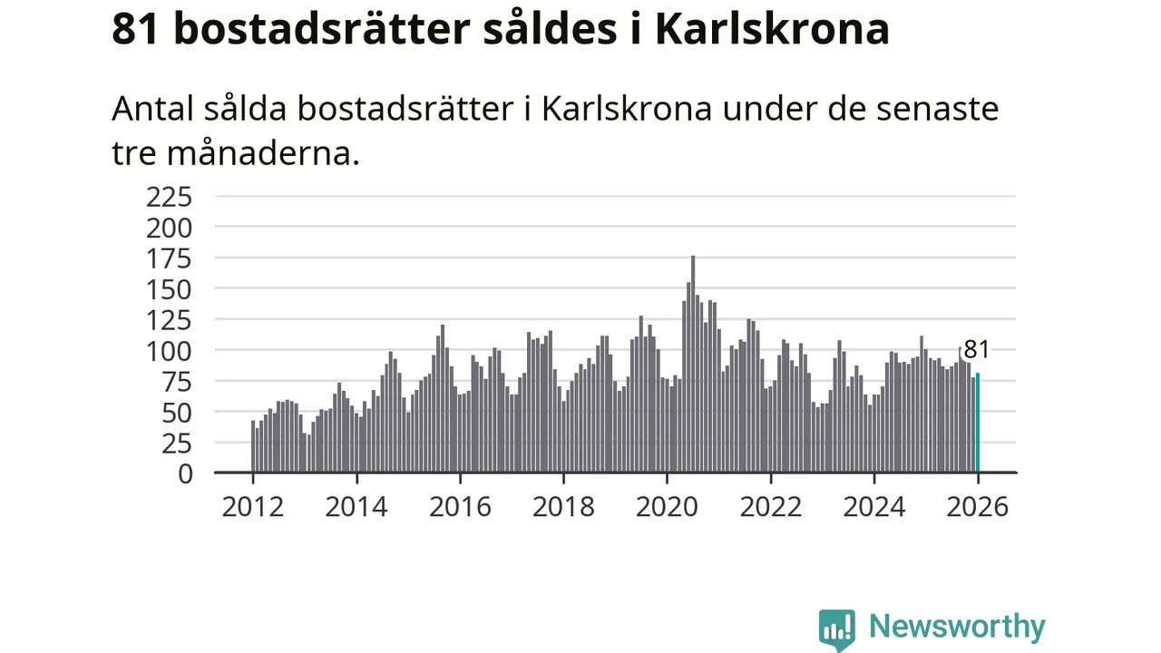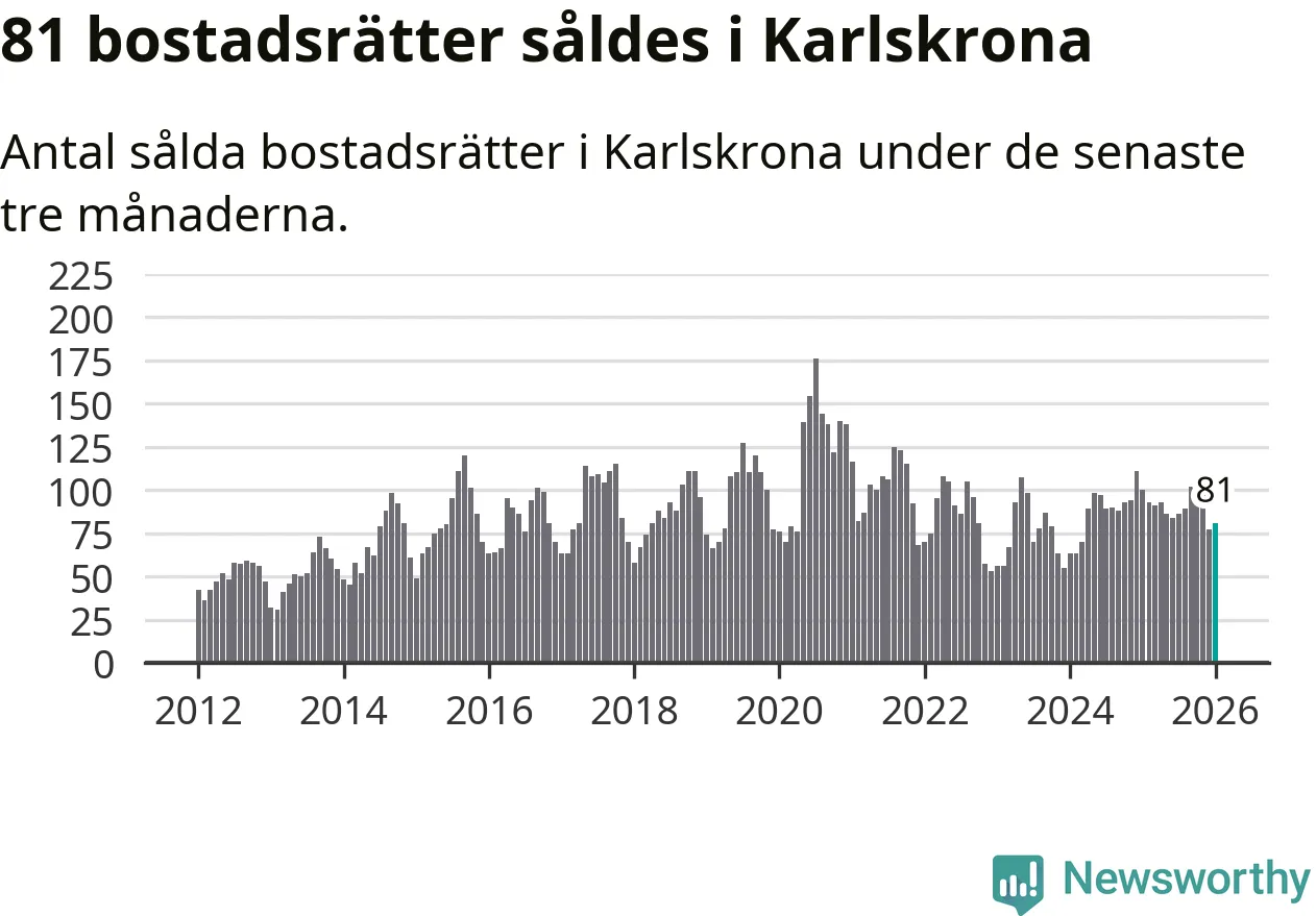 Sammanlagt såldes 81 bostadsrätter i Karlskrona kommun mellan november och januari till ett genomsnittligt pris på 1,8 miljoner kronor. I fjol gjordes 100 affärer vid den här tiden på året.