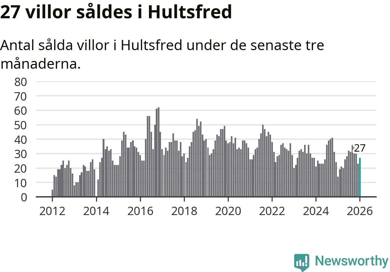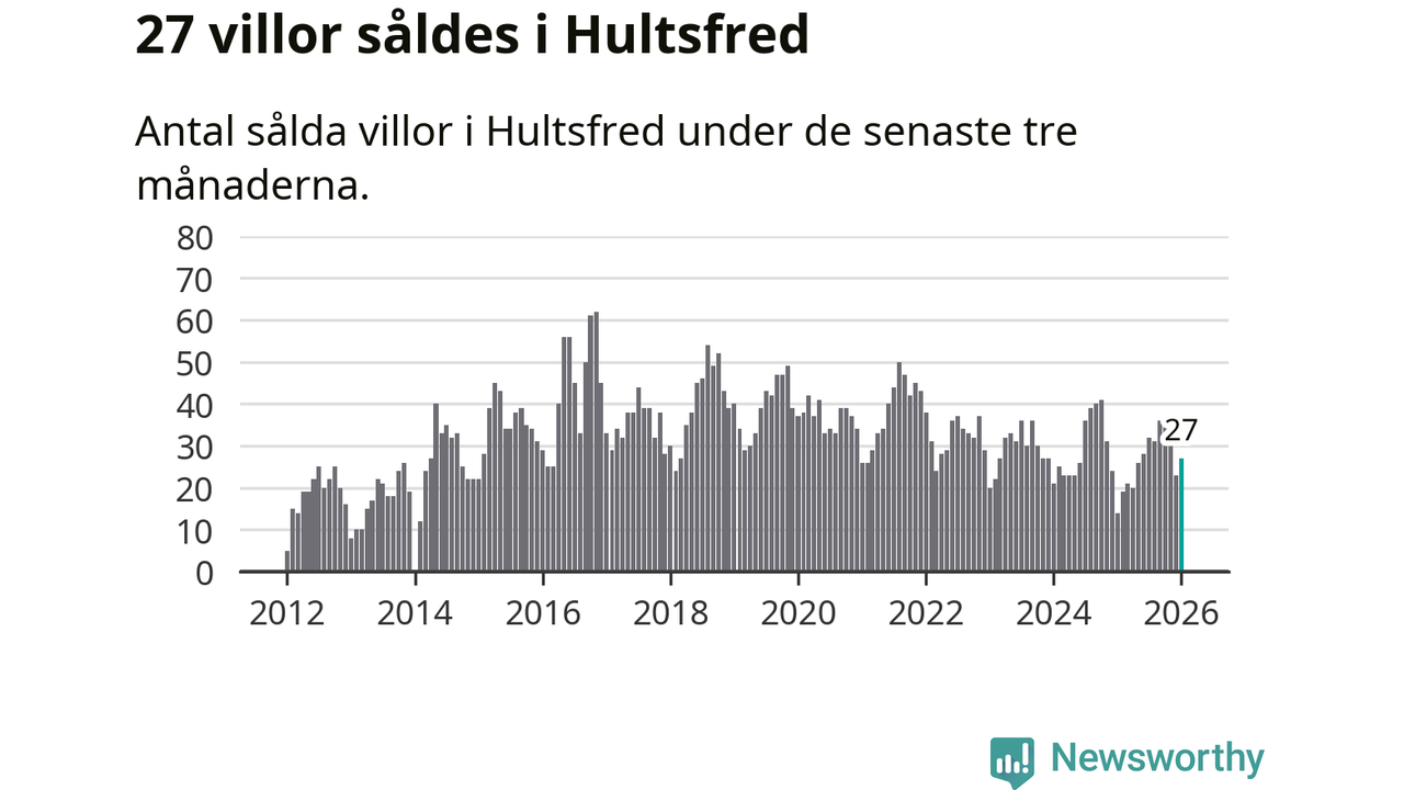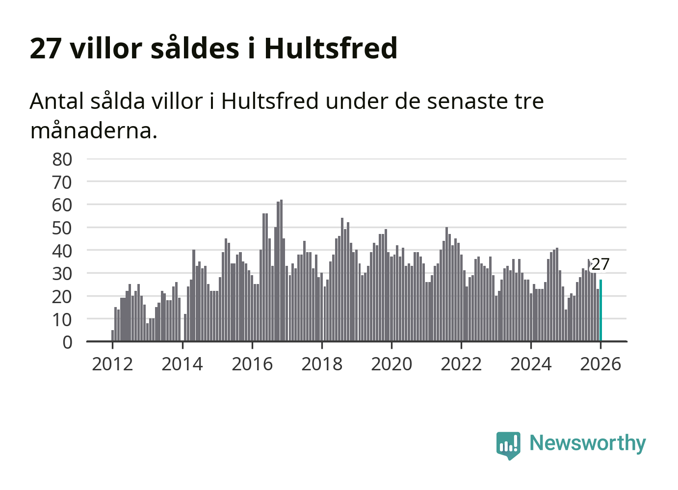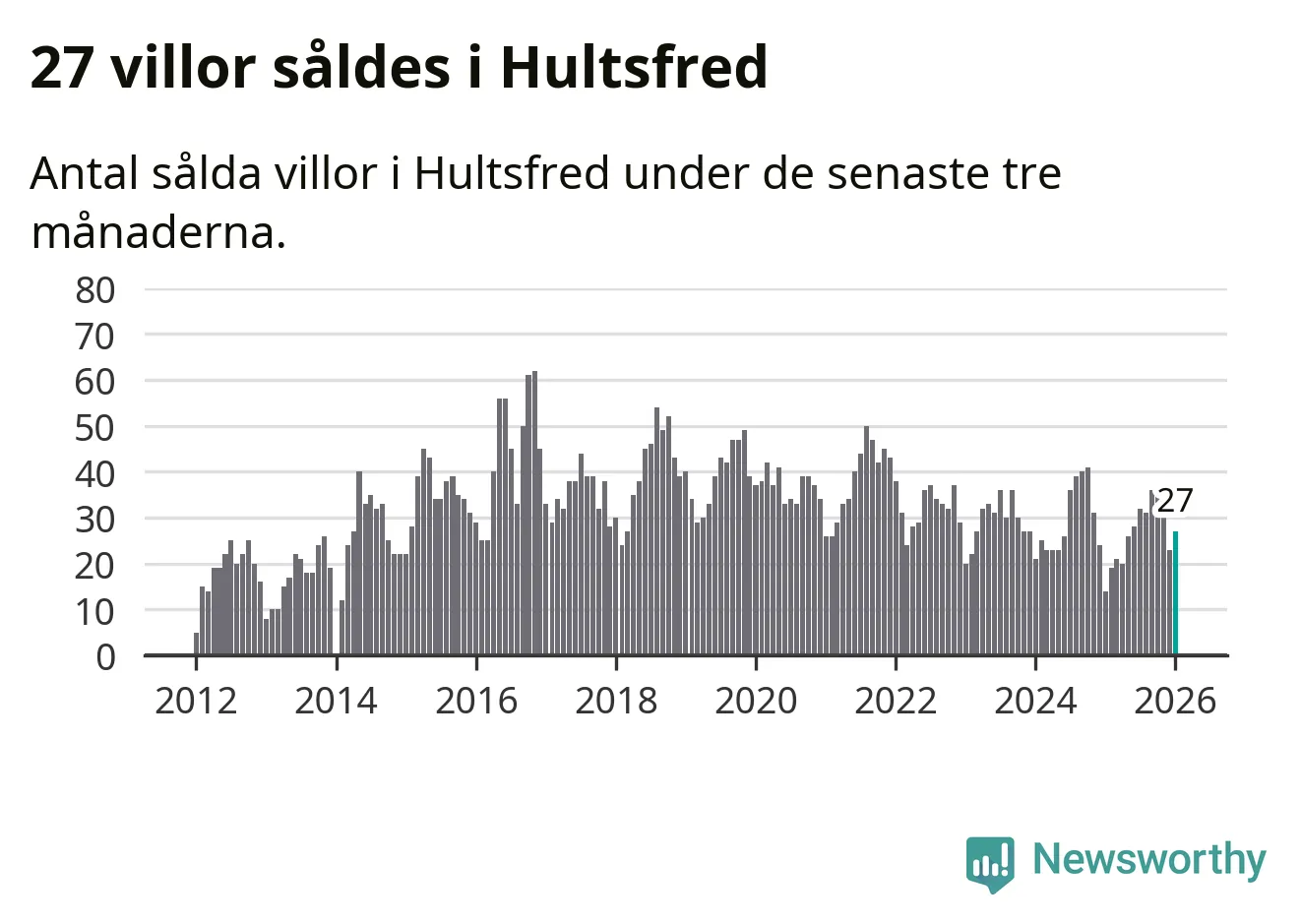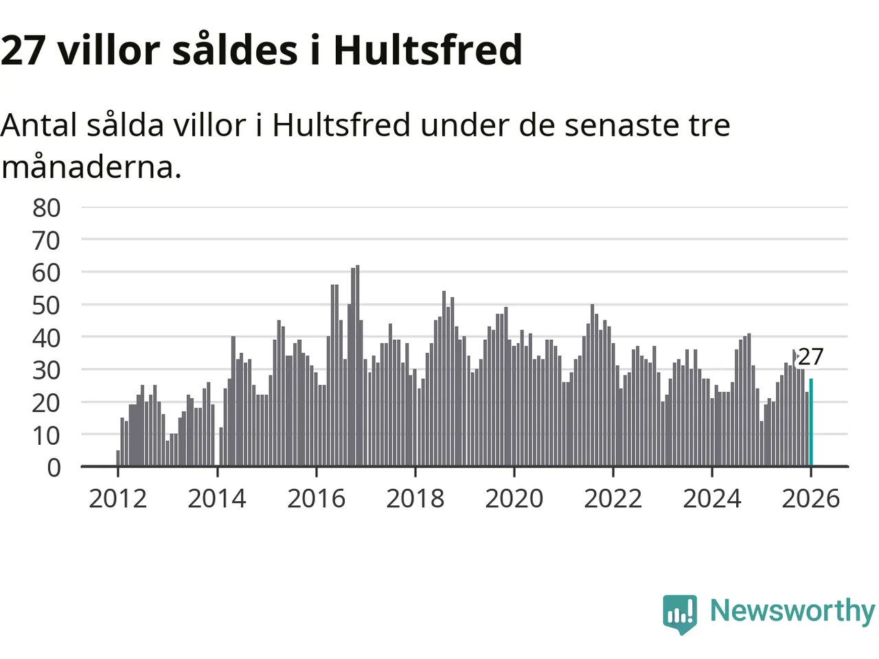 Sammanlagt såldes 27 villor i Hultsfreds kommun mellan november och januari till ett genomsnittligt pris på 1,0 miljon kronor. I fjol gjordes 14 affärer vid den här tiden på året.