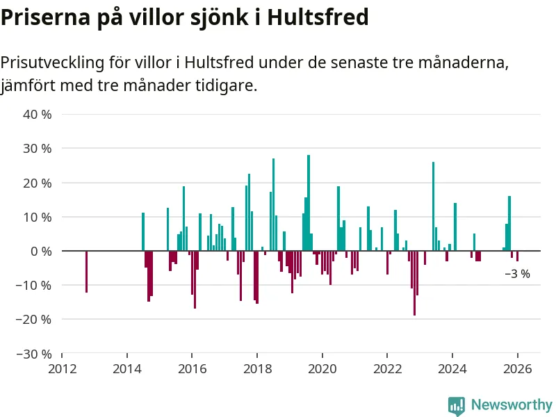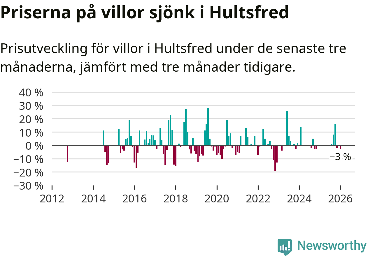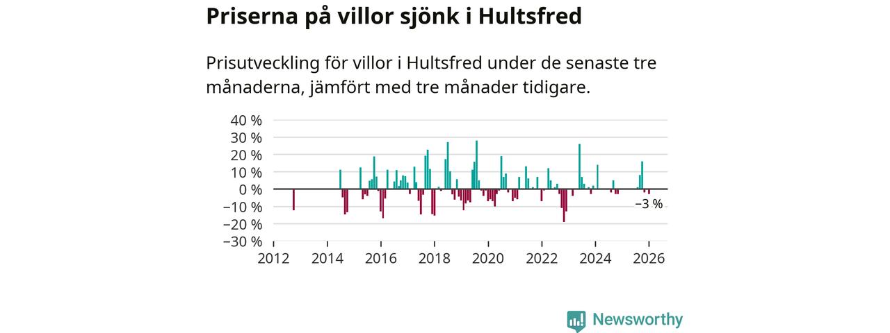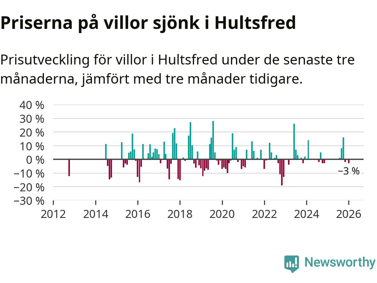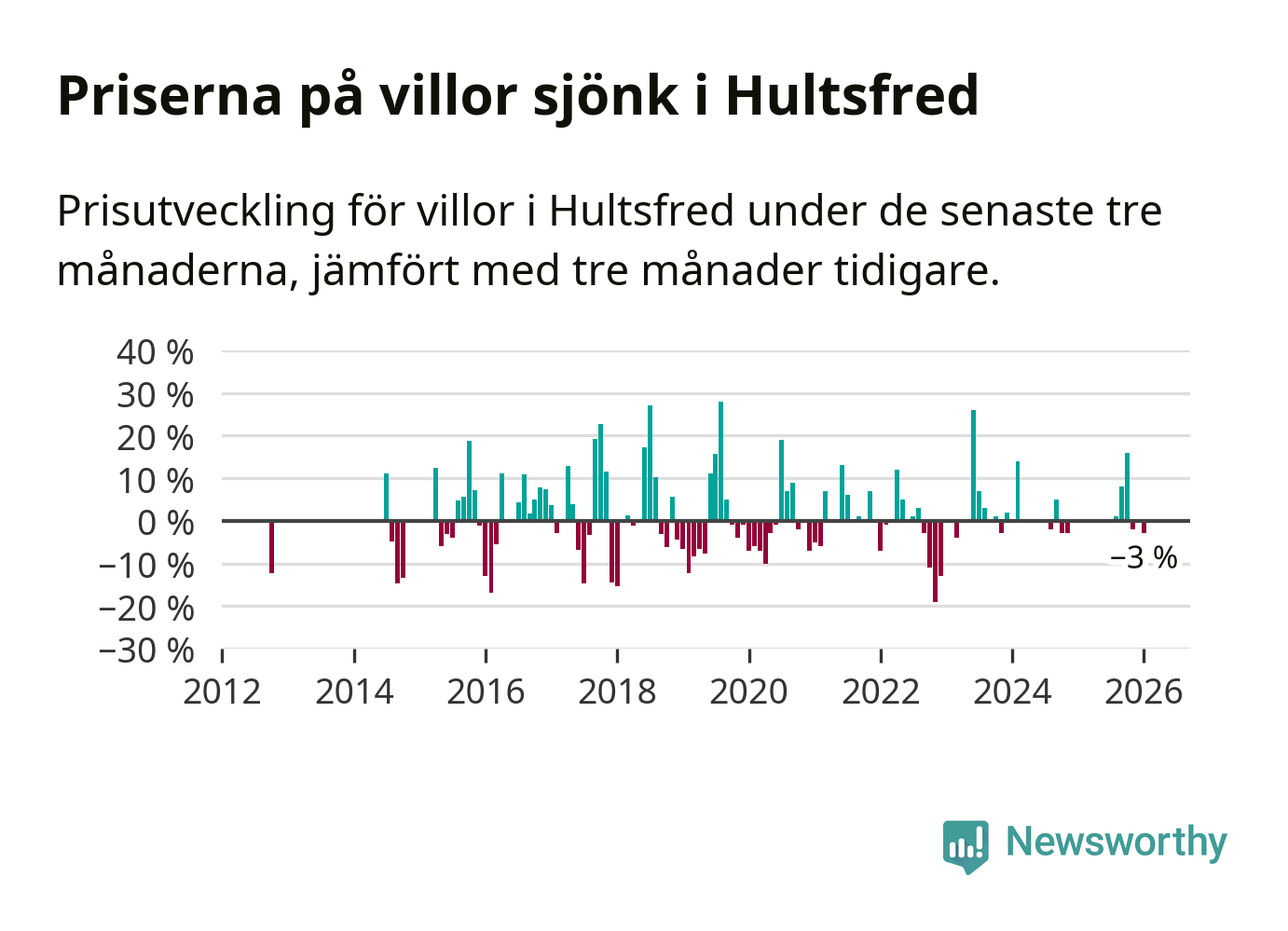 Villapriserna har gått ner i Hultsfreds kommun. Medelpriset på försäljningarna under de senaste tre månaderna visar på en nedgång med 3 procent.