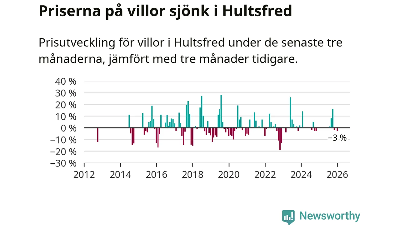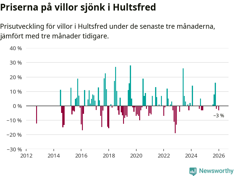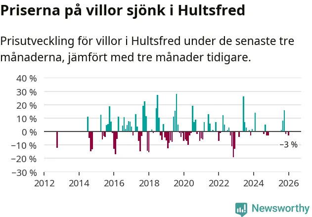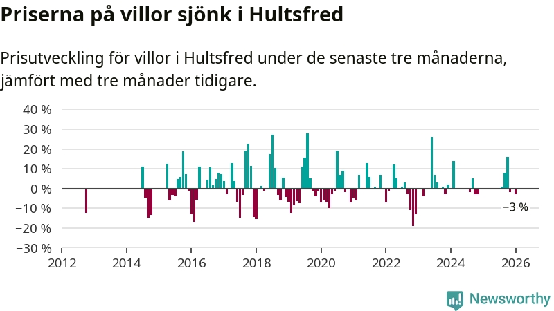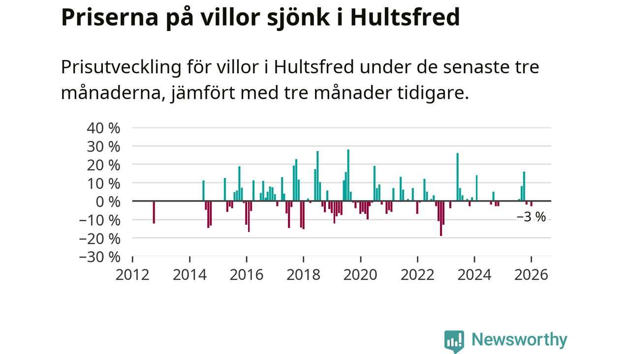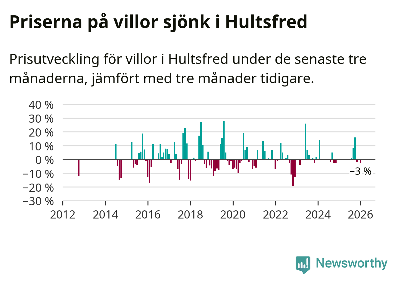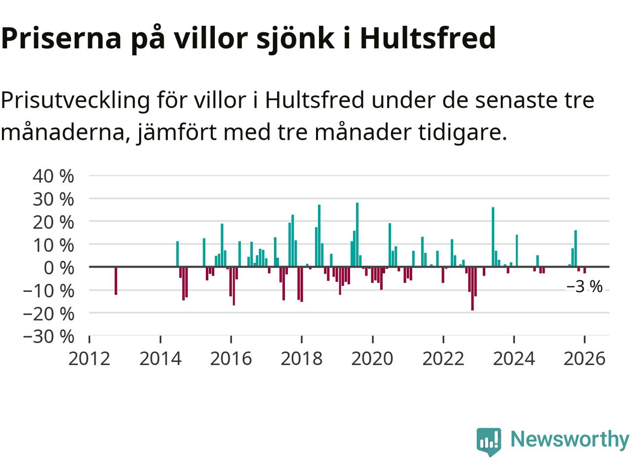 Villapriserna har gått ner i Hultsfreds kommun. Medelpriset på försäljningarna under de senaste tre månaderna visar på en nedgång med 3 procent.