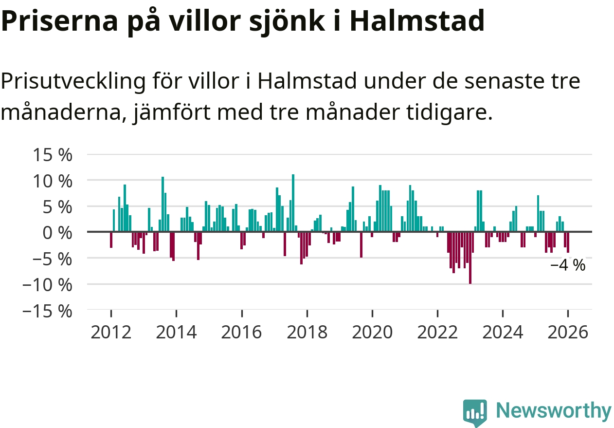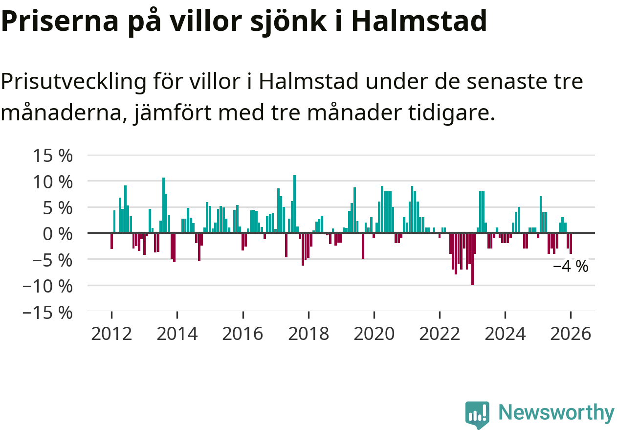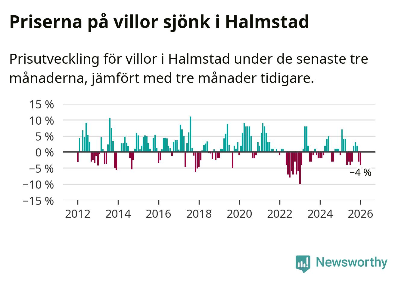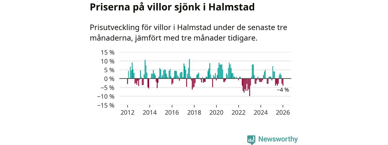 Villapriserna har gått ner i Halmstads kommun. Medelpriset på försäljningarna under de senaste tre månaderna visar på en nedgång med 4 procent.