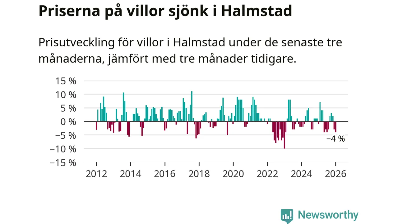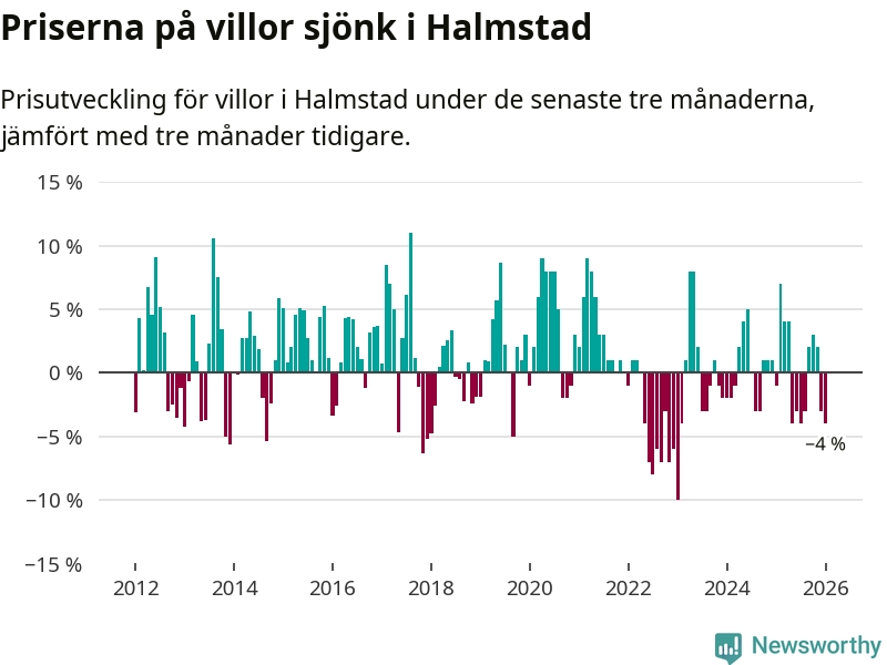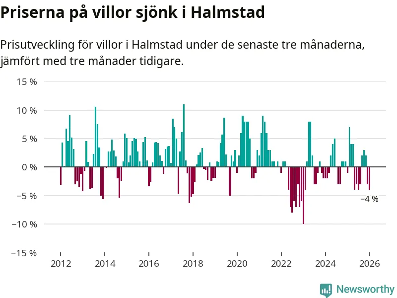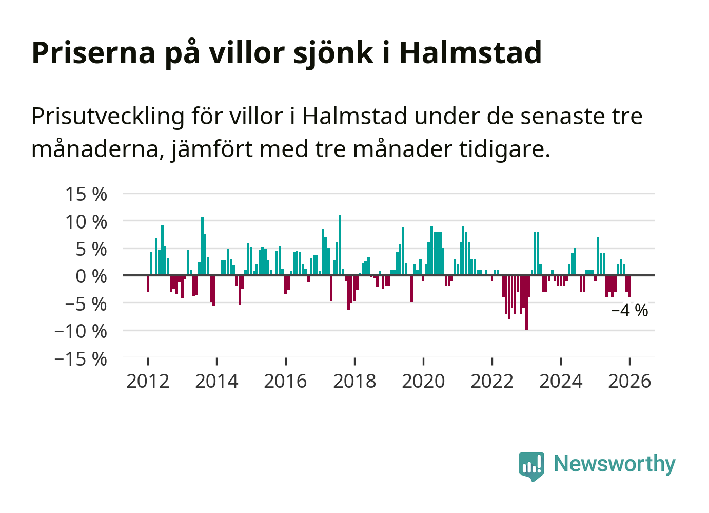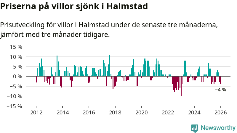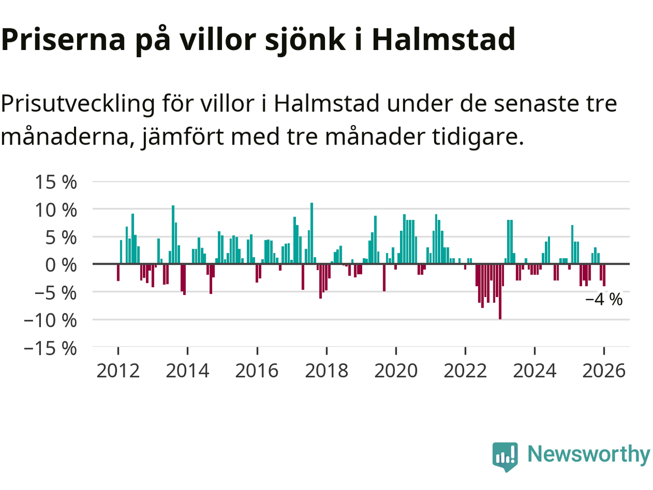Villapriserna har gått ner i Halmstads kommun. Medelpriset på försäljningarna under de senaste tre månaderna visar på en nedgång med 4 procent.