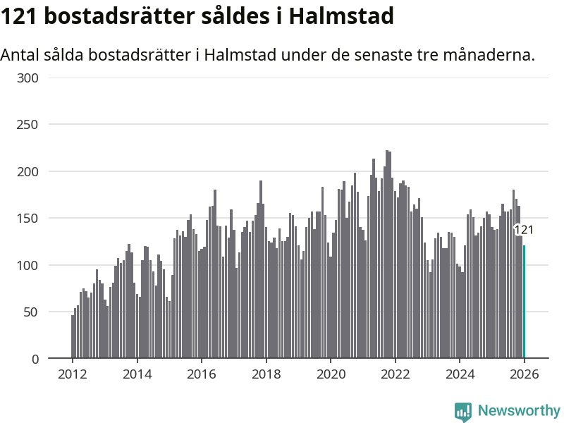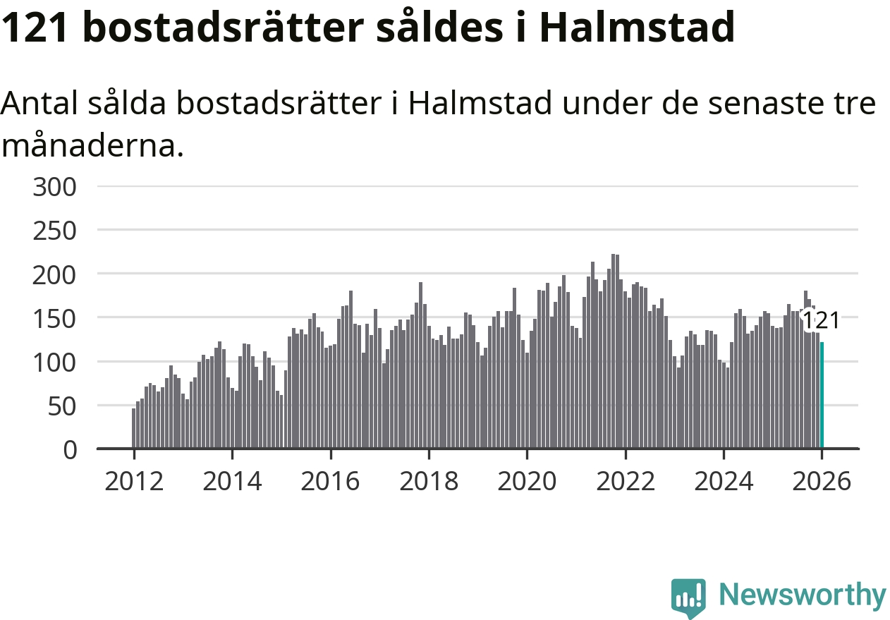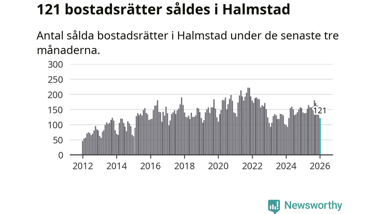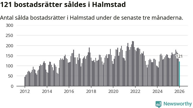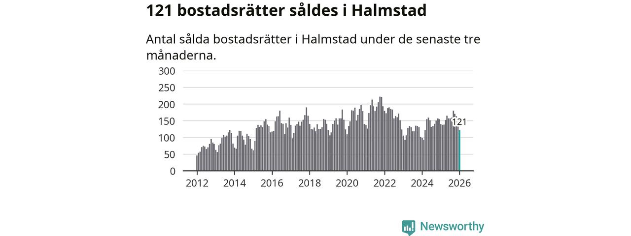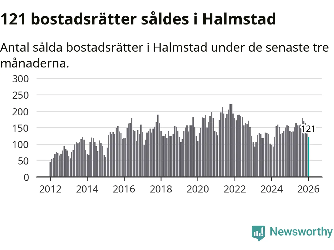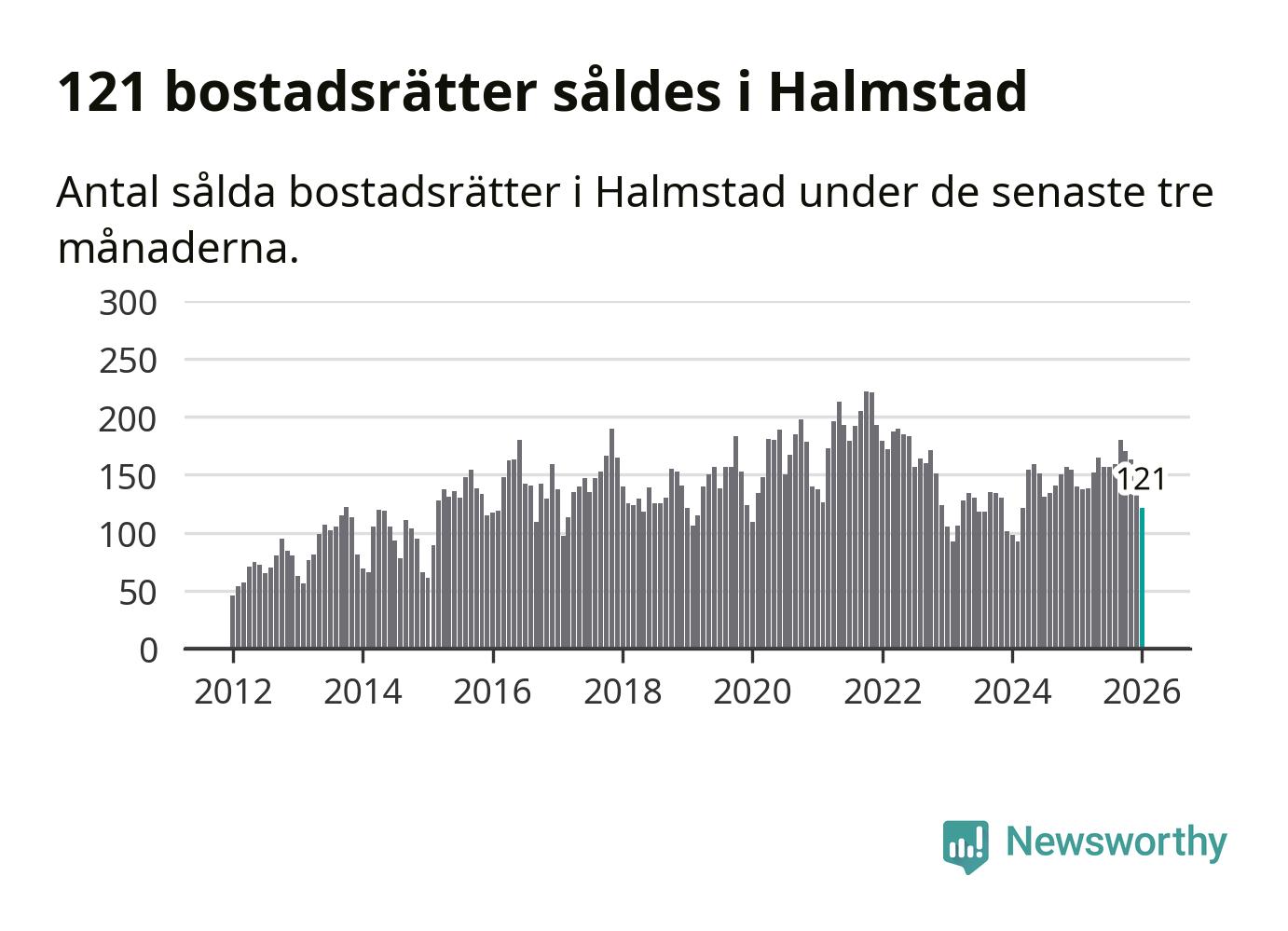 Sammanlagt såldes 121 bostadsrätter i Halmstads kommun mellan november och januari till ett genomsnittligt pris på 2,2 miljoner kronor. I fjol gjordes 140 affärer vid den här tiden på året.