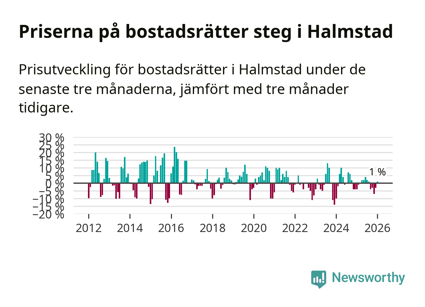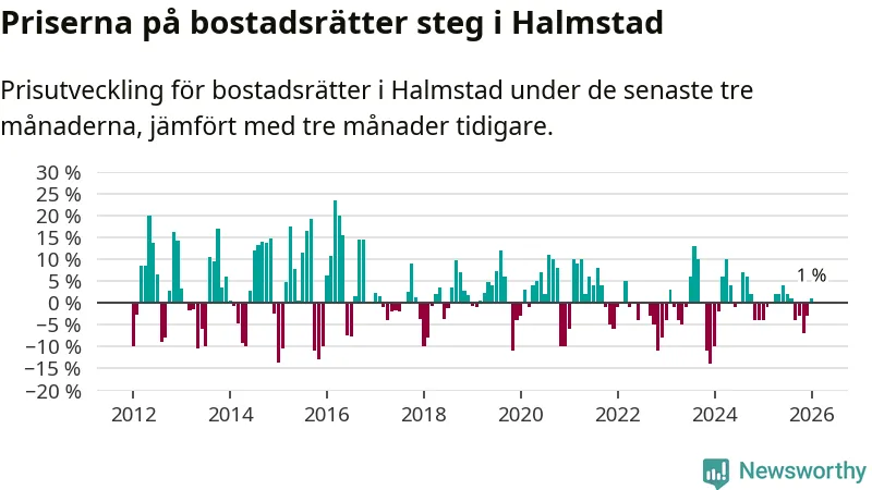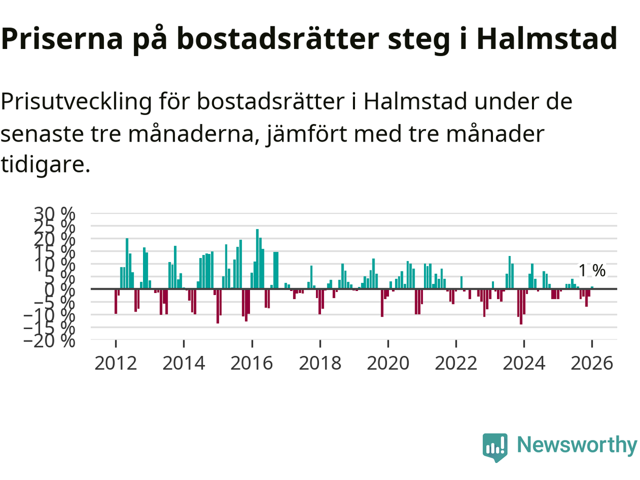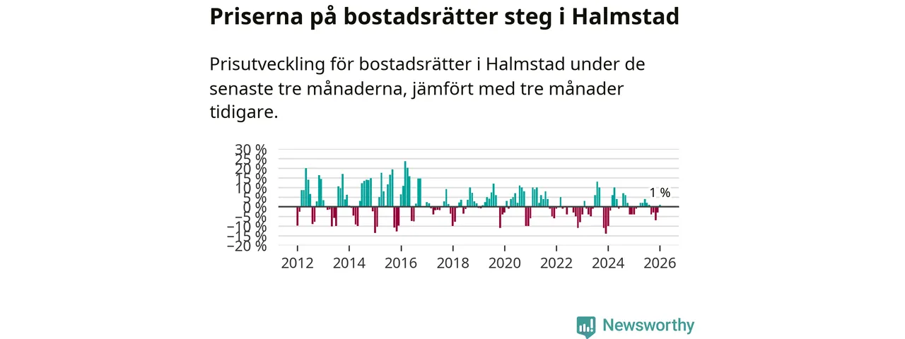 Priserna på bostadsrätter har gått upp i Halmstads kommun. Medelpriset på försäljningarna under de senaste tre månaderna visar på en uppgång med 1 procent.