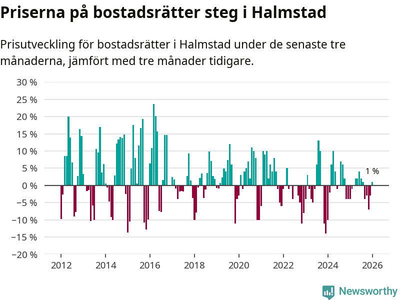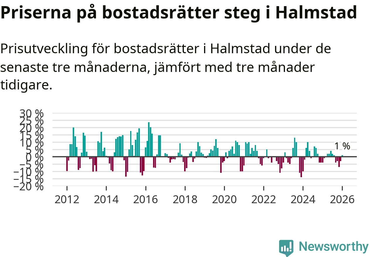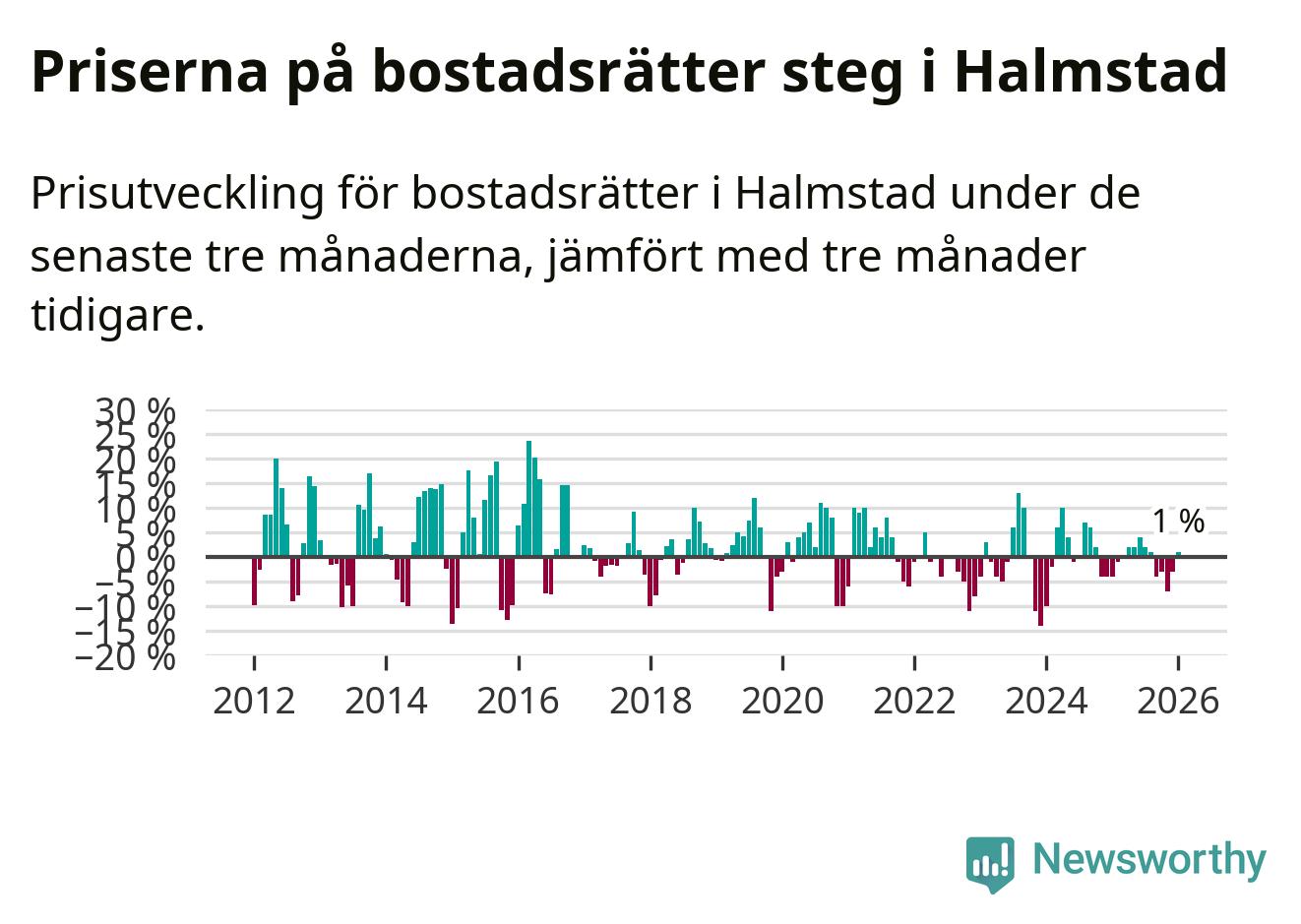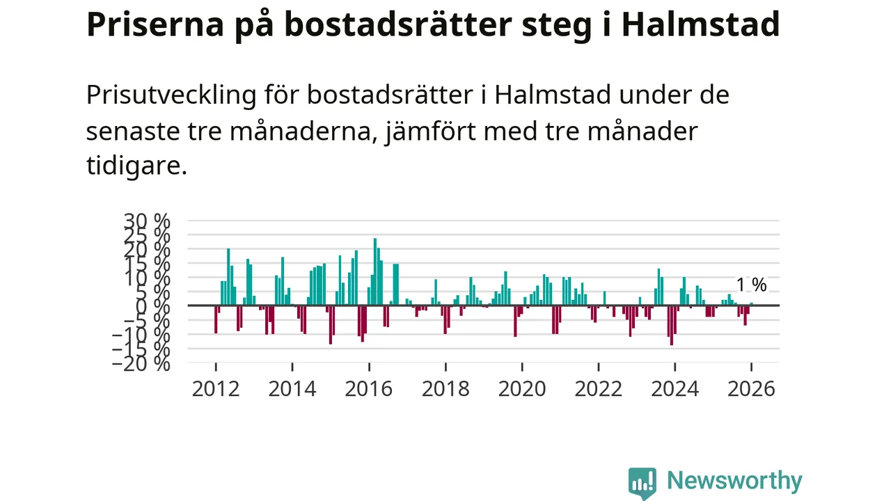 Priserna på bostadsrätter har gått upp i Halmstads kommun. Medelpriset på försäljningarna under de senaste tre månaderna visar på en uppgång med 1 procent.