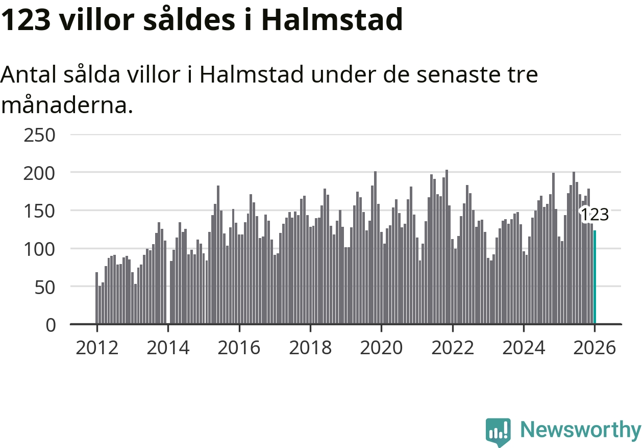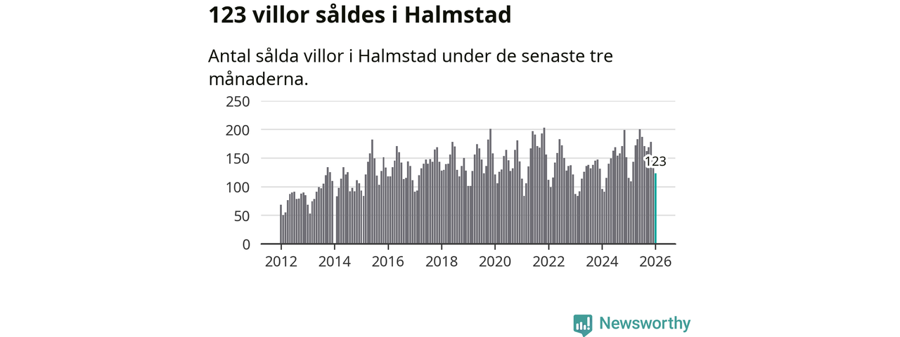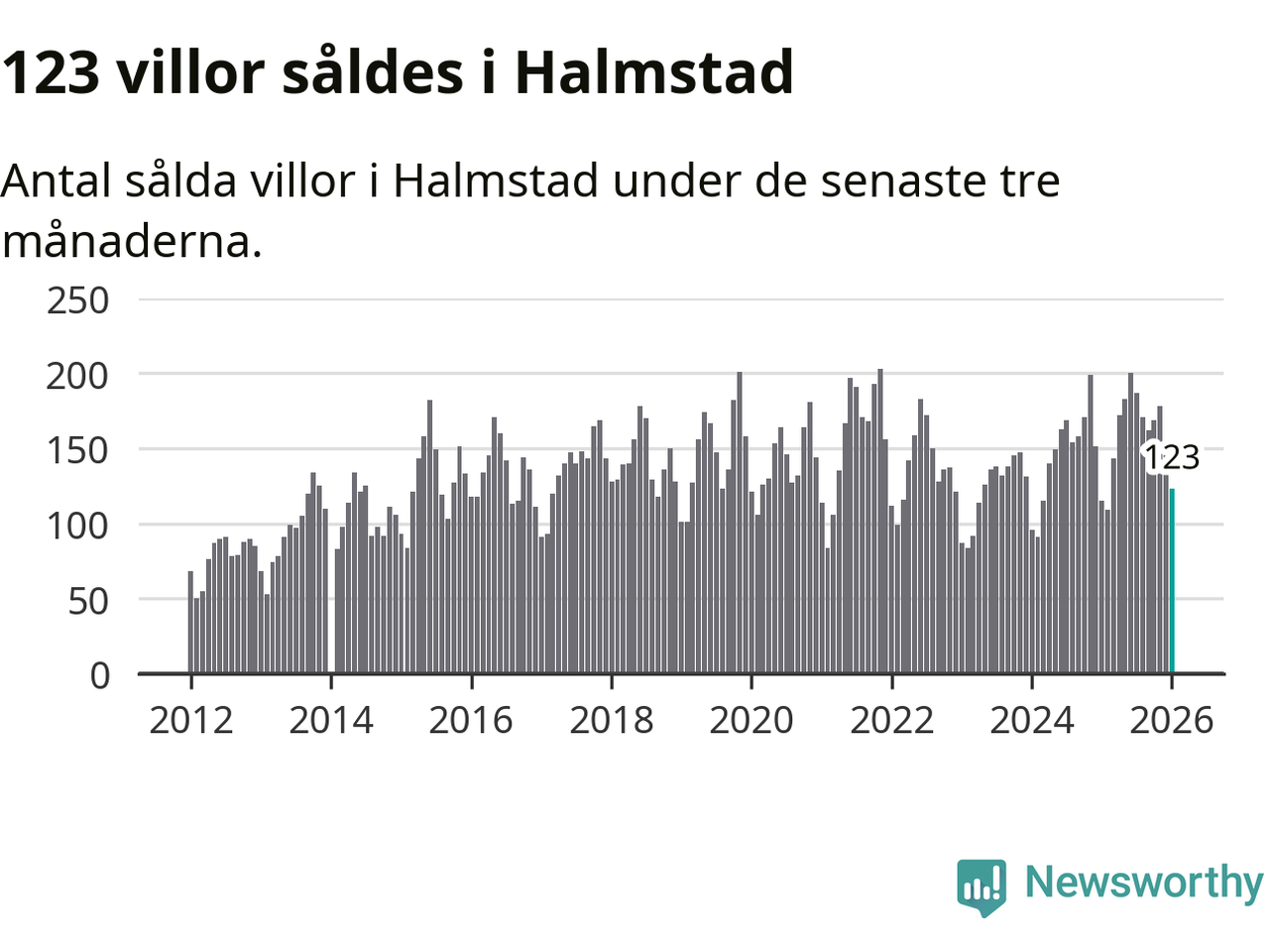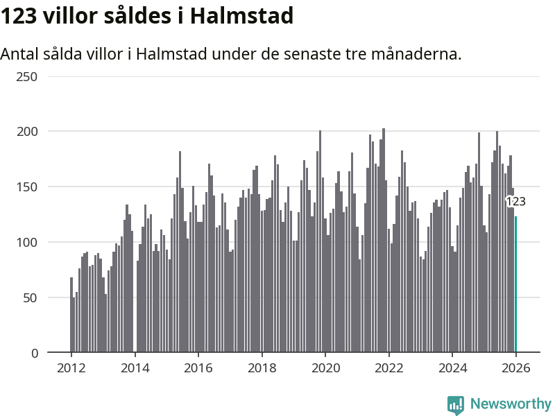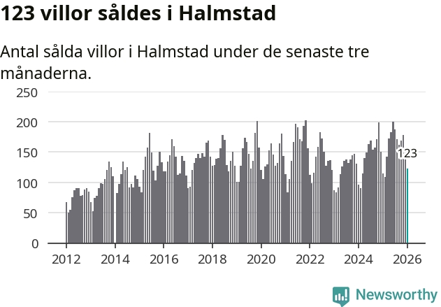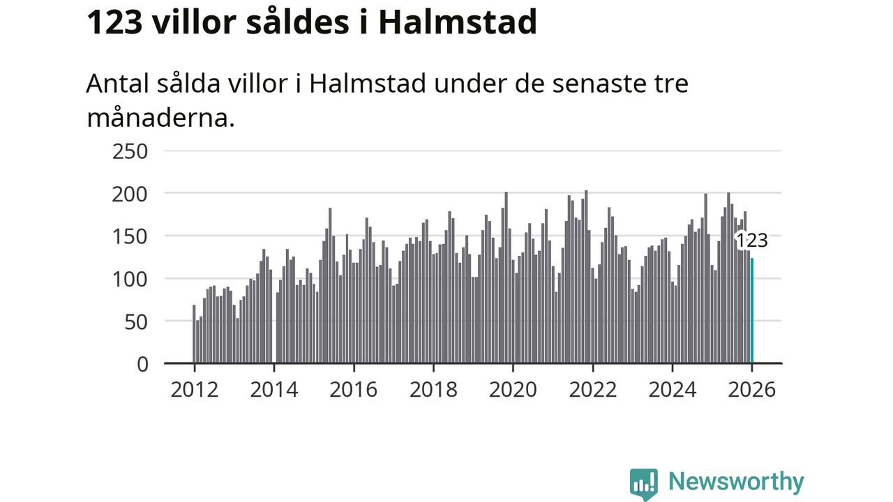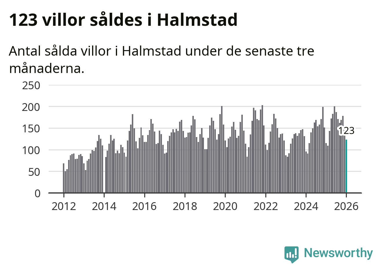 Sammanlagt såldes 123 villor i Halmstads kommun mellan november och januari till ett genomsnittligt pris på 4,1 miljoner kronor. I fjol gjordes 115 affärer vid den här tiden på året.