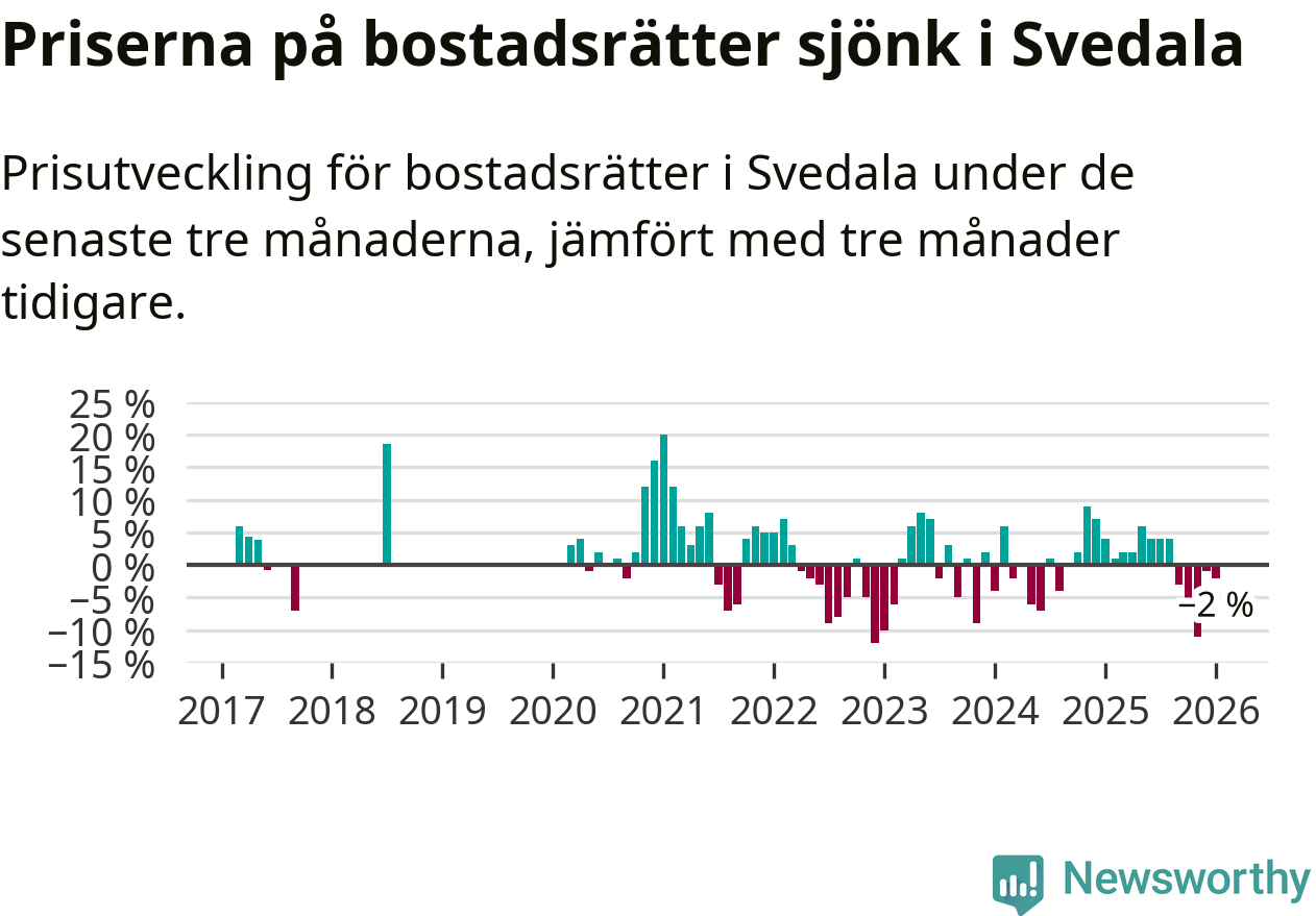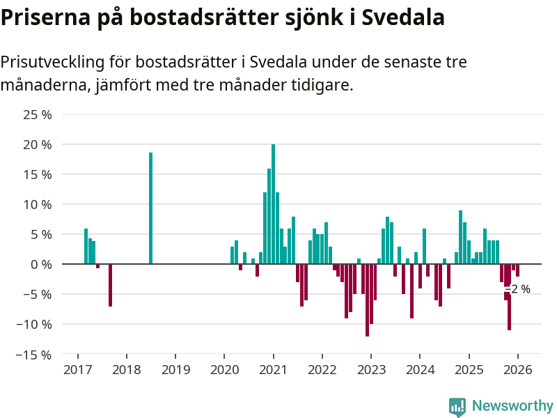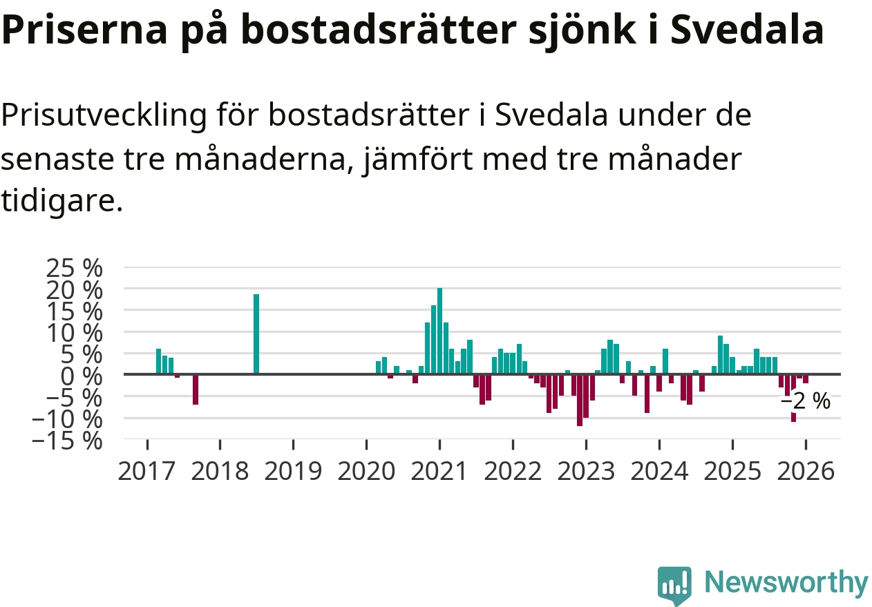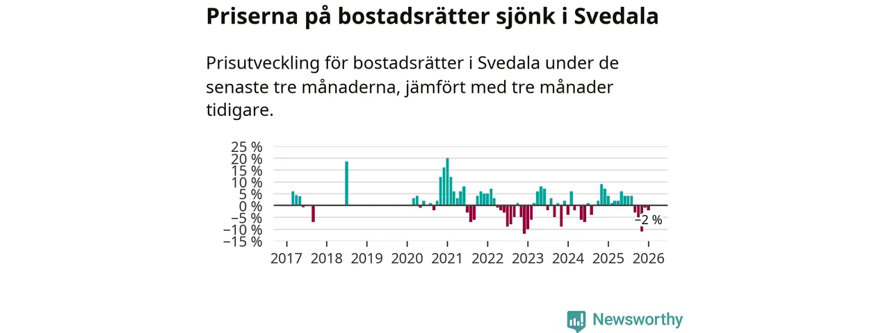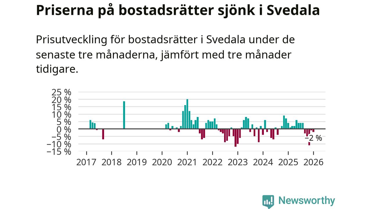 Priserna på bostadsrätter har gått ner i Svedala kommun. Medelpriset på försäljningarna under de senaste tre månaderna visar på en nedgång med 2 procent.