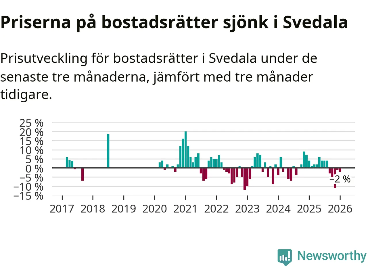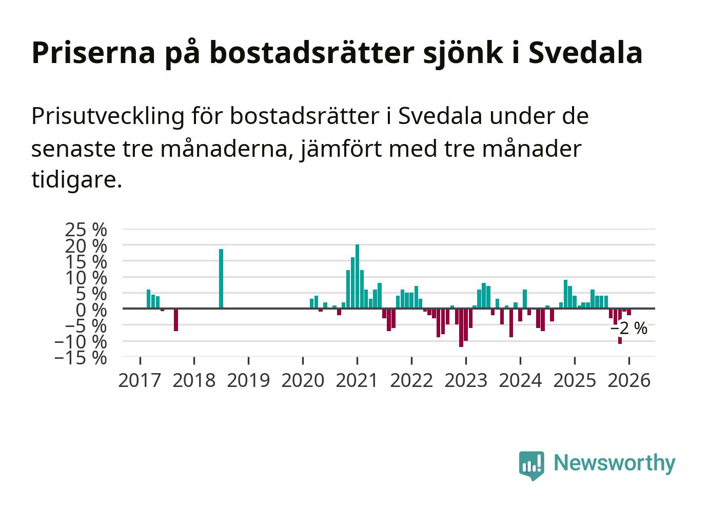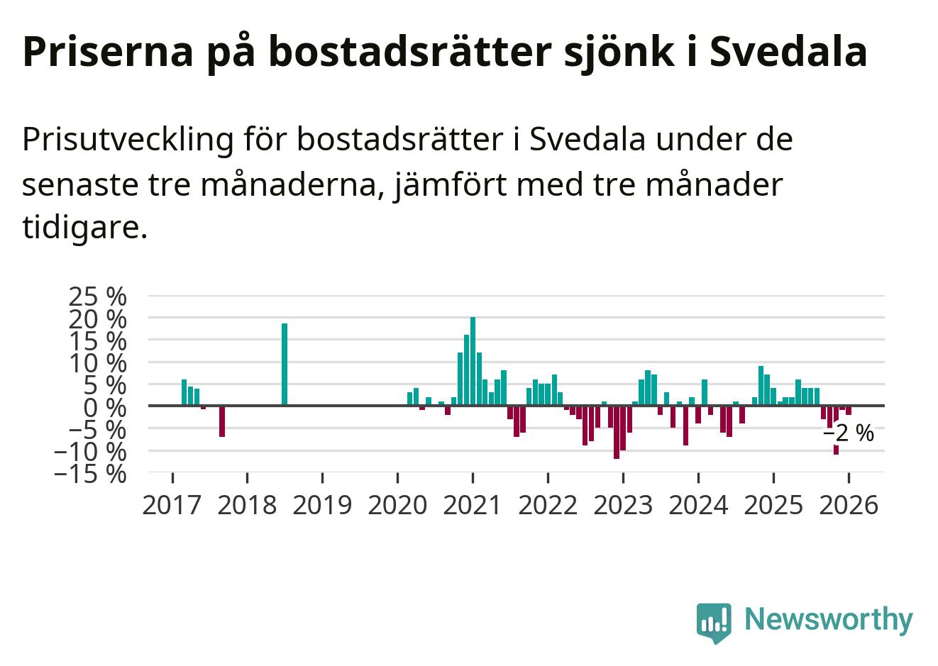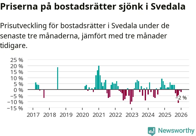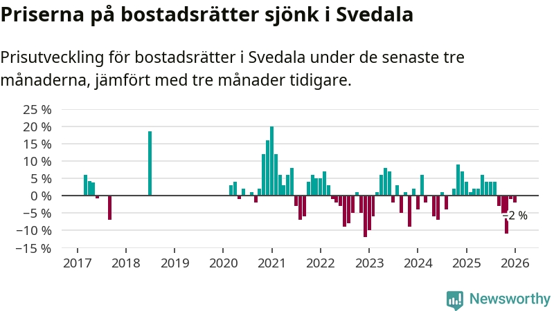 Priserna på bostadsrätter har gått ner i Svedala kommun. Medelpriset på försäljningarna under de senaste tre månaderna visar på en nedgång med 2 procent.