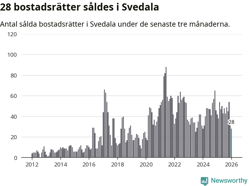 Sammanlagt såldes 28 bostadsrätter i Svedala kommun mellan november och januari till ett genomsnittligt pris på 2,1 miljoner kronor. I fjol gjordes 42 affärer vid den här tiden på året.