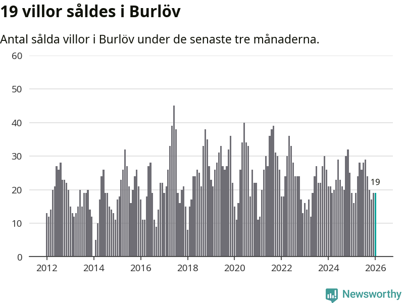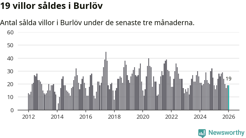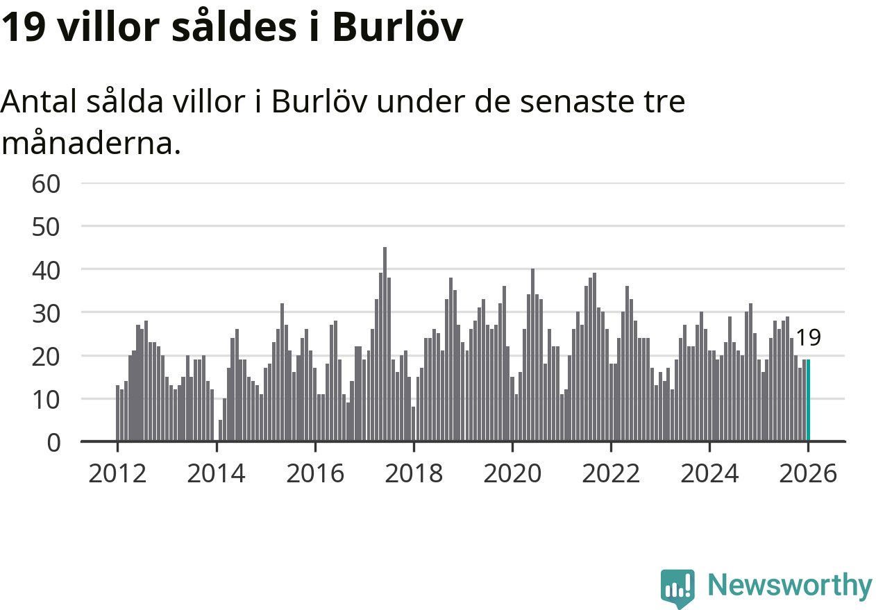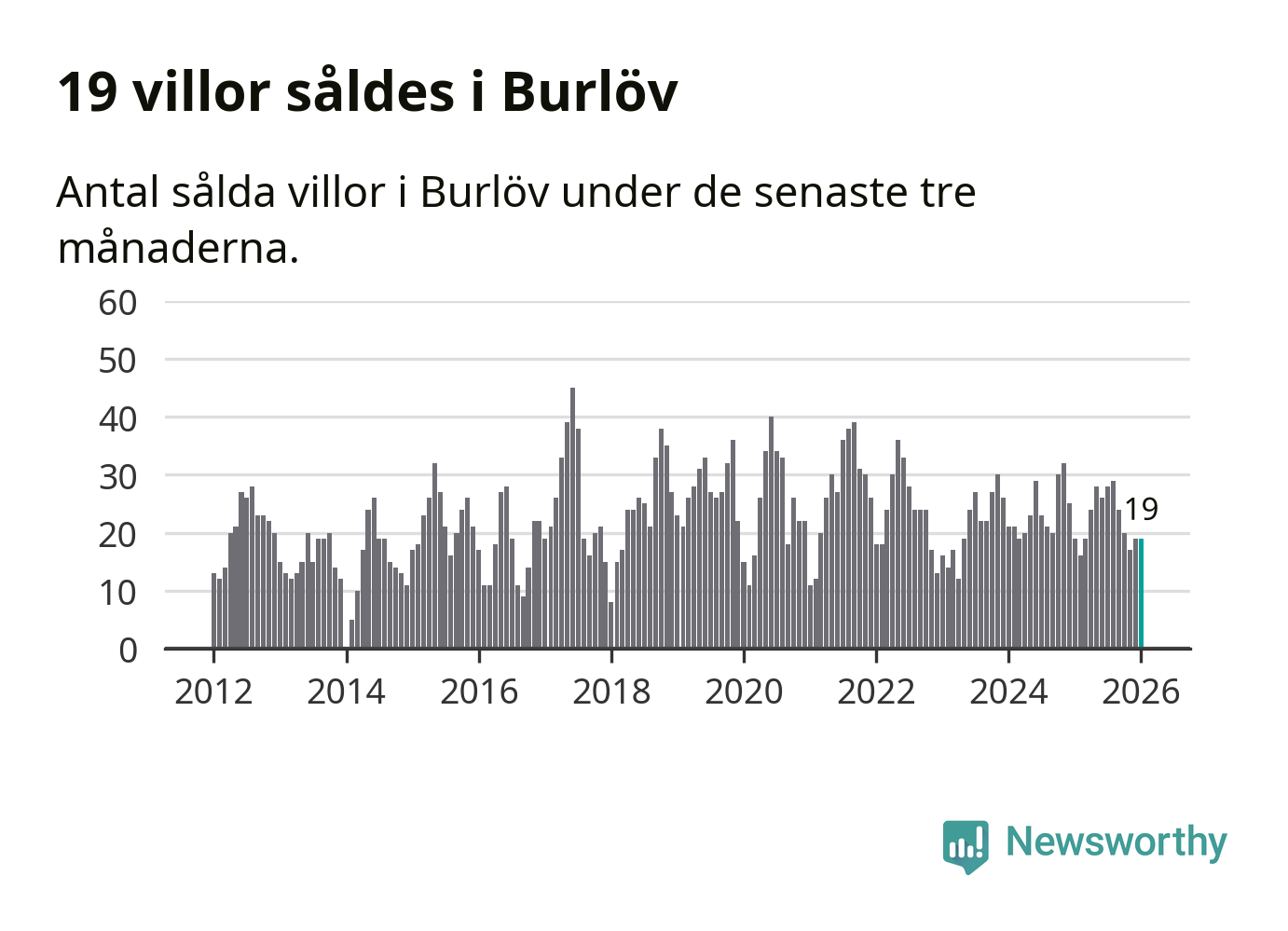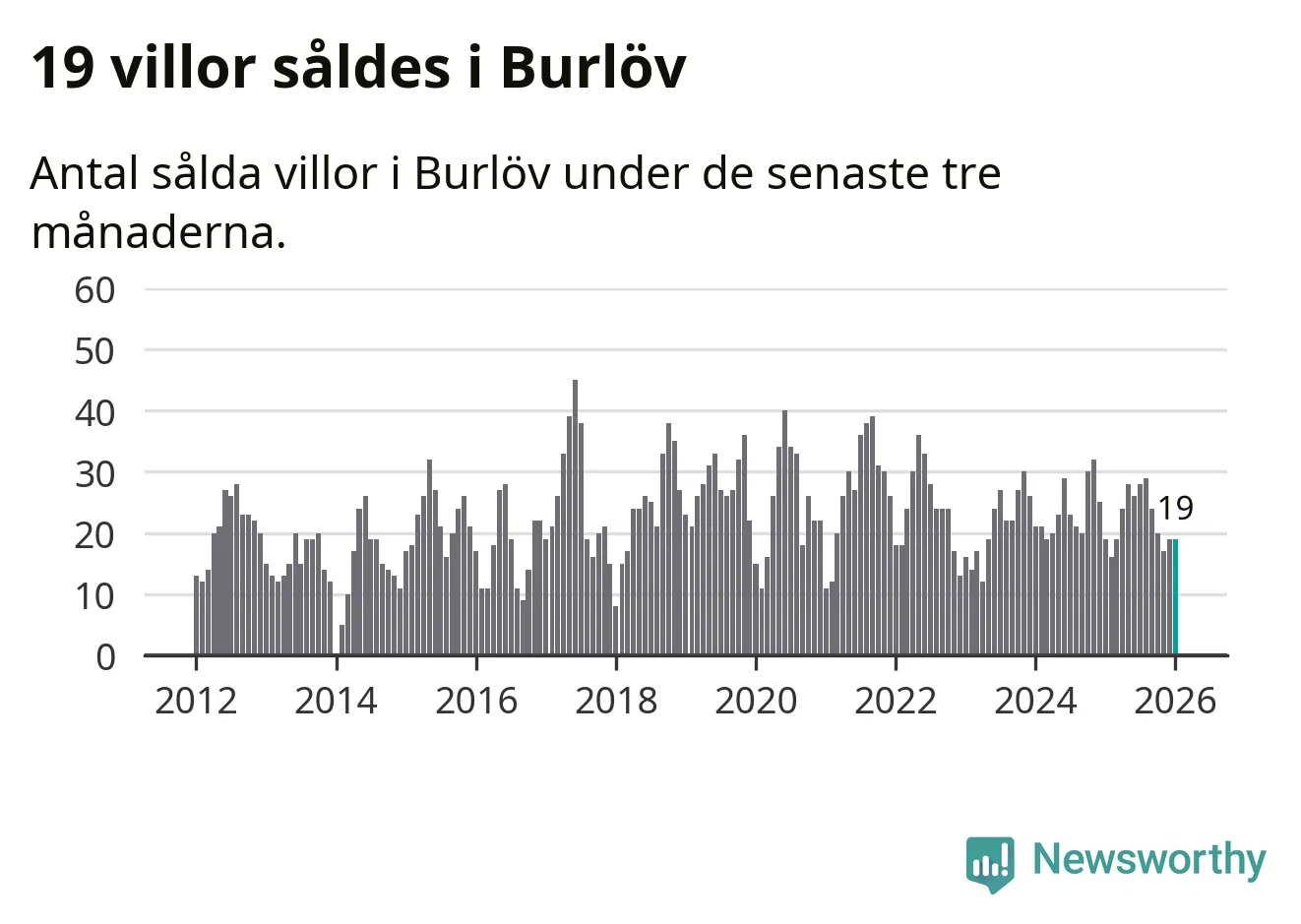 Mellan november och januari gjordes sammanlagt 19 affärer med villor i Burlövs kommun. Det är lika många affärer som vid motsvarande tid i fjol.