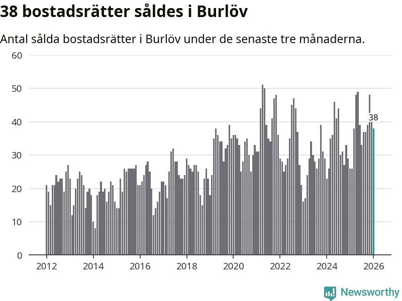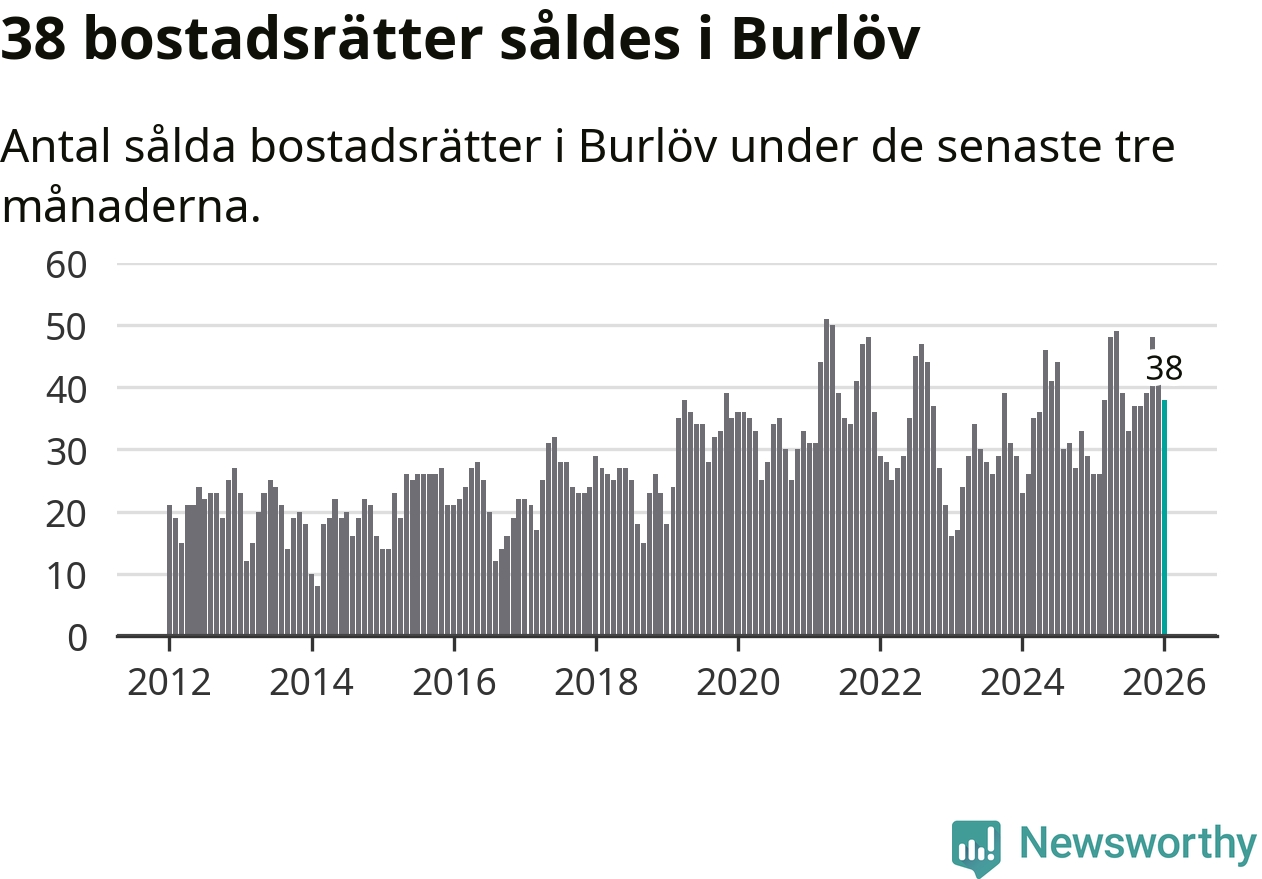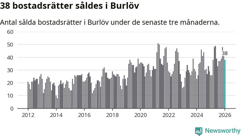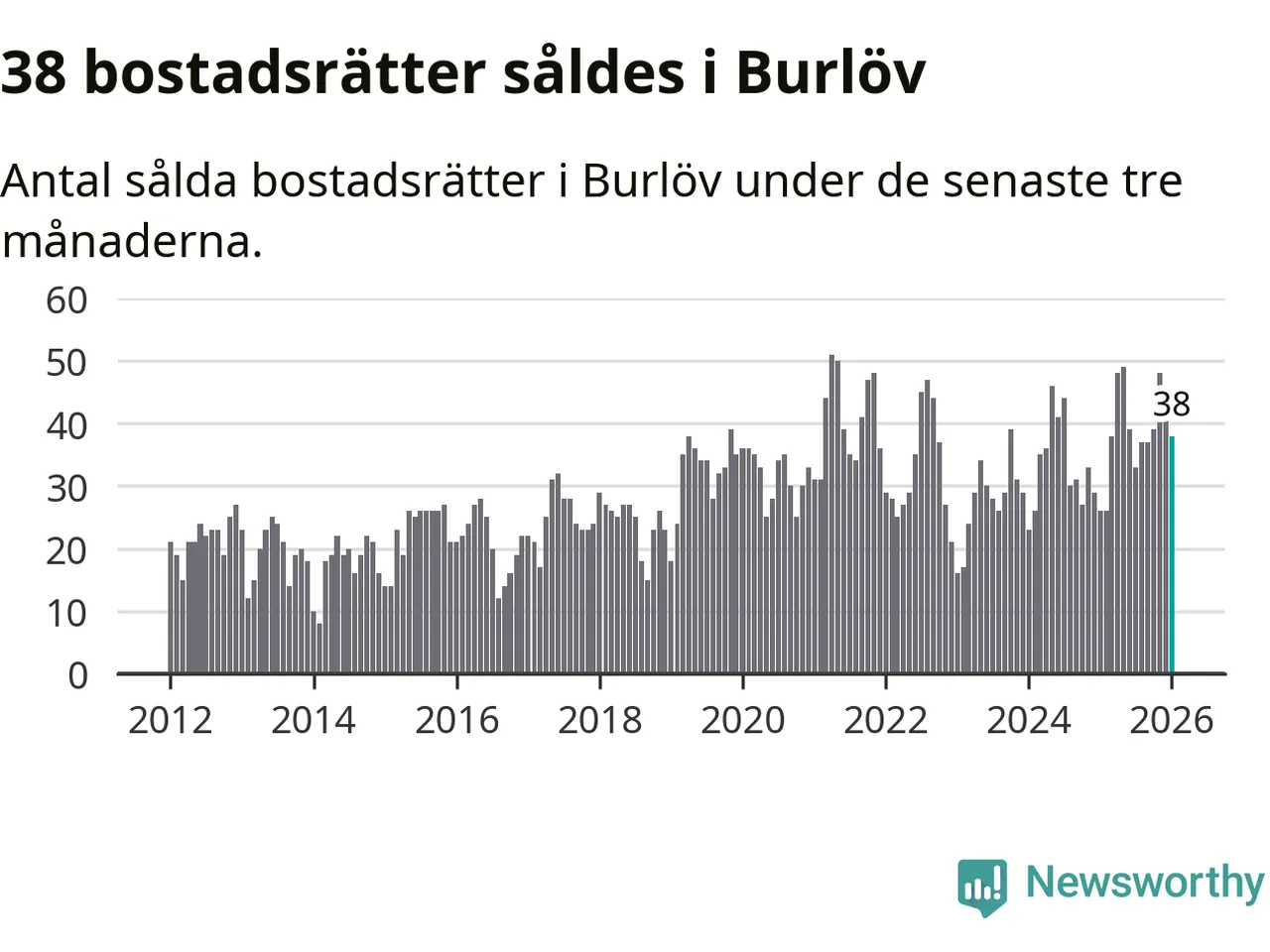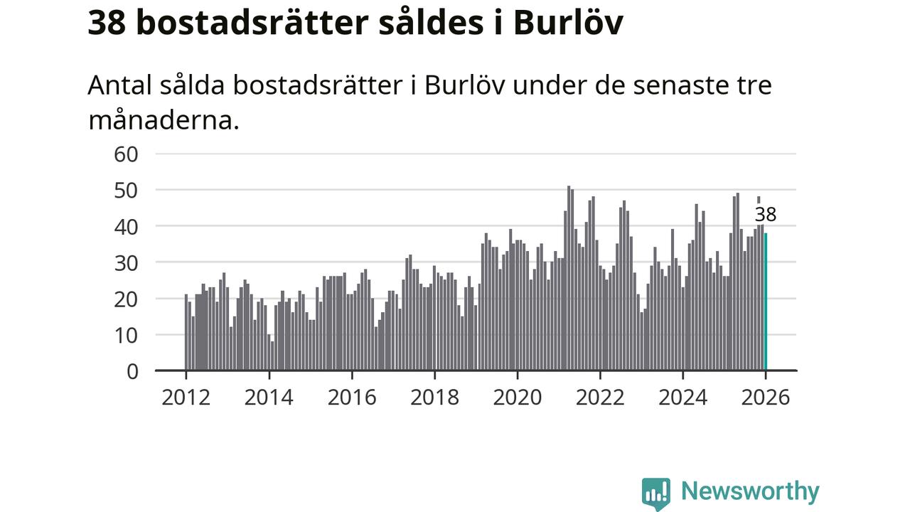 Sammanlagt såldes 38 bostadsrätter i Burlövs kommun mellan november och januari till ett genomsnittligt pris på 2,4 miljoner kronor. I fjol gjordes 26 affärer vid den här tiden på året.