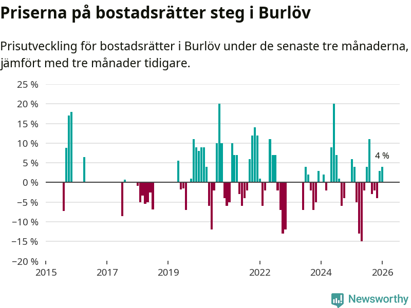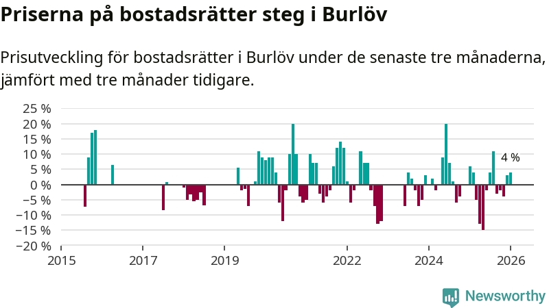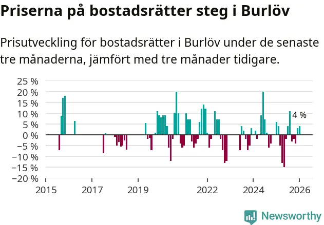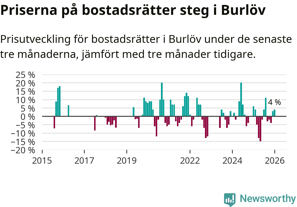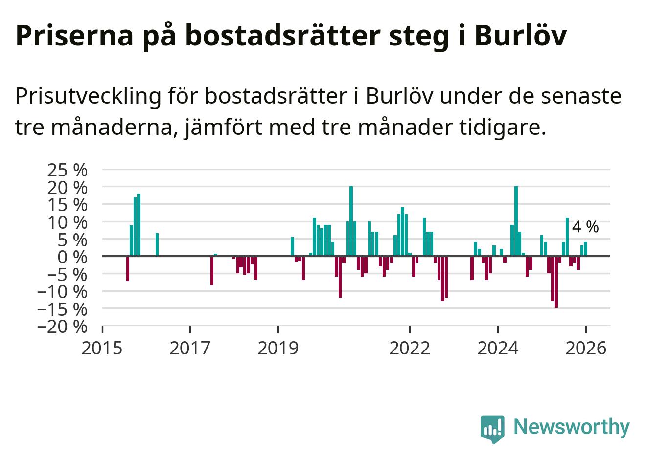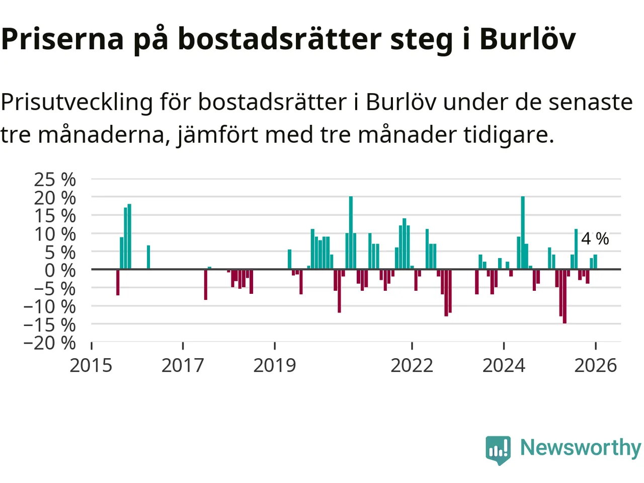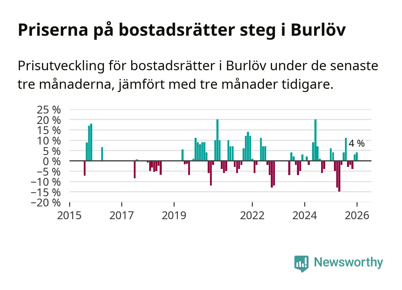 Priserna på bostadsrätter har gått upp i Burlövs kommun. Medelpriset på försäljningarna under de senaste tre månaderna visar på en uppgång med 4 procent.