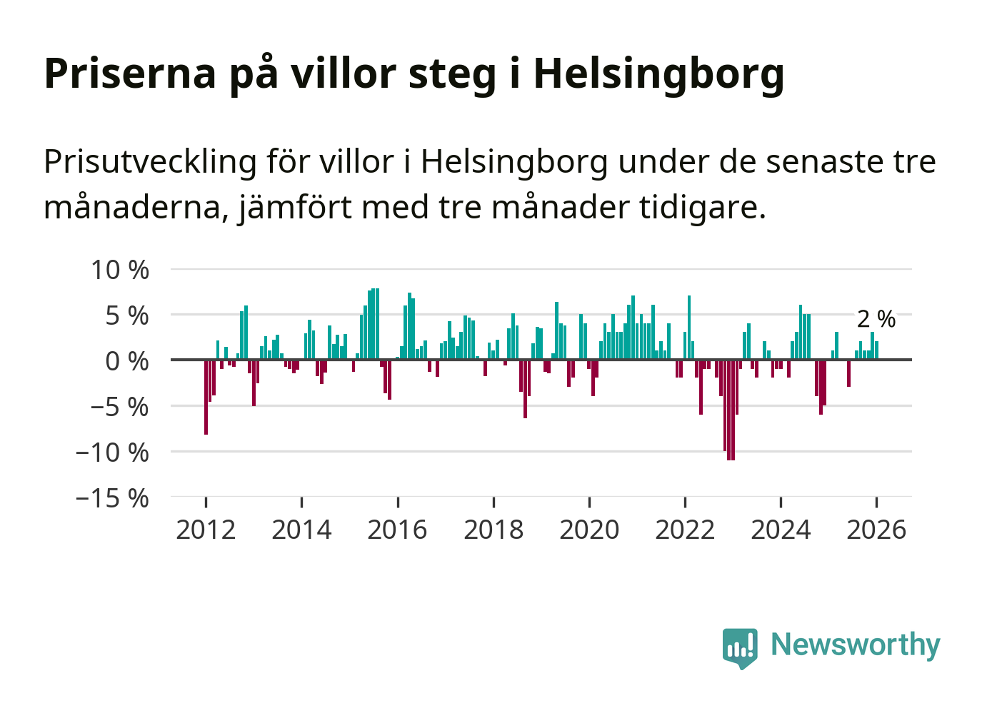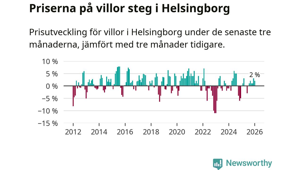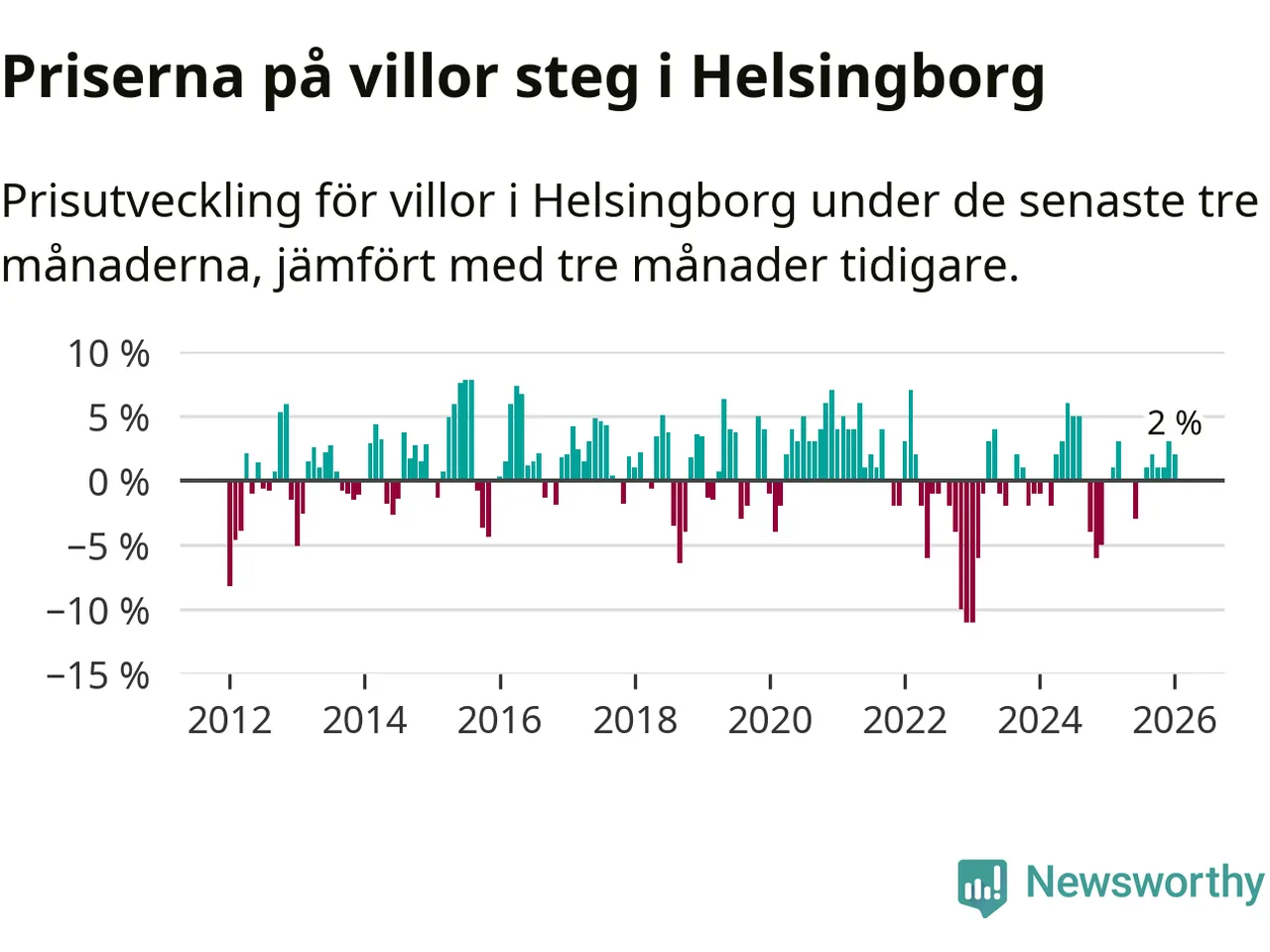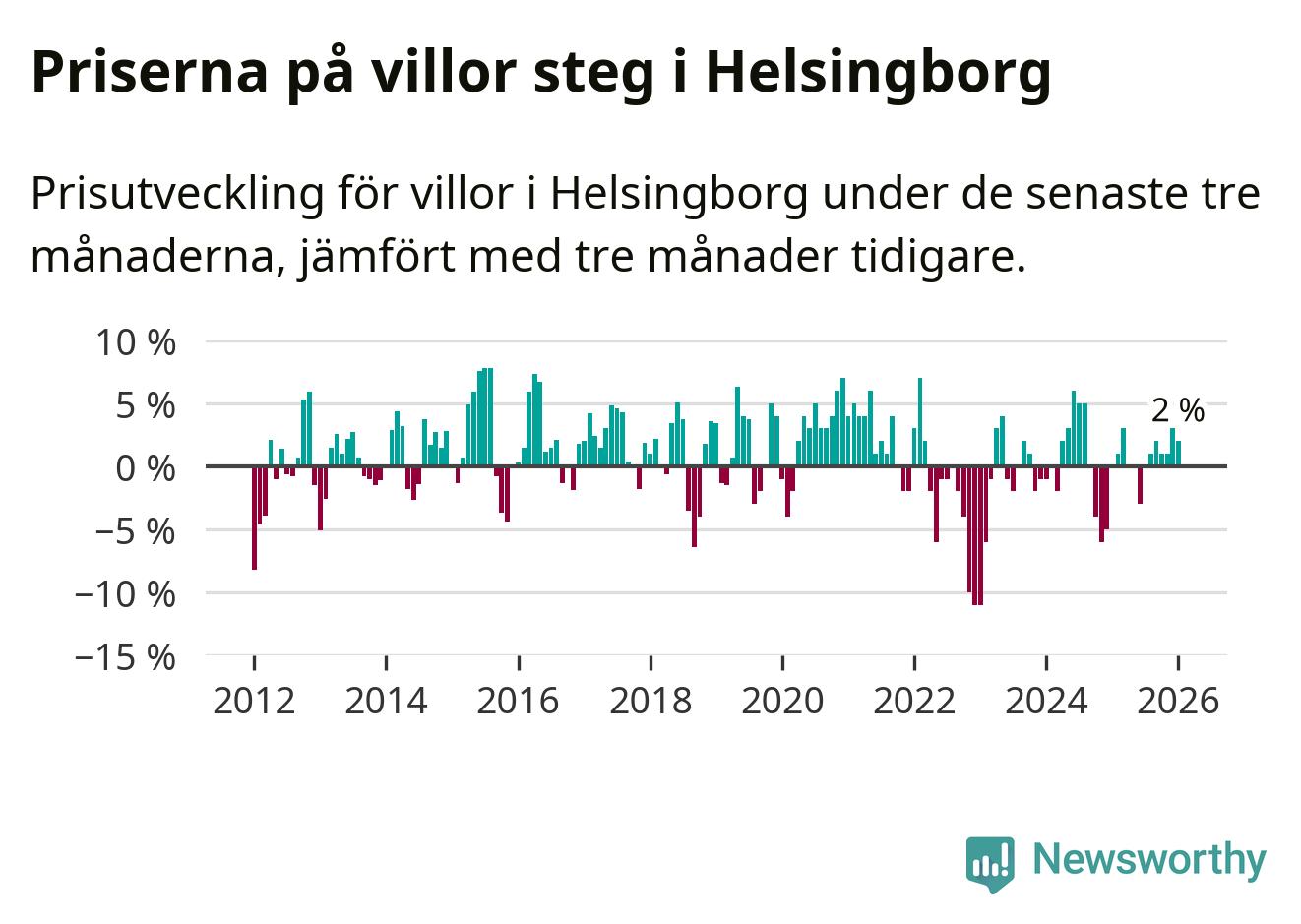 Villapriserna har gått upp i Helsingborgs kommun. Medelpriset på försäljningarna under de senaste tre månaderna visar på en uppgång med 2 procent.