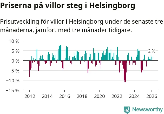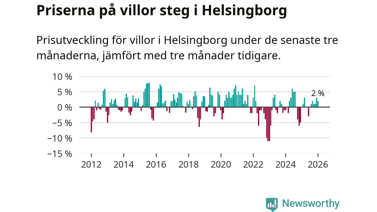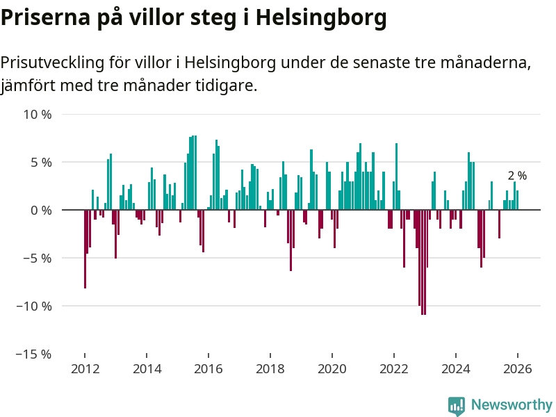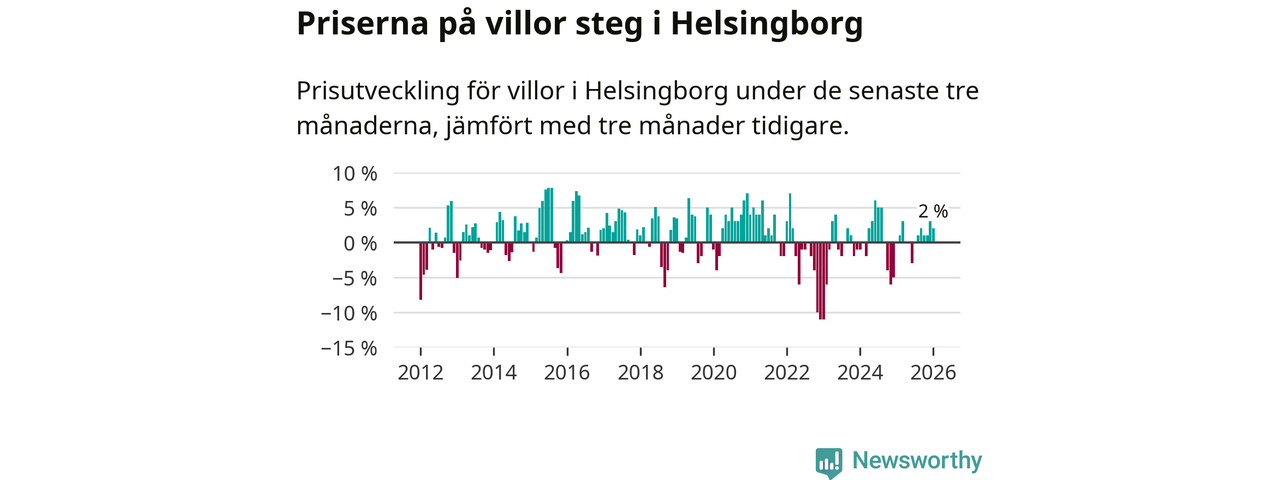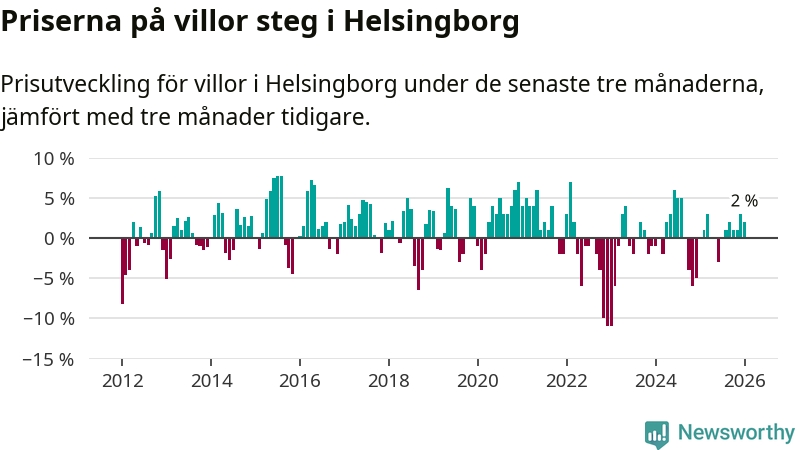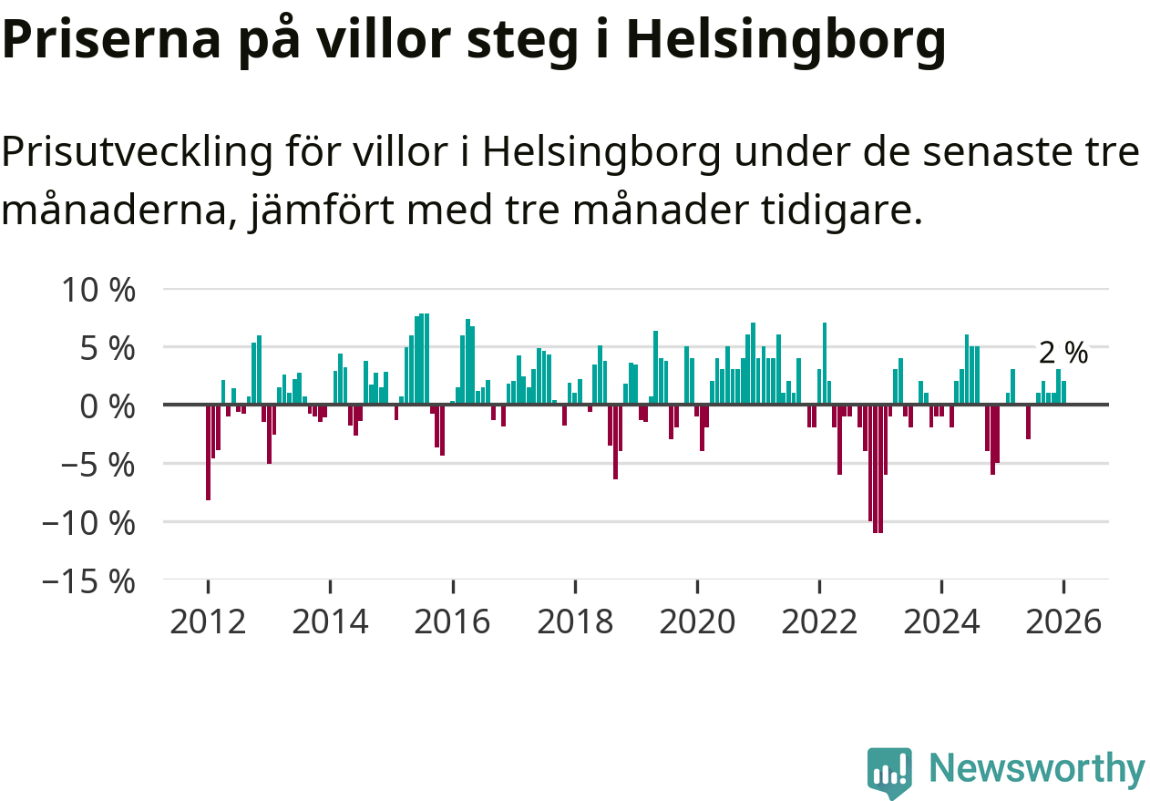 Villapriserna har gått upp i Helsingborgs kommun. Medelpriset på försäljningarna under de senaste tre månaderna visar på en uppgång med 2 procent.