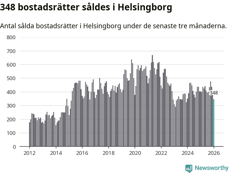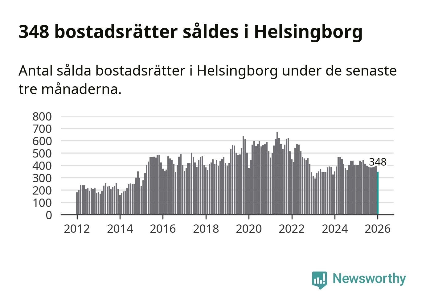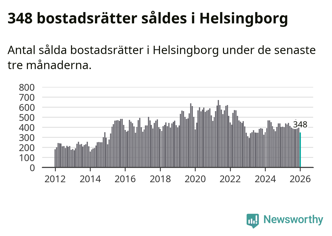 Sammanlagt såldes 348 bostadsrätter i Helsingborgs kommun mellan november och januari till ett genomsnittligt pris på 2,2 miljoner kronor. I fjol gjordes 404 affärer vid den här tiden på året.