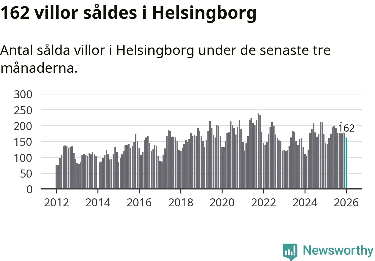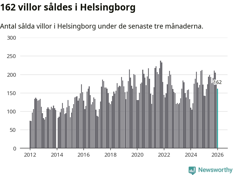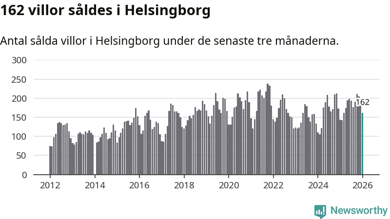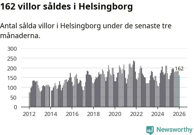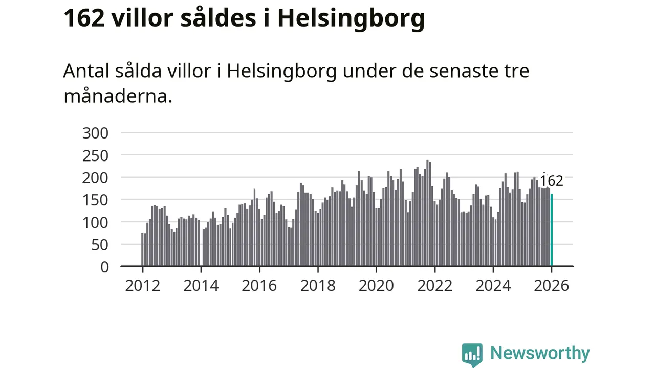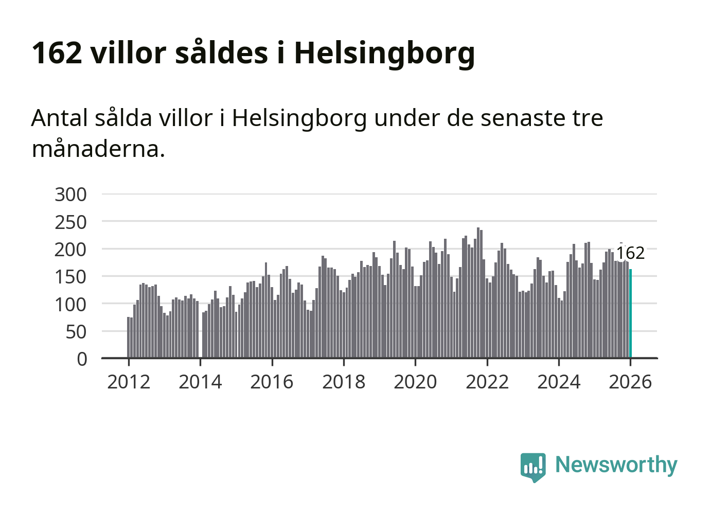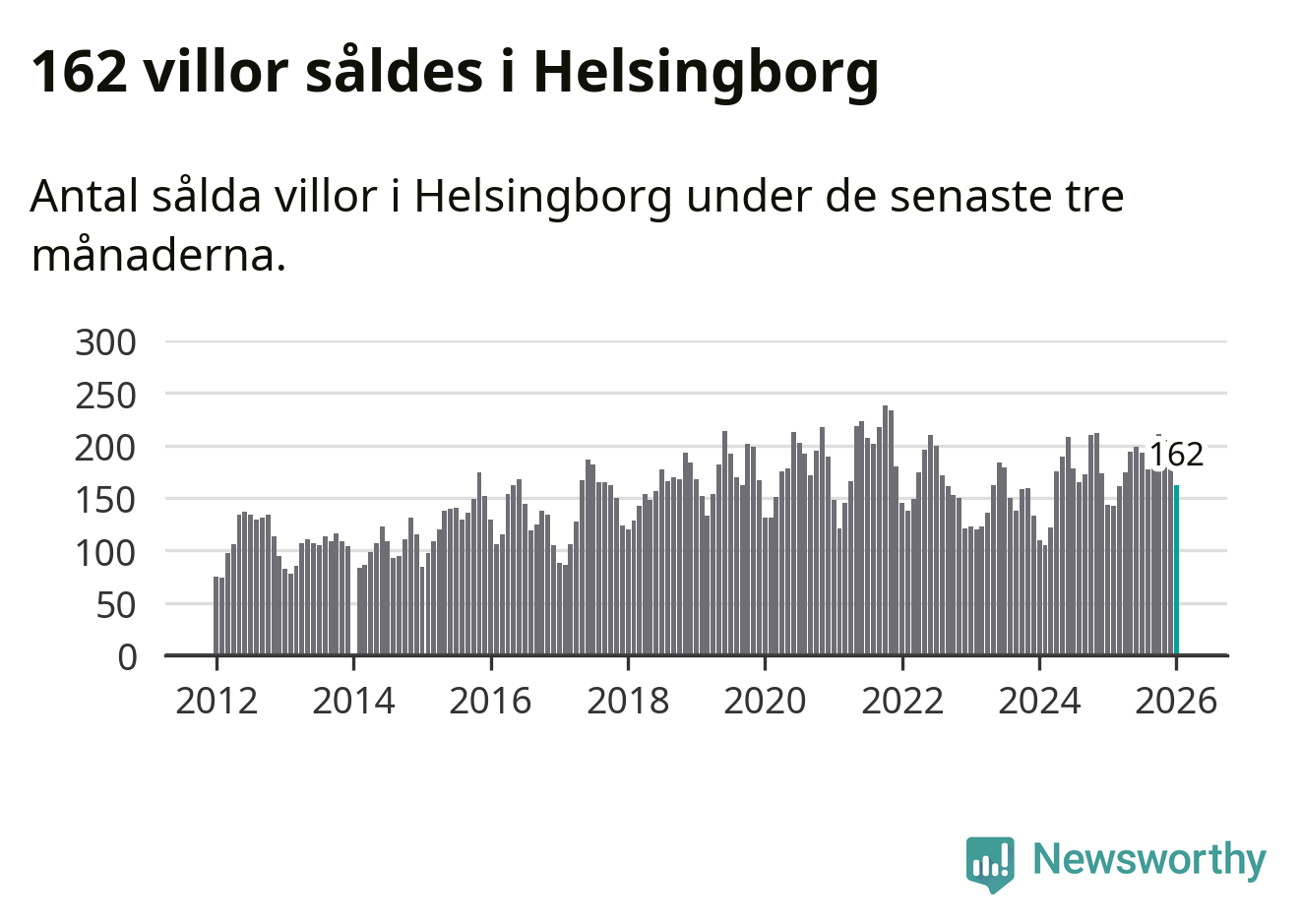Sammanlagt såldes 162 villor i Helsingborgs kommun mellan november och januari till ett genomsnittligt pris på 4,9 miljoner kronor. I fjol gjordes 143 affärer vid den här tiden på året.