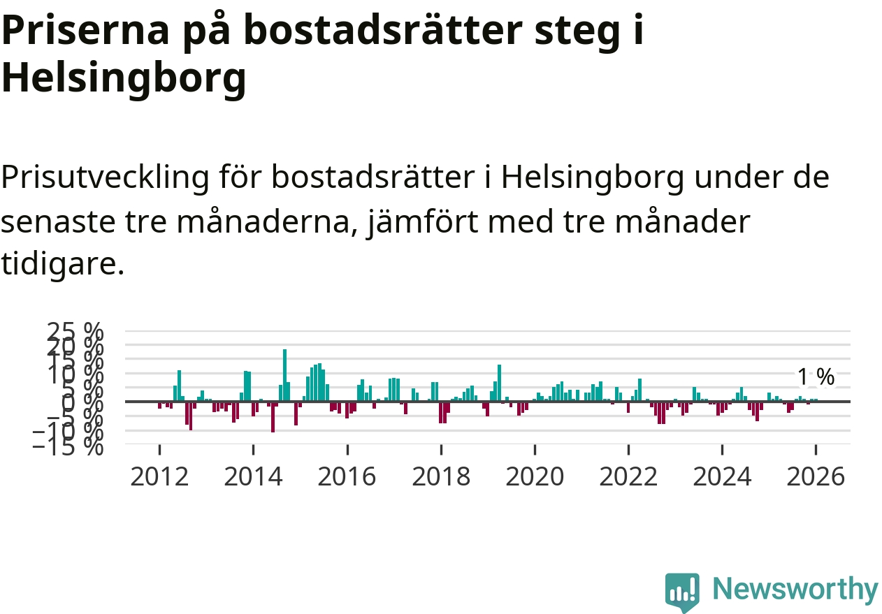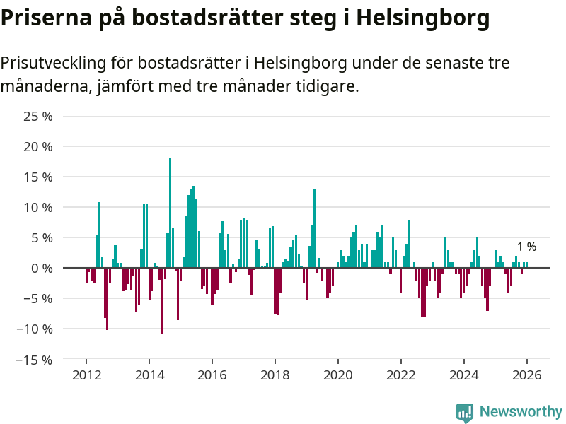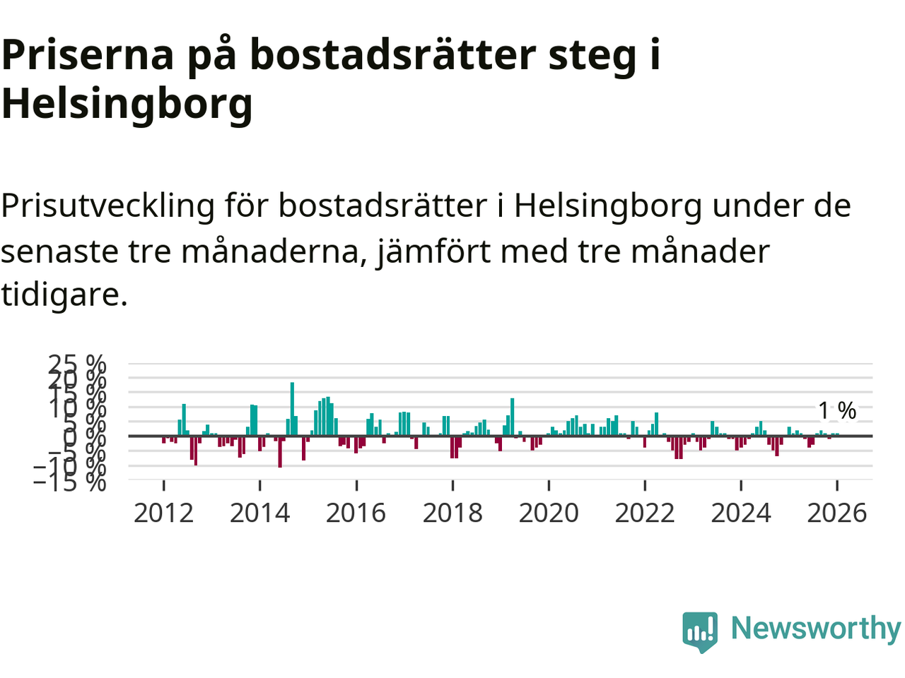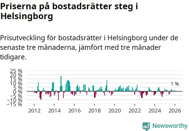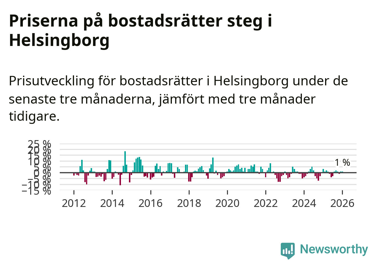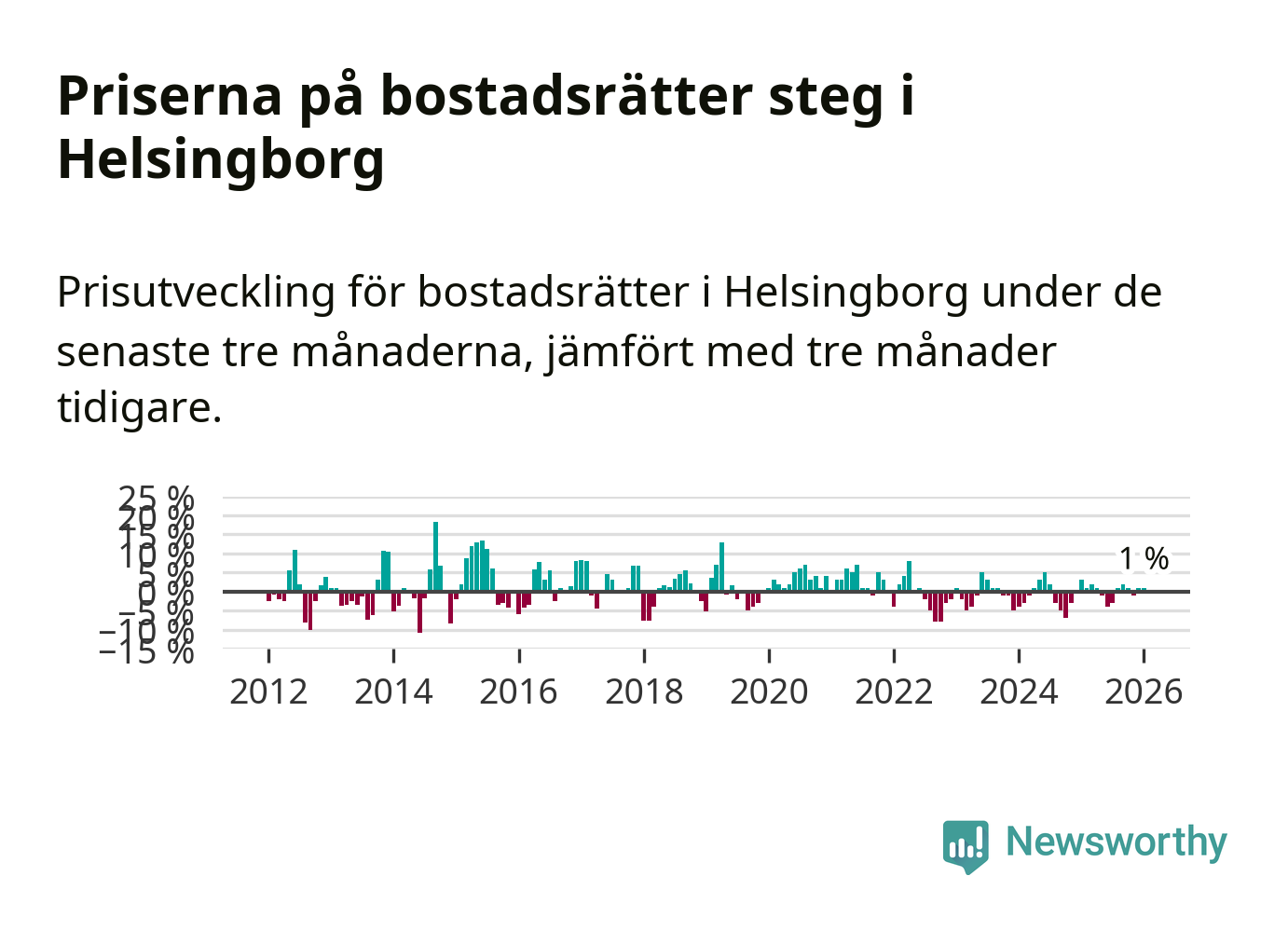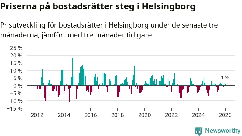 Priserna på bostadsrätter har gått upp i Helsingborgs kommun. Medelpriset på försäljningarna under de senaste tre månaderna visar på en uppgång med 1 procent.